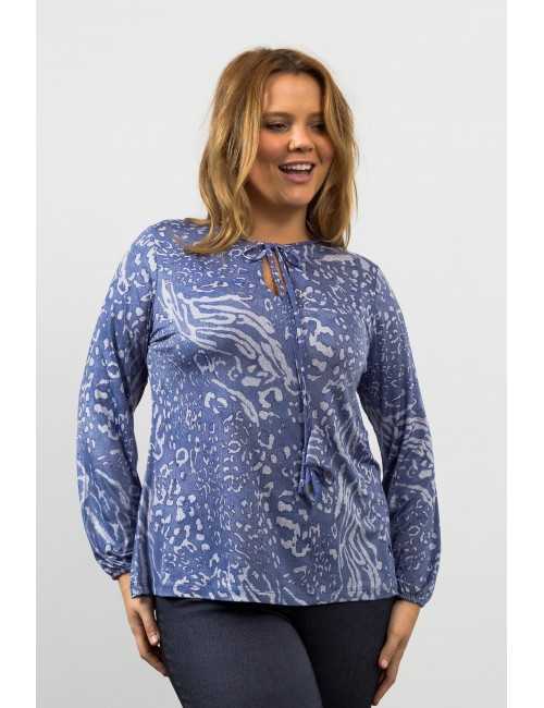 Pull en maille imprimée, manches longues avec élastique. Encolure ronde avec ouverture. Collection : Printemps Été Modèle : Taille 1,70m et porte la taille 2XL.