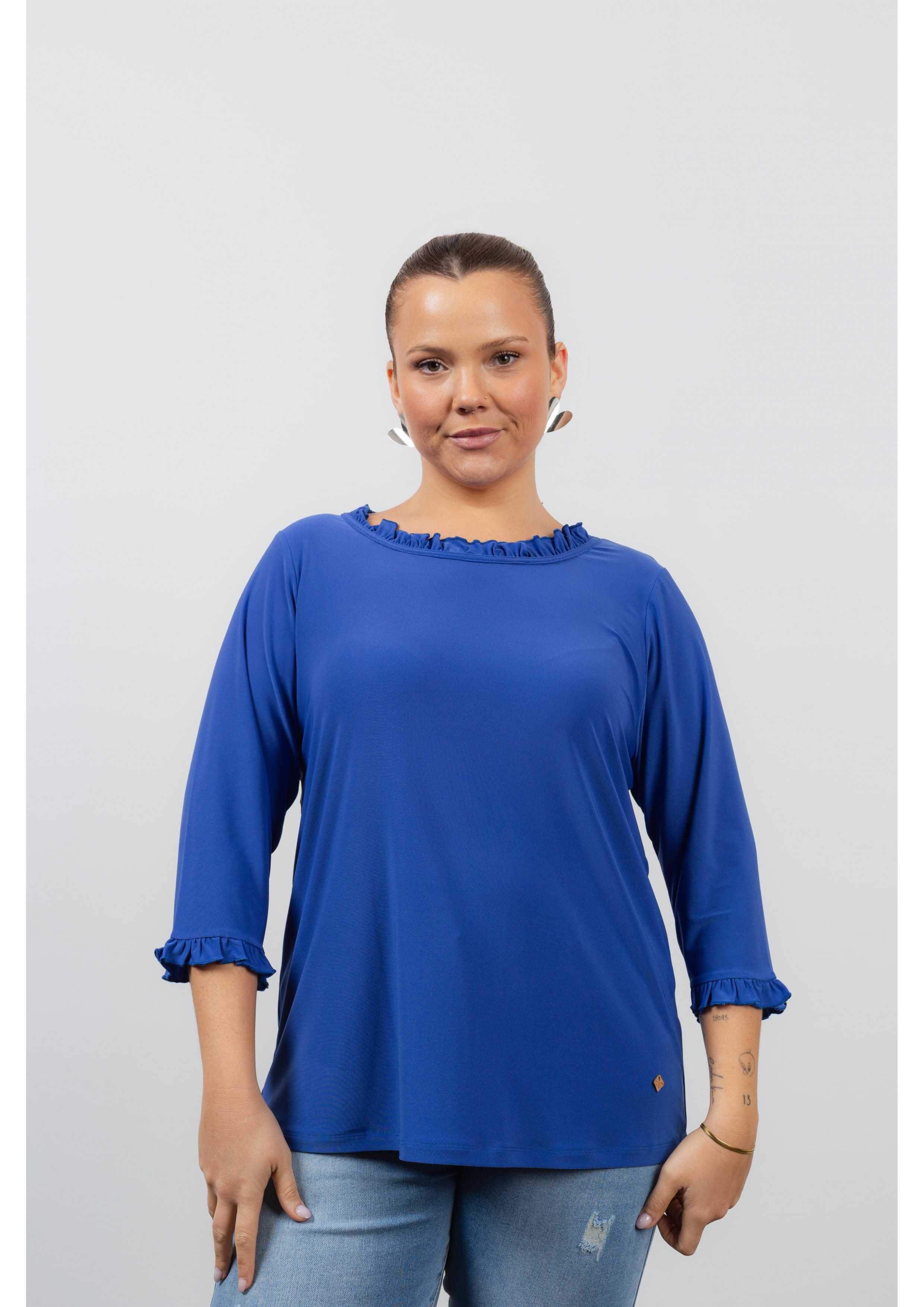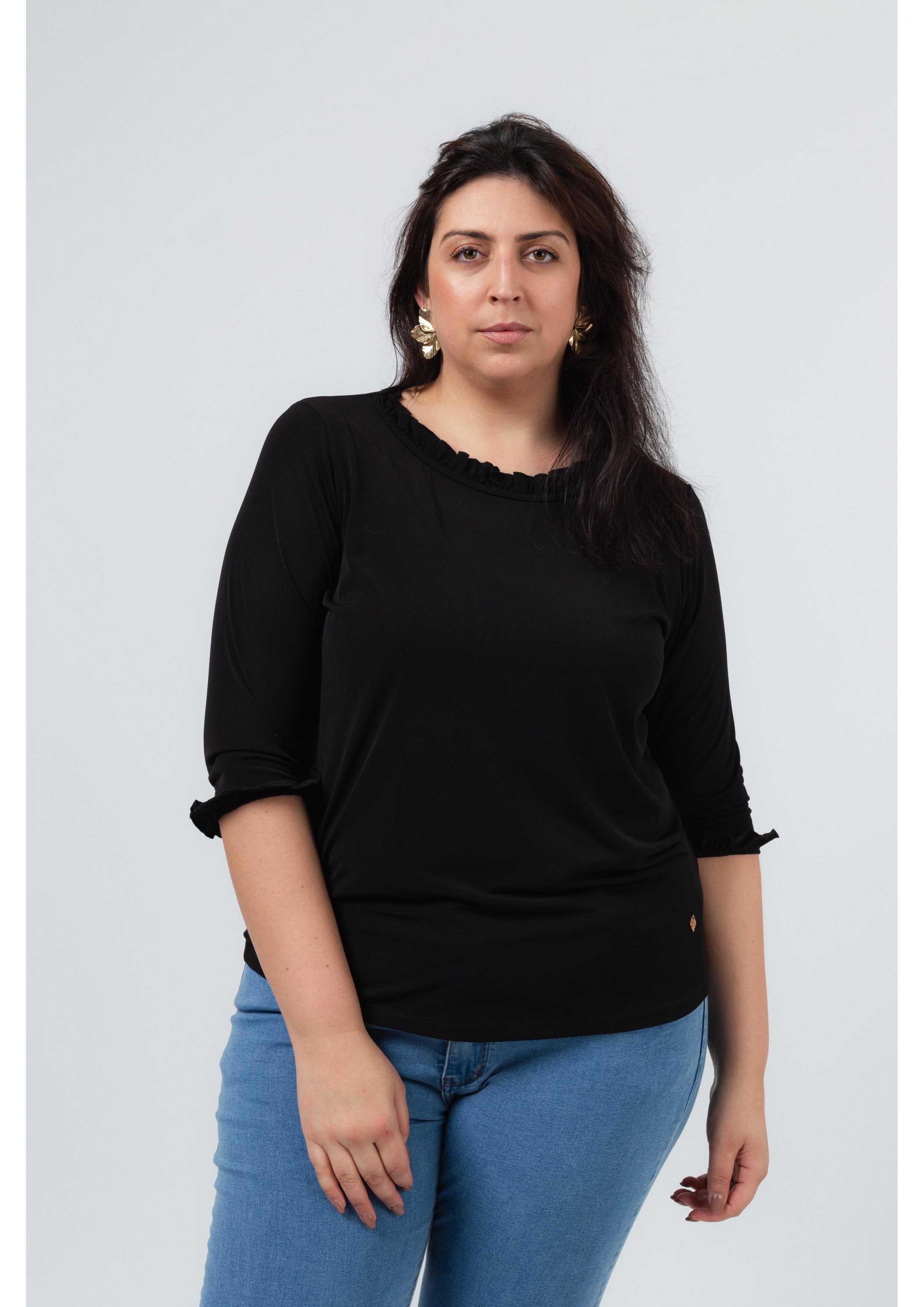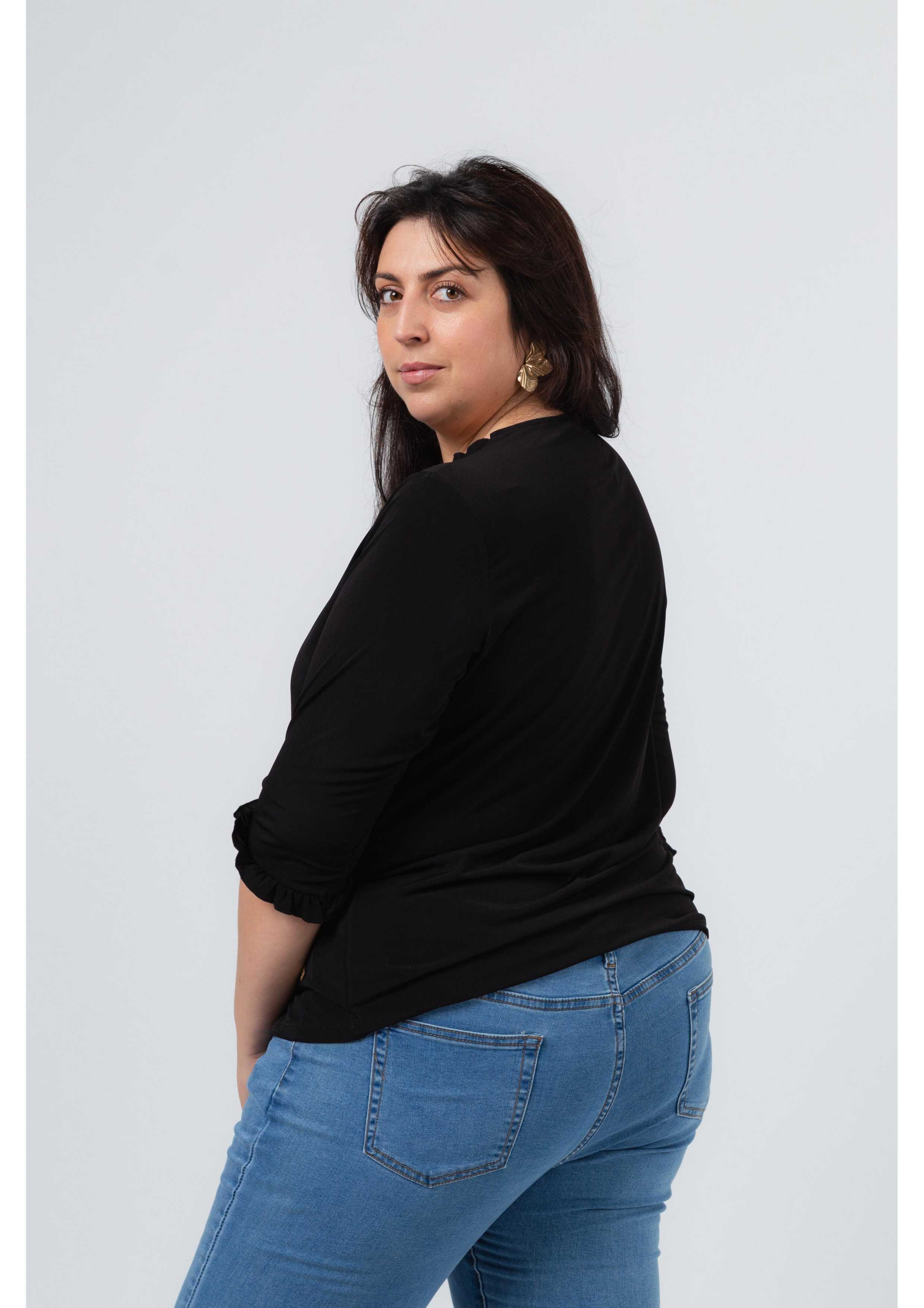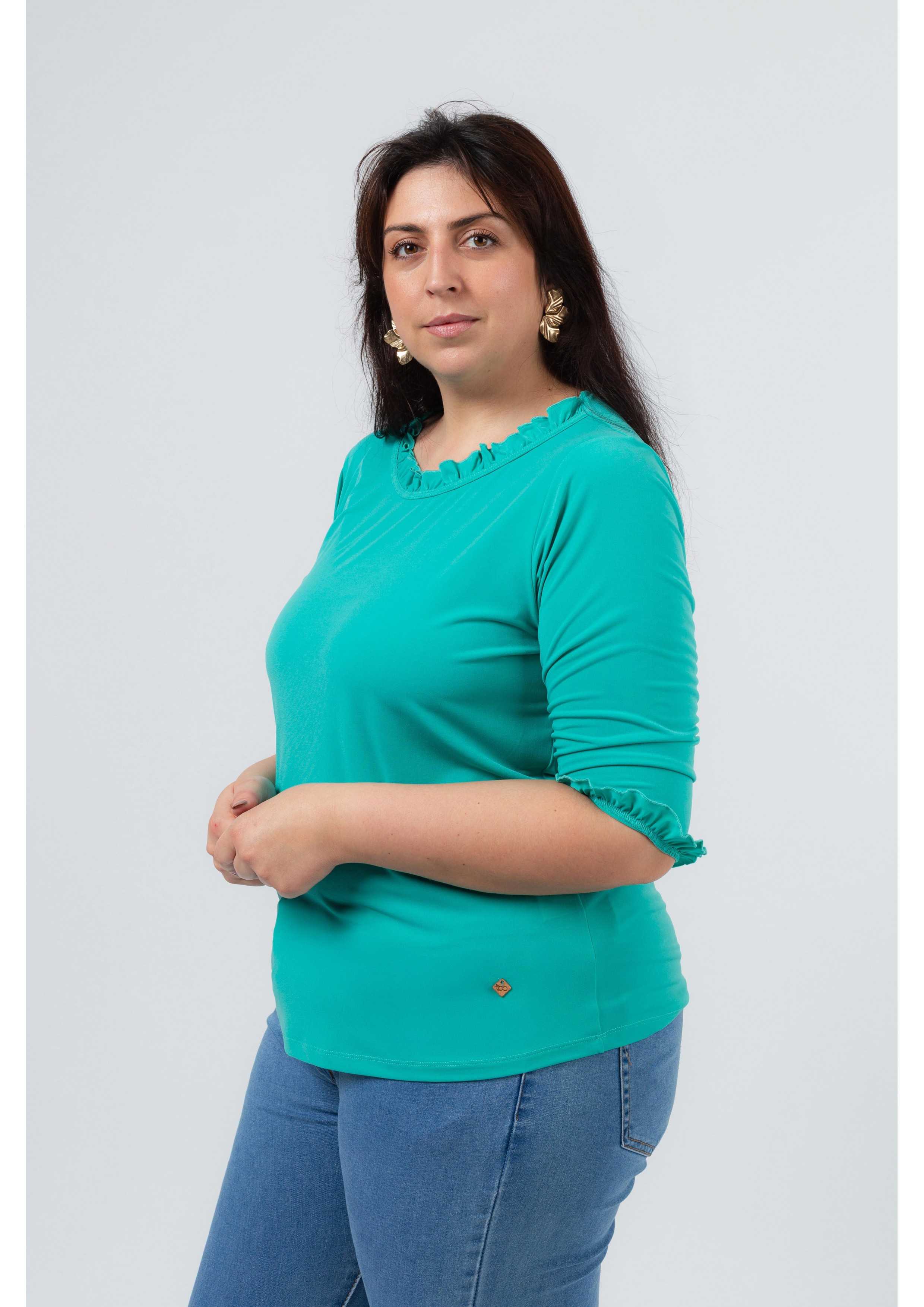 Pull en maille unie avec manches 3/4, décolleté rond avec volant uniquement à l'avant et sur les manches. Collection : Printemps Été Disponible en Grandes Tailles Produit de conception et fabrication propre. Nous sommes une marque de confection de vêtements avec plus de 50 ans d'expérience Modèle : Taille 1,70 m et porte la taille 2XL. Composition : 94% Polyester 6% Élasthanne