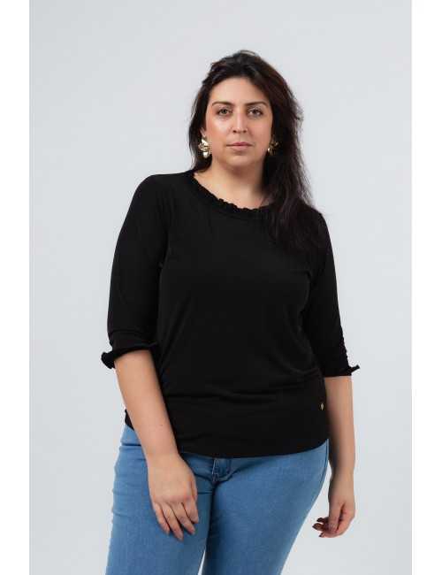 Pull en maille unie avec manches 3/4, décolleté rond avec volant uniquement à l'avant et sur les manches. Collection : Printemps Été Modèle : Taille 1,70 m et porte la taille 2XL |
