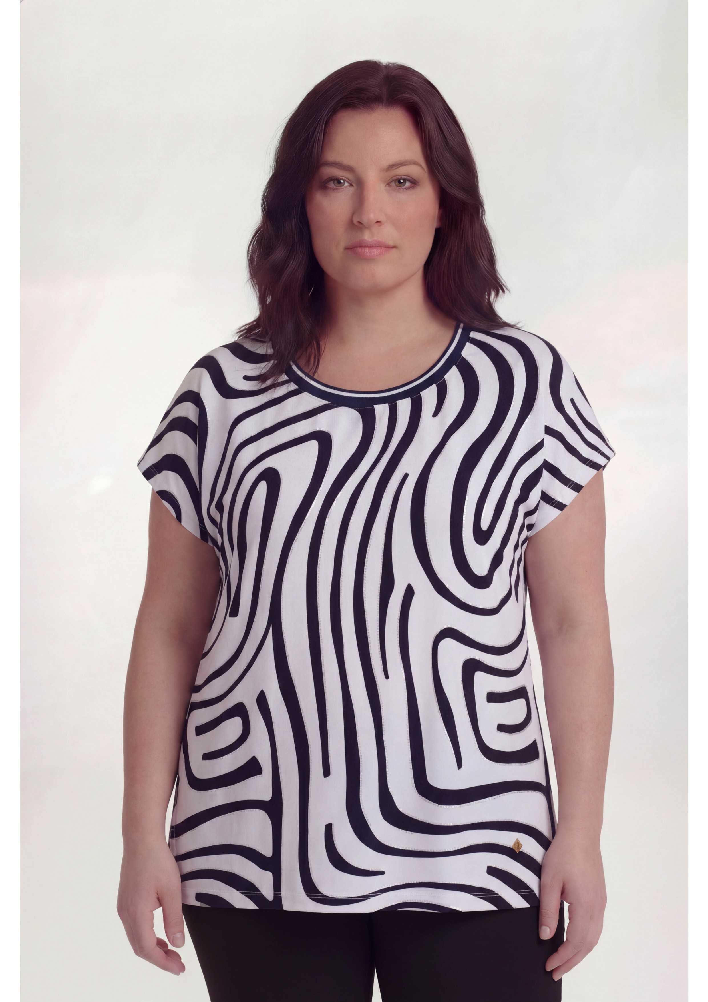 Pull en maille imprimée, tons bleus, manches tombantes avec encolure ronde, bande en côte à l'encolure devant. Fentes latérales. Disponible en Grandes Tailles Produit de conception et fabrication propre. Nous sommes une marque de confection de vêtements avec plus de 50 ans d'expérience