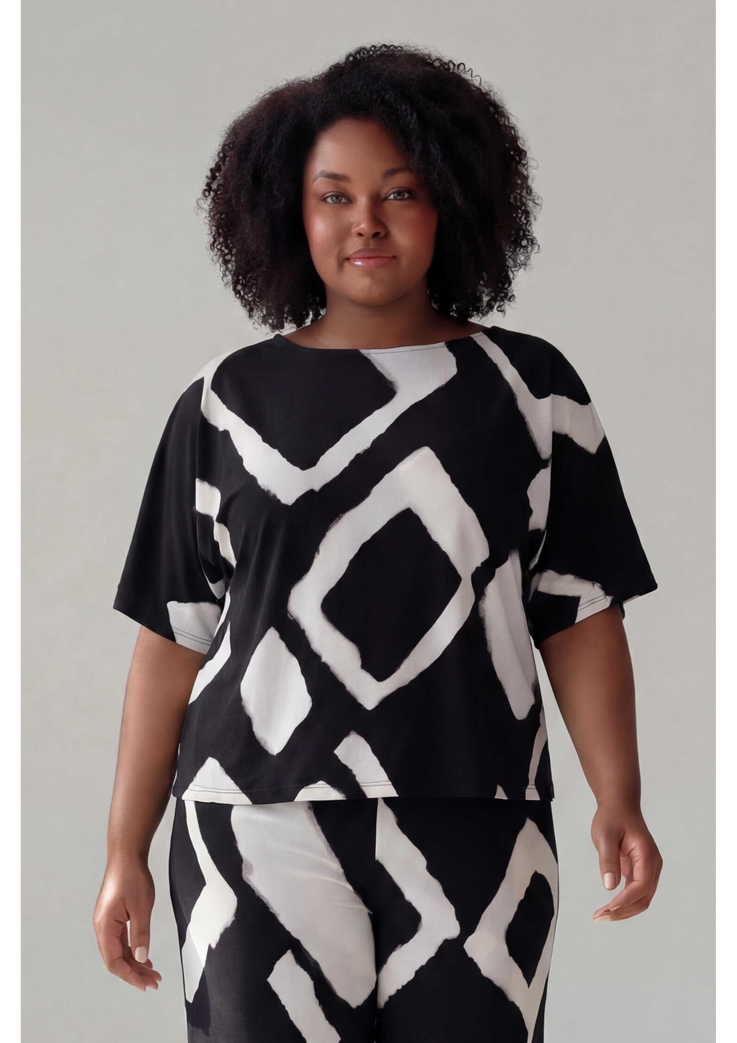 Pull en maille imprimée, manches chauve-souris, découpe au dos, encolure légèrement bateau.