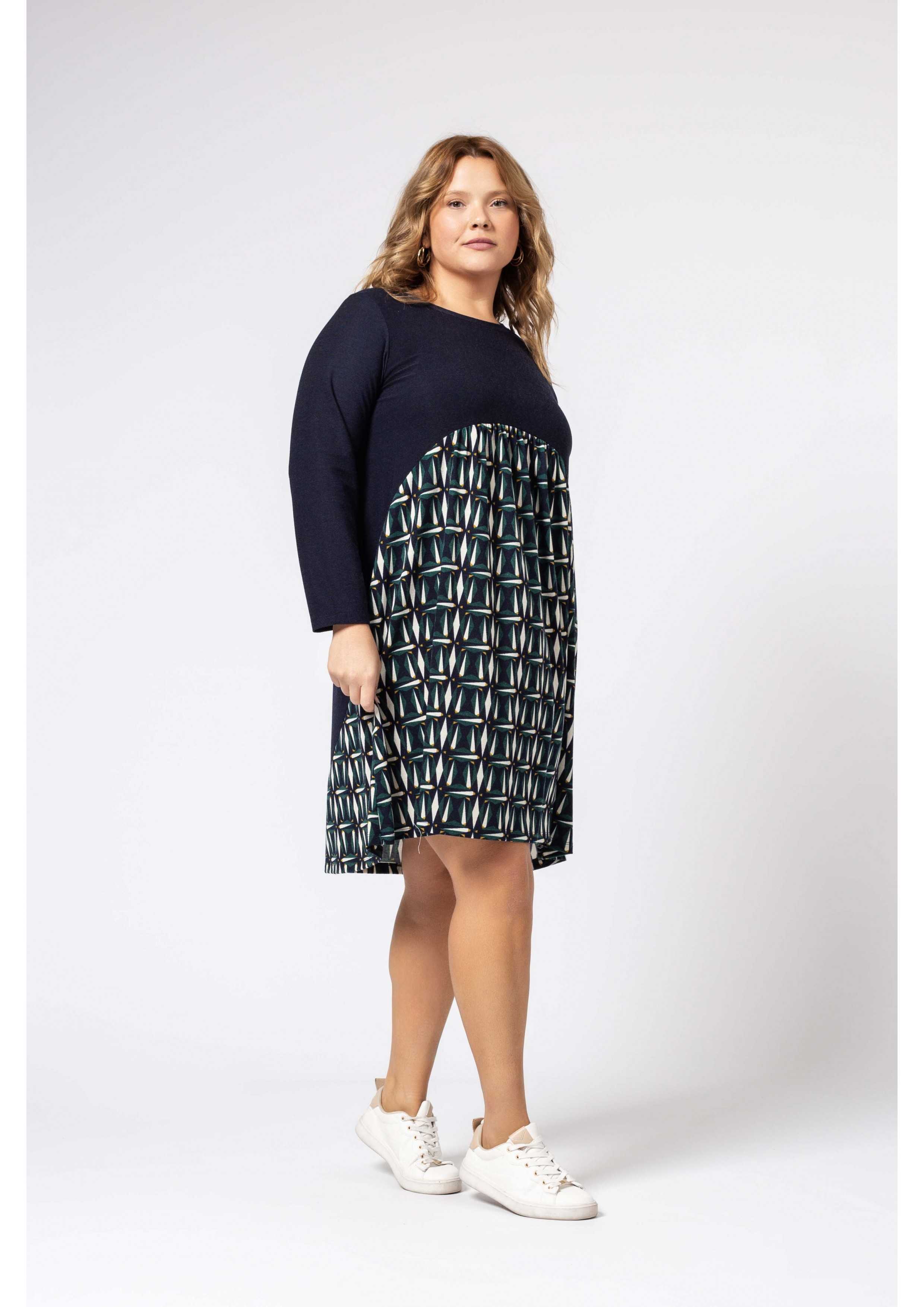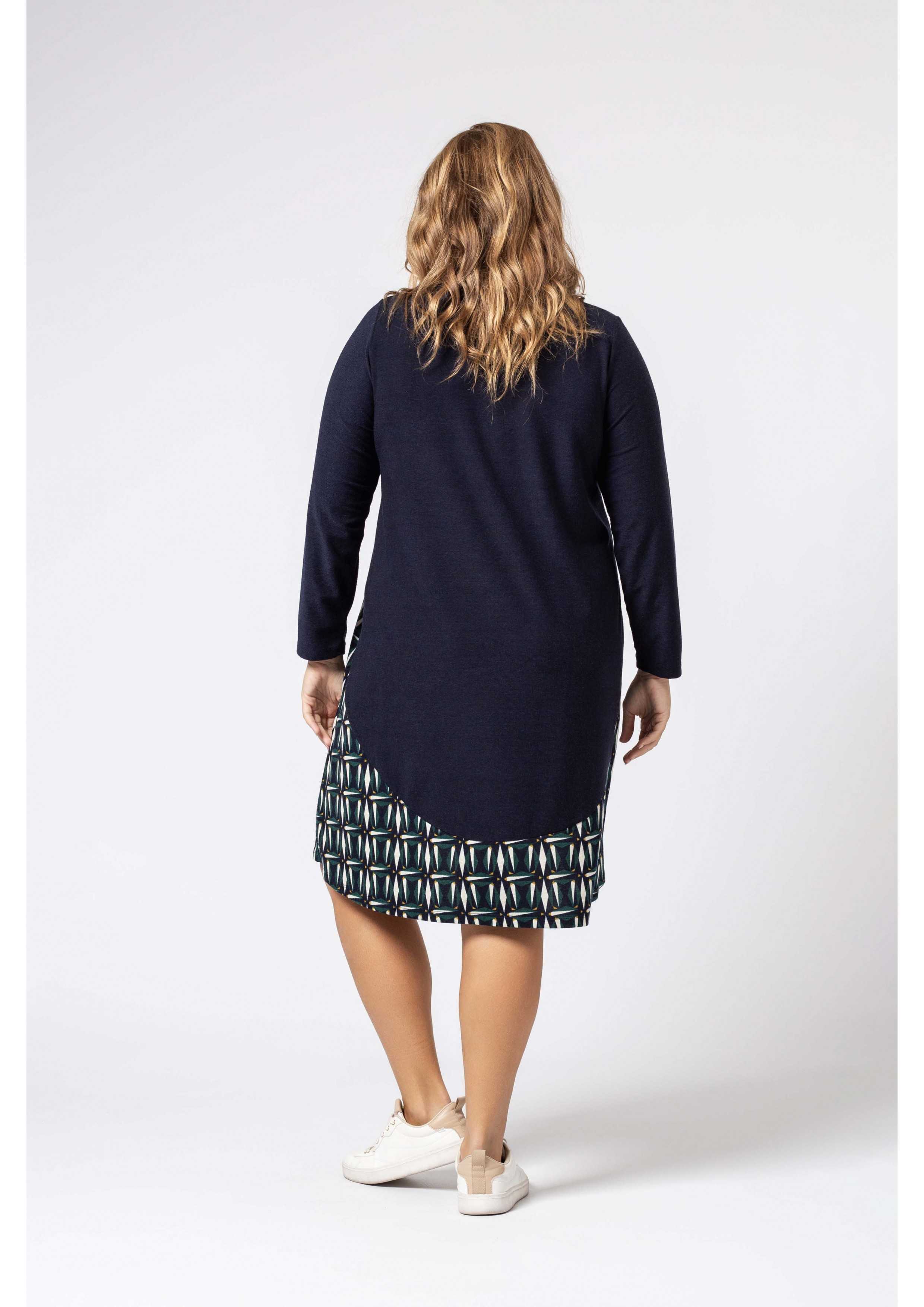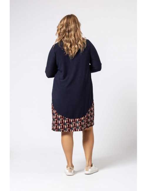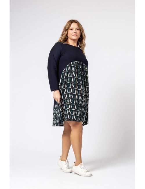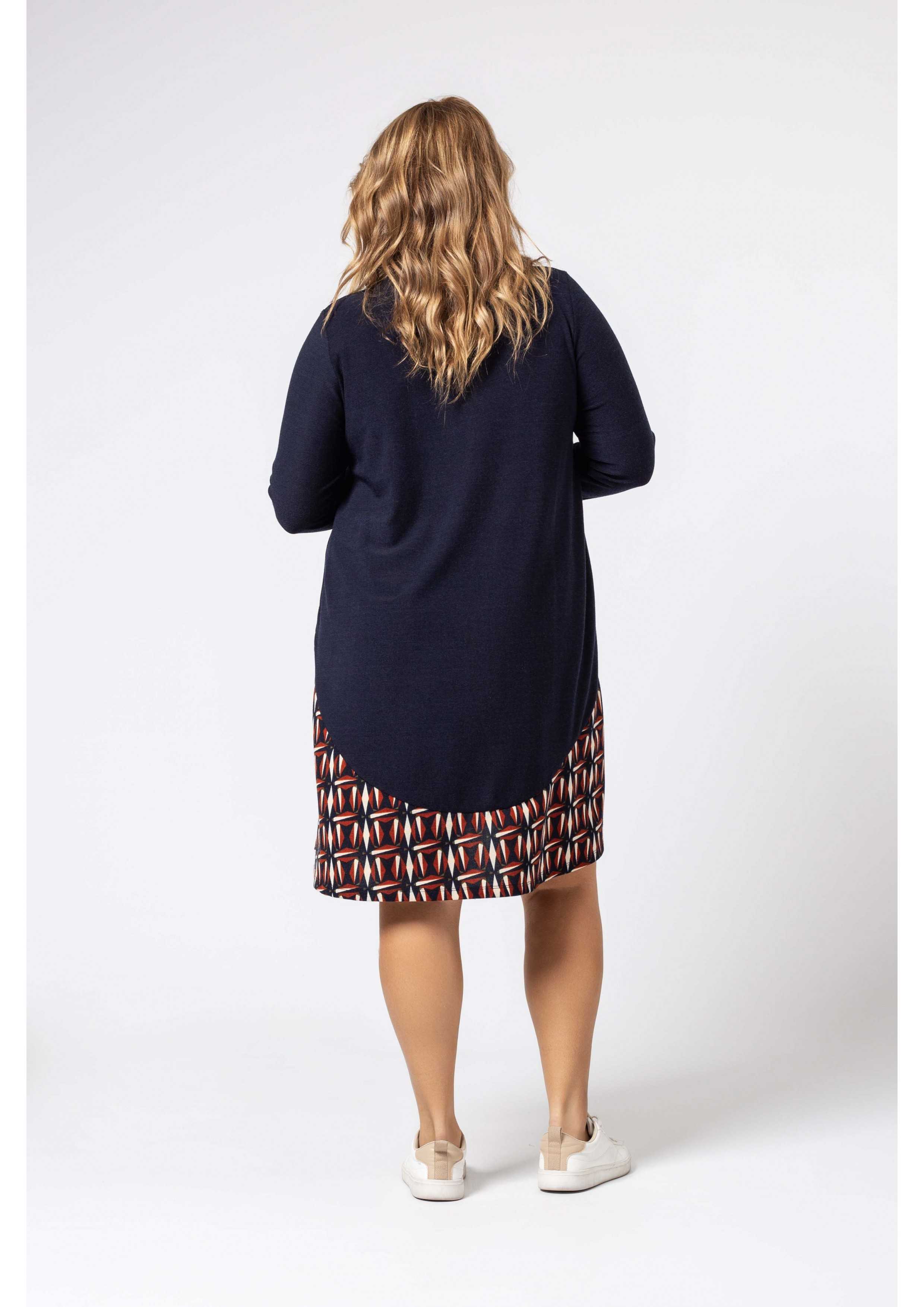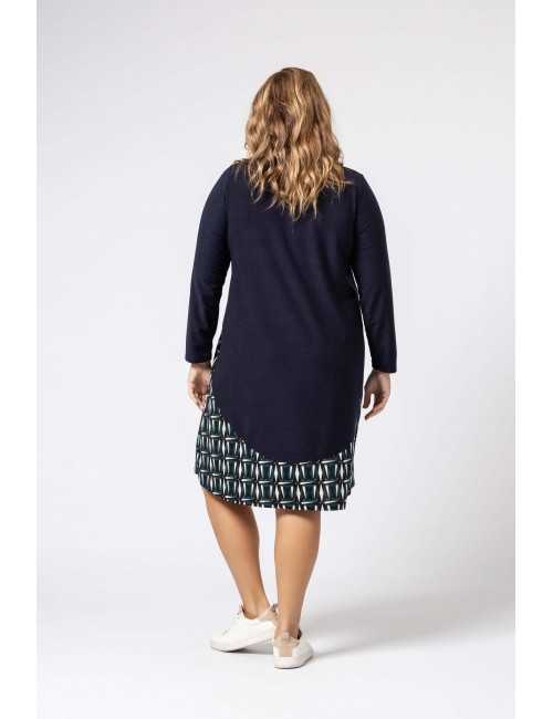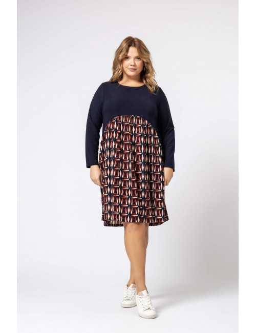 Robe en maille, corps et manches unis, jupe à motifs. Décolleté rond Collection : Automne Hiver Disponible en Grandes Tailles Produit de conception et fabrication propre. Nous sommes une marque de confection de vêtements avec plus de 50 ans d'expérience Modèle : Taille 1,70 m et porte la taille 2XL. Composition : 94% Polyester 6% Élasthanne
