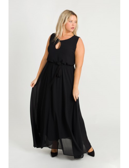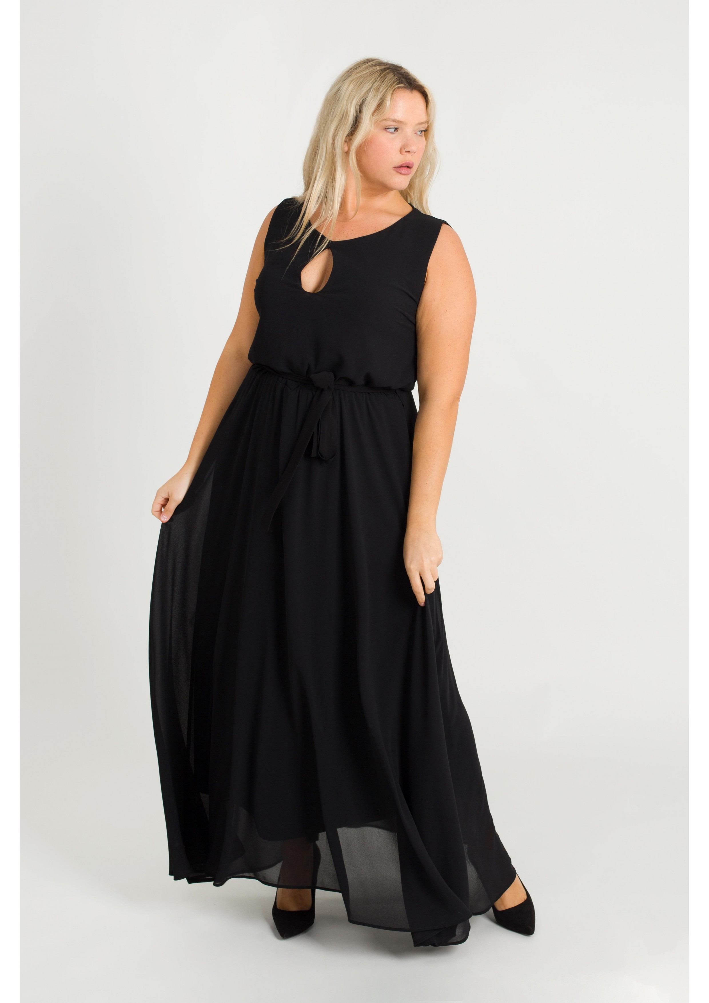 Robe longue en tissu uni, décolleté rond avec ouverture goutte, jupe évasée. Collection : Printemps Été Modèle : Taille 1,70m et porte la taille 2XL en noir et rose fuchsia.