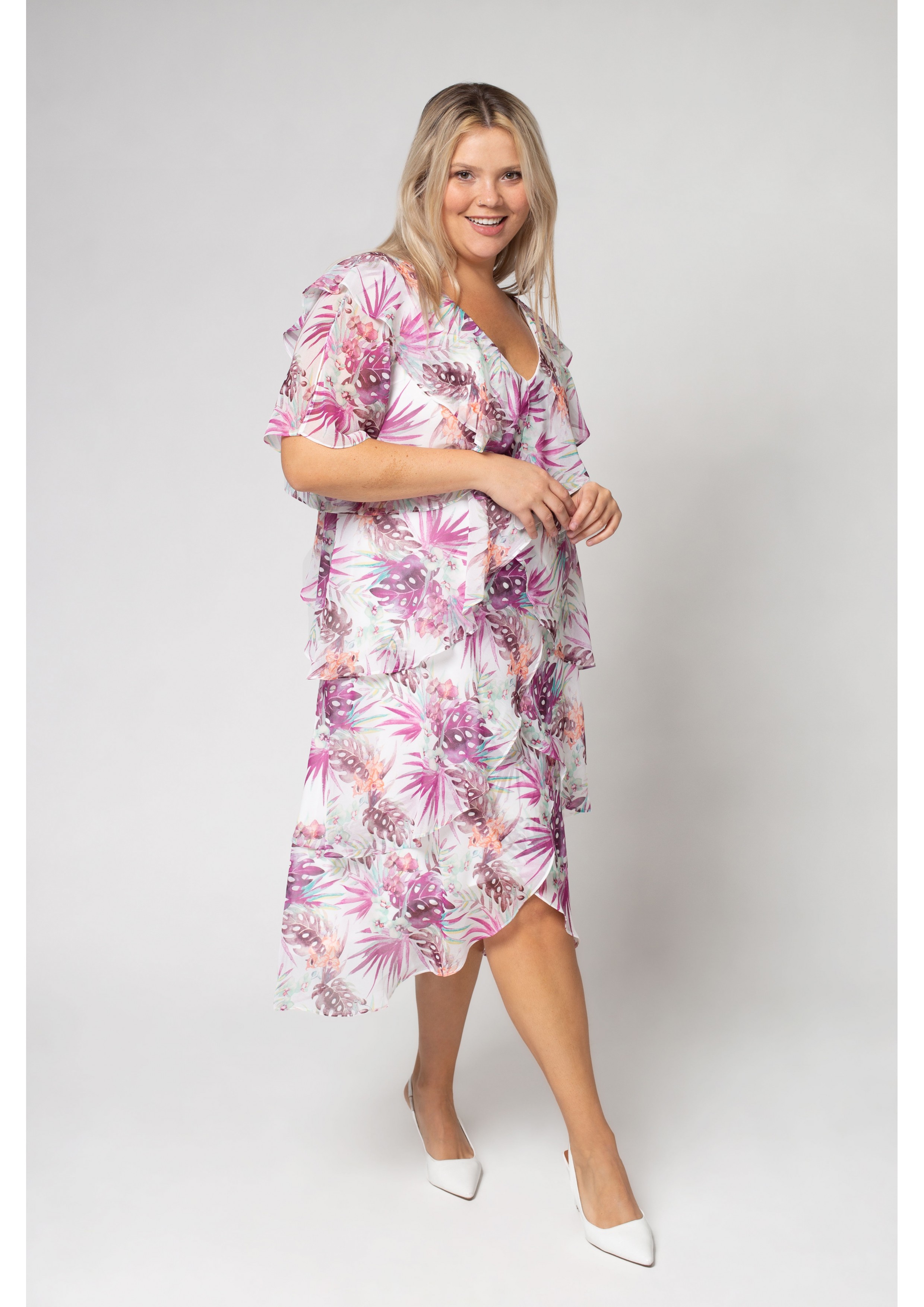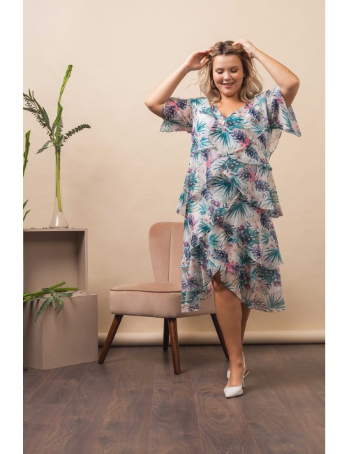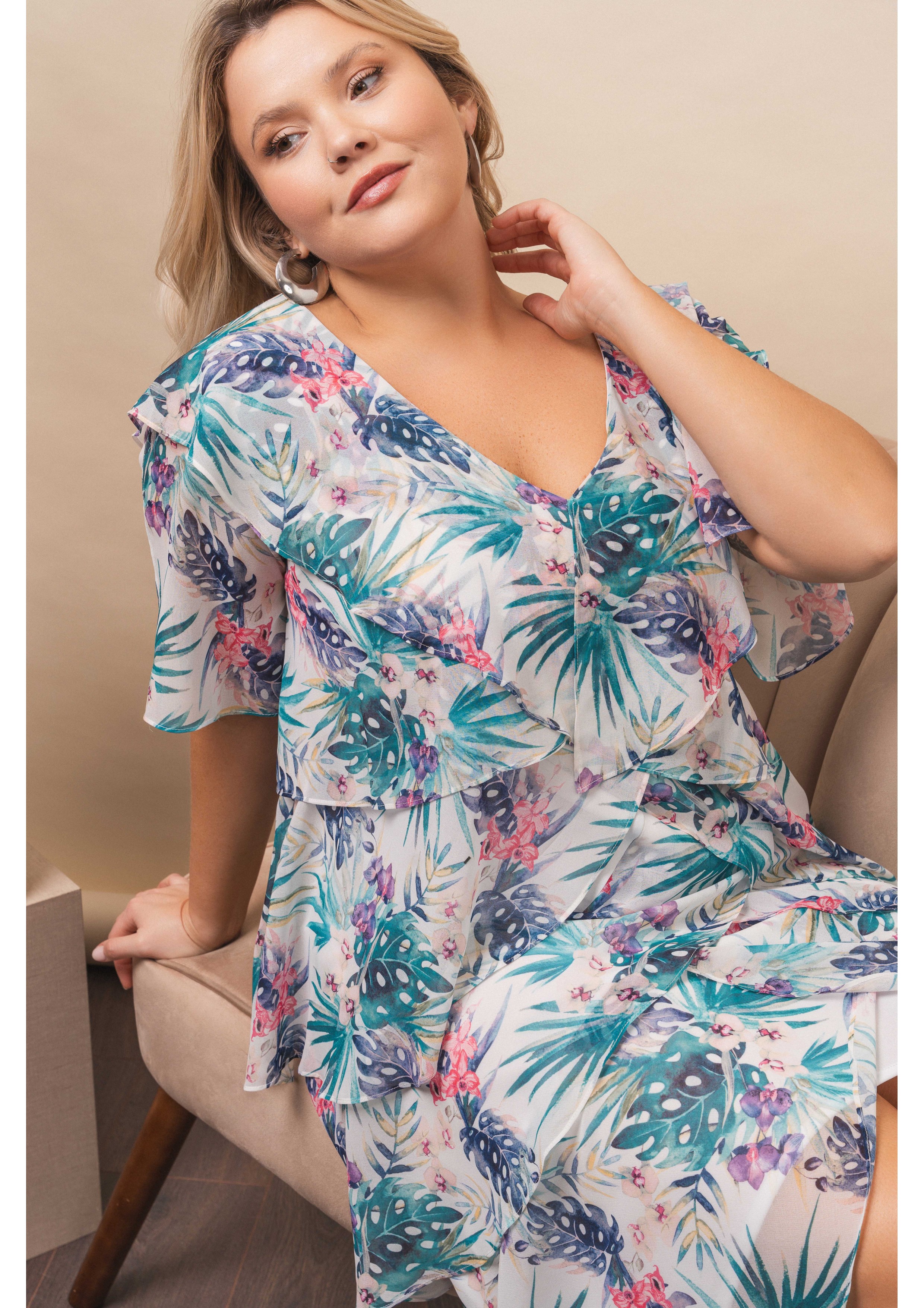 Robe en tissu léger fluide, avec imprimé feuillage, décolleté en V, manches à volants. Collection : Printemps Été Modèle : Taille 1,70 m et porte la taille 2XL.