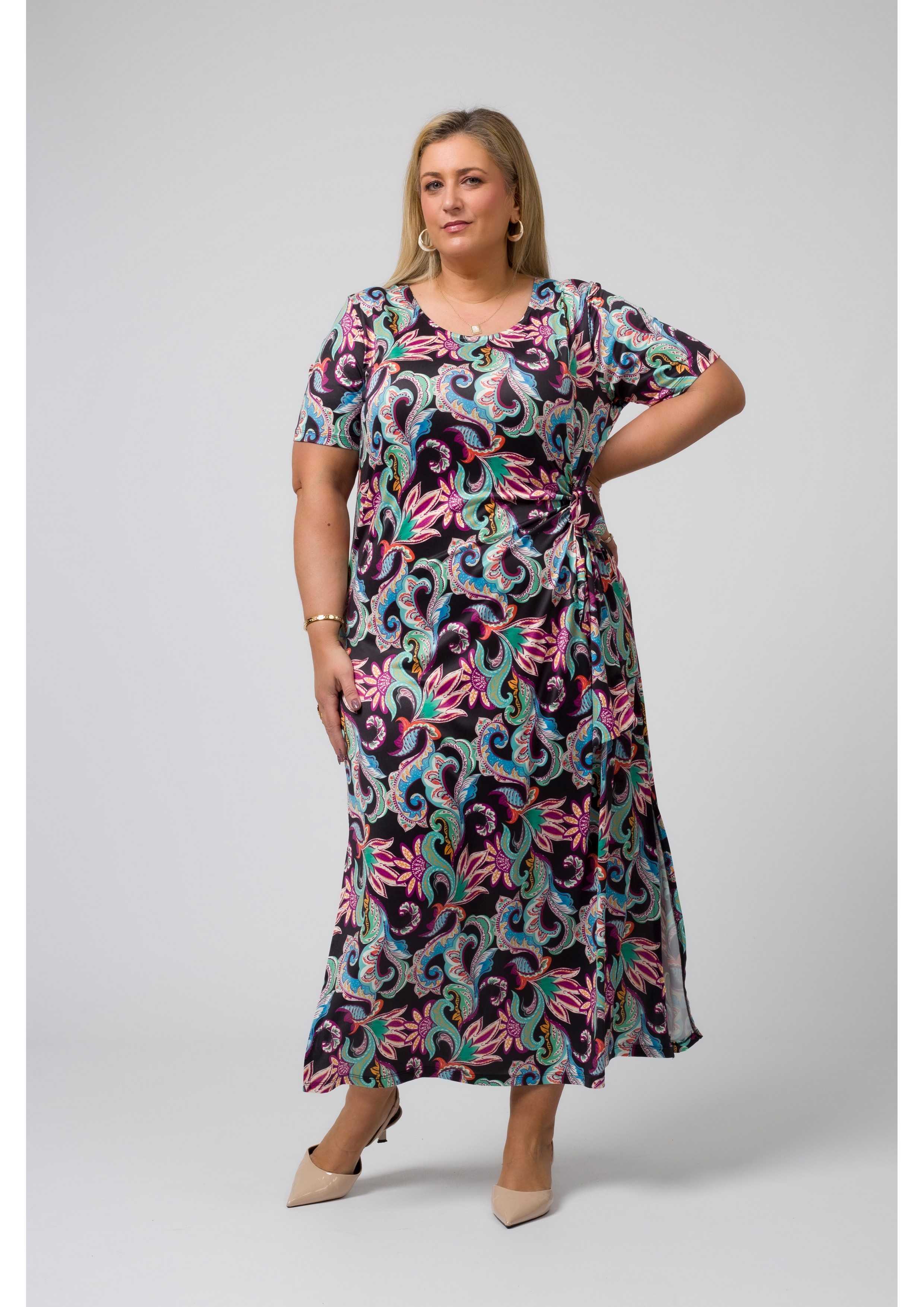 Robe en maille imprimée avec décolleté rond et fentes sur les côtés et noeud drapé sur le côté. Collection : Printemps Été Disponible en Grandes Tailles Produit de conception et fabrication propres. Nous sommes une marque de confection de vêtements avec plus de 50 ans d'expérience Modèle : Taille 1.65m et porte la taille 3XL. Composition : 96% Polyester 4% Élasthanne