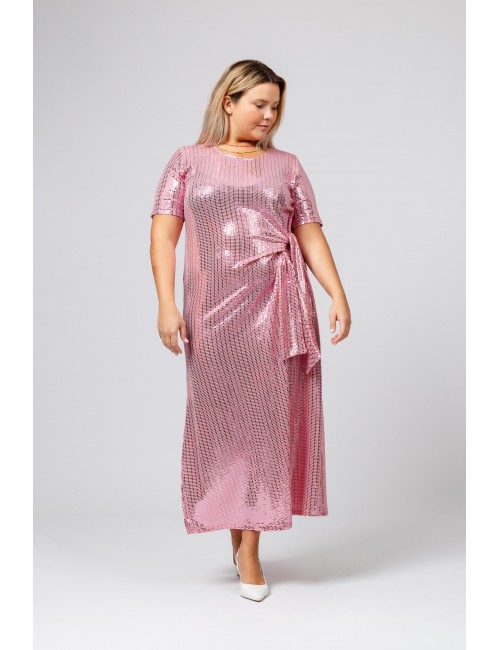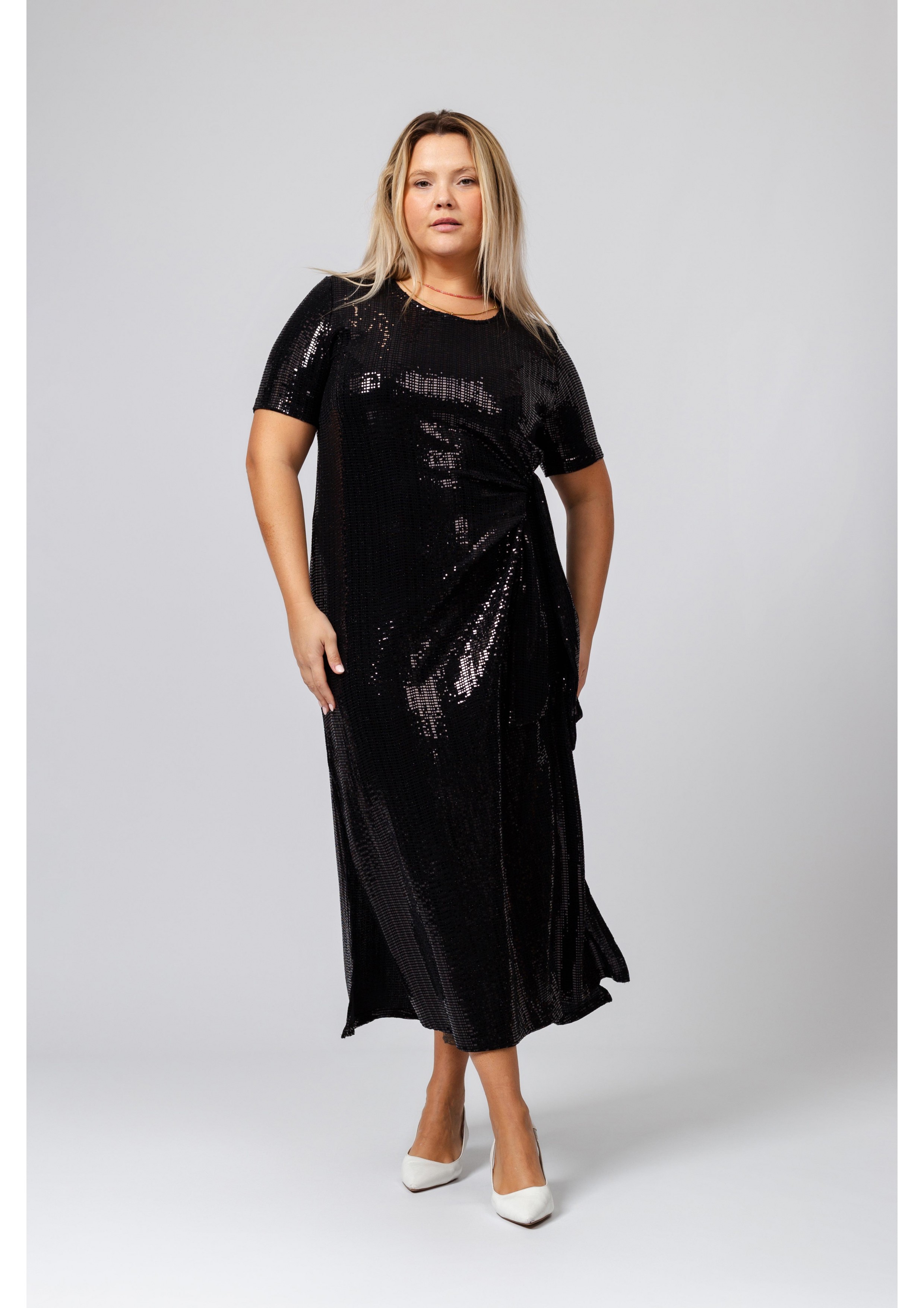 Robe en maille avec effet paillettes en col rond, fentes latérales et nœud drapé sur le côté. Collection : Printemps Été Modèle : Taille 1,70 m et porte la taille 2XL. 80% Nylon 15% Métal 5% Élasthanne