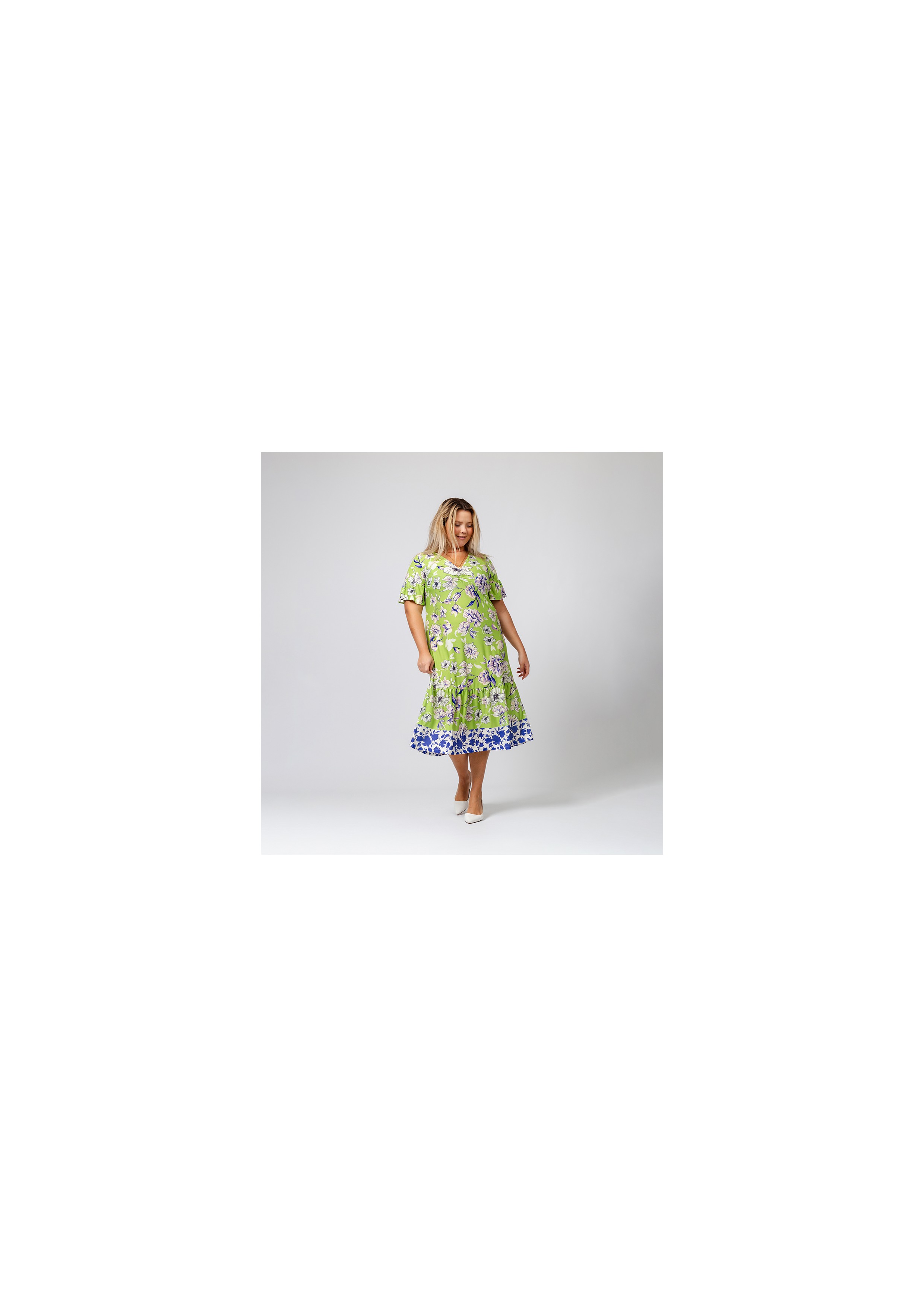 Robe courte en maille imprimée avec décolleté en V drapé. Collection : Printemps Été Modèle : Taille 1,70 m et porte la taille 3XL en vert. Modèle : Taille 1,65 m et porte la taille 4XL en bleu.
