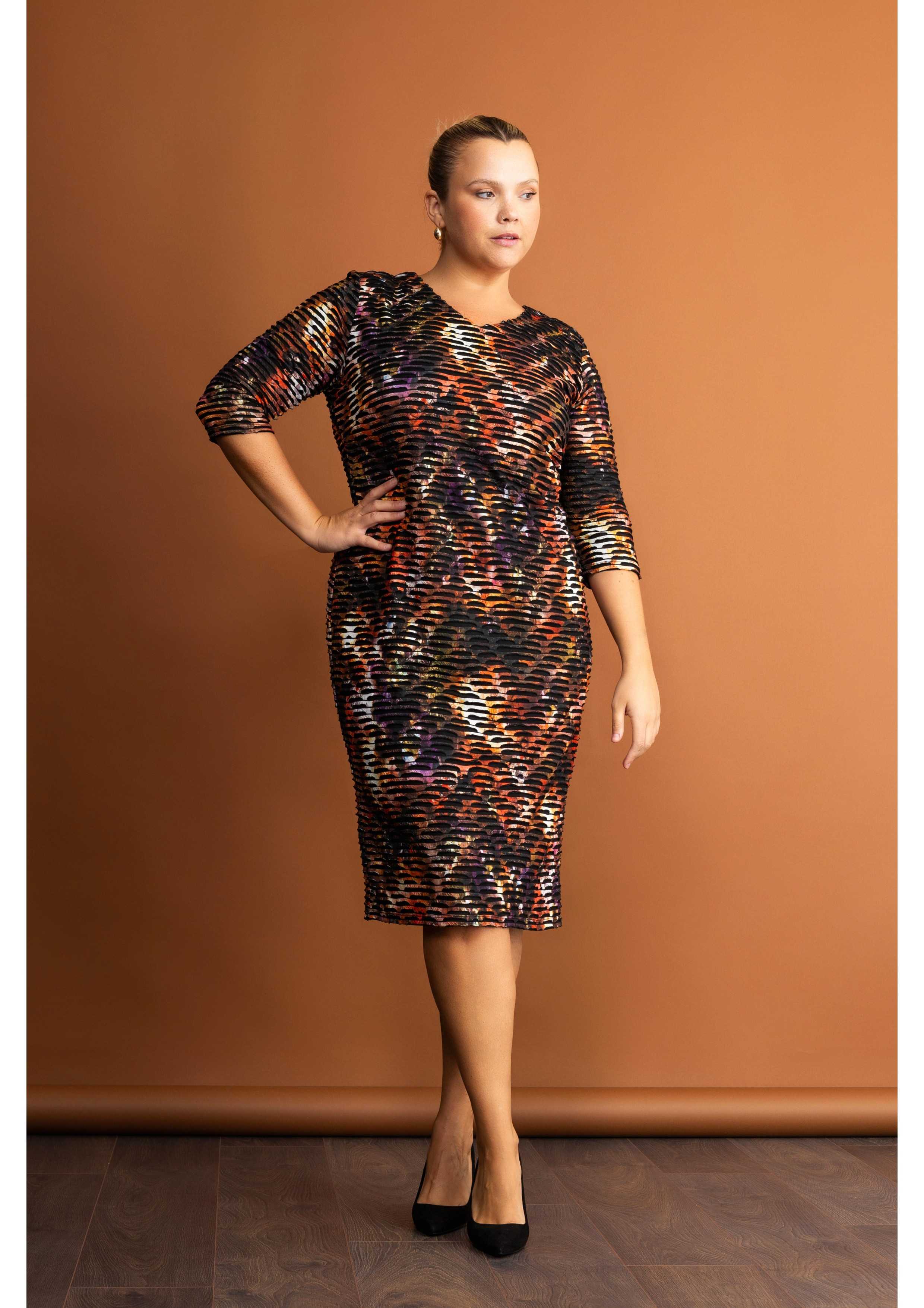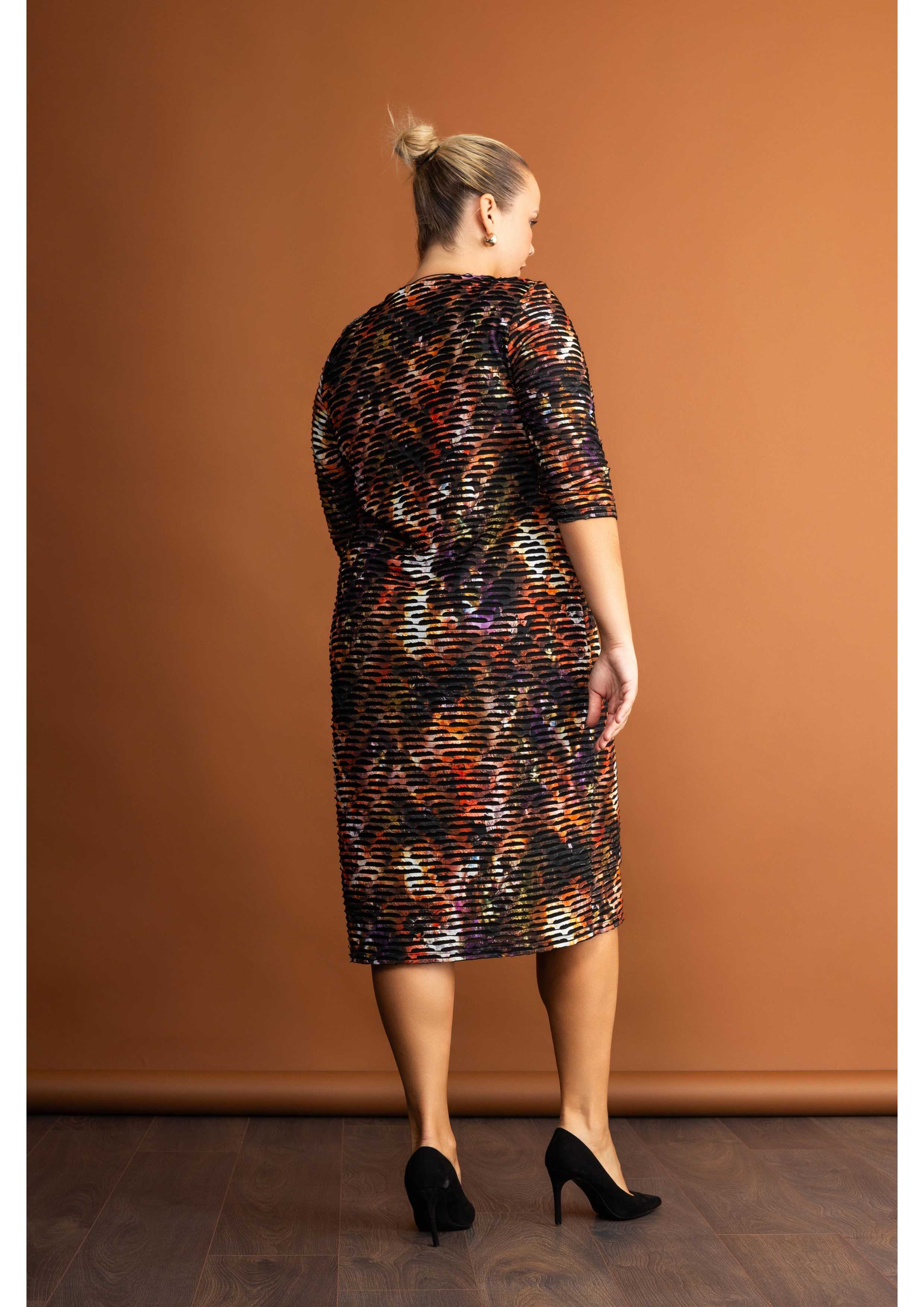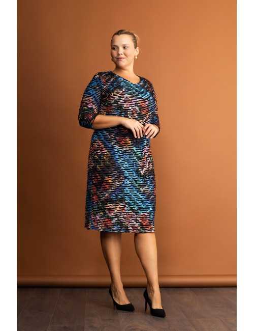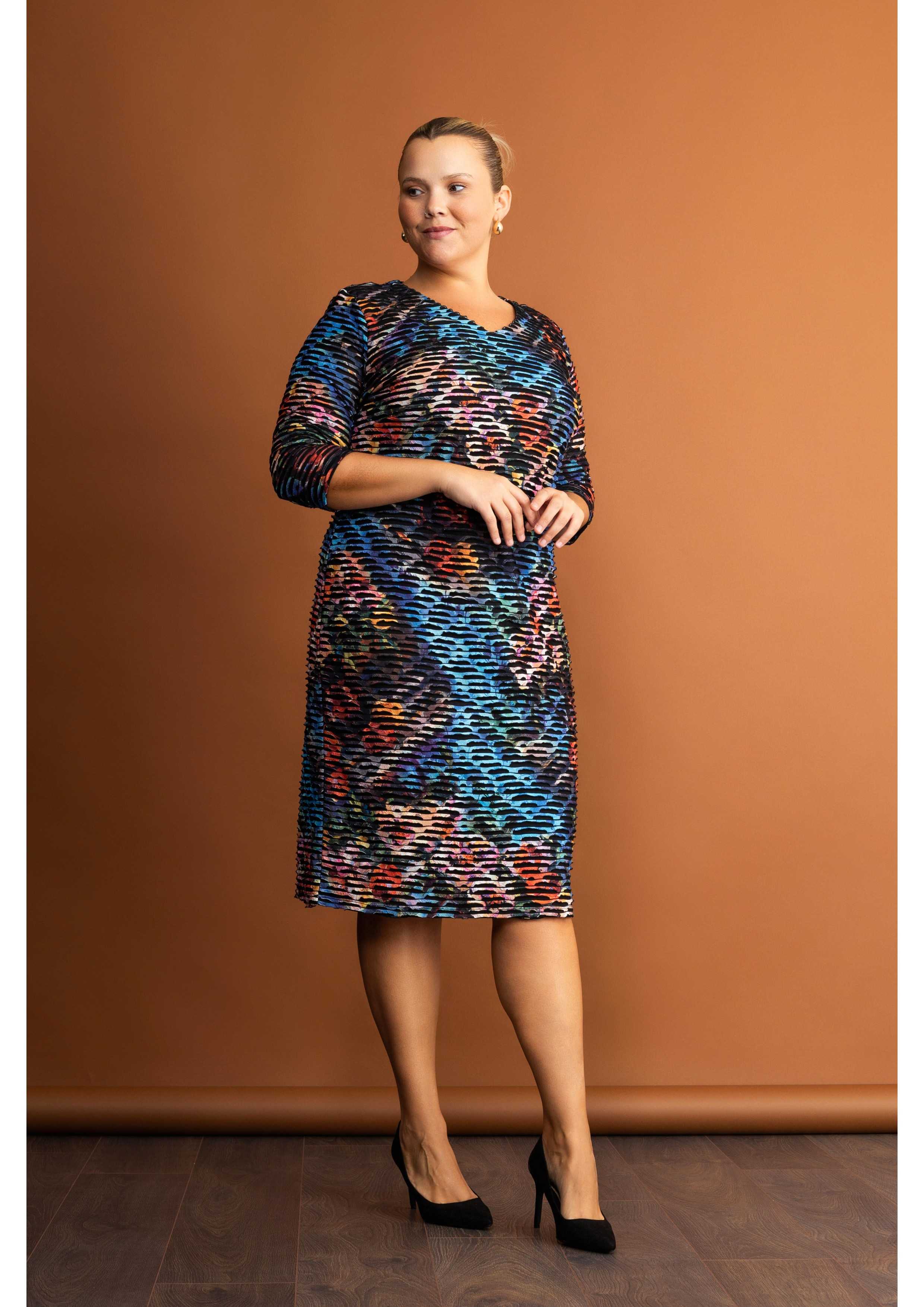 Robe en maille imprimée, manches 3/4, décolleté en V, pièce doublée. Collection : Automne Hiver Disponible en Grandes Tailles Produit de conception et de fabrication propre. Nous sommes une marque de confection de vêtements avec plus de 50 ans d'expérience Modèle : Taille 1,70m et porte la taille 2XL. Composition : 96% Polyester 4% Élasthanne