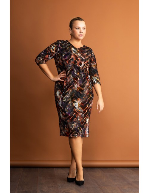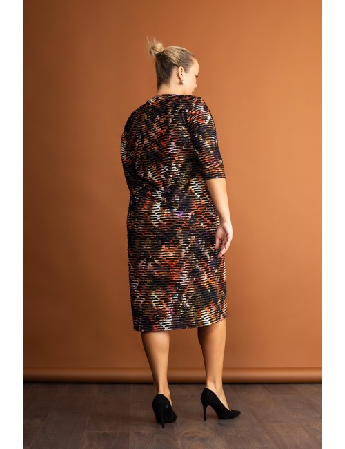 Robe en maille imprimée, manches 3/4, décolleté en V, pièce doublée. Collection : Automne Hiver Disponible en Grandes Tailles Produit de conception et de fabrication propre. Nous sommes une marque de confection de vêtements avec plus de 50 ans d'expérience Modèle : Taille 1,70m et porte la taille 2XL. Composition : 96% Polyester 4% Élasthanne
