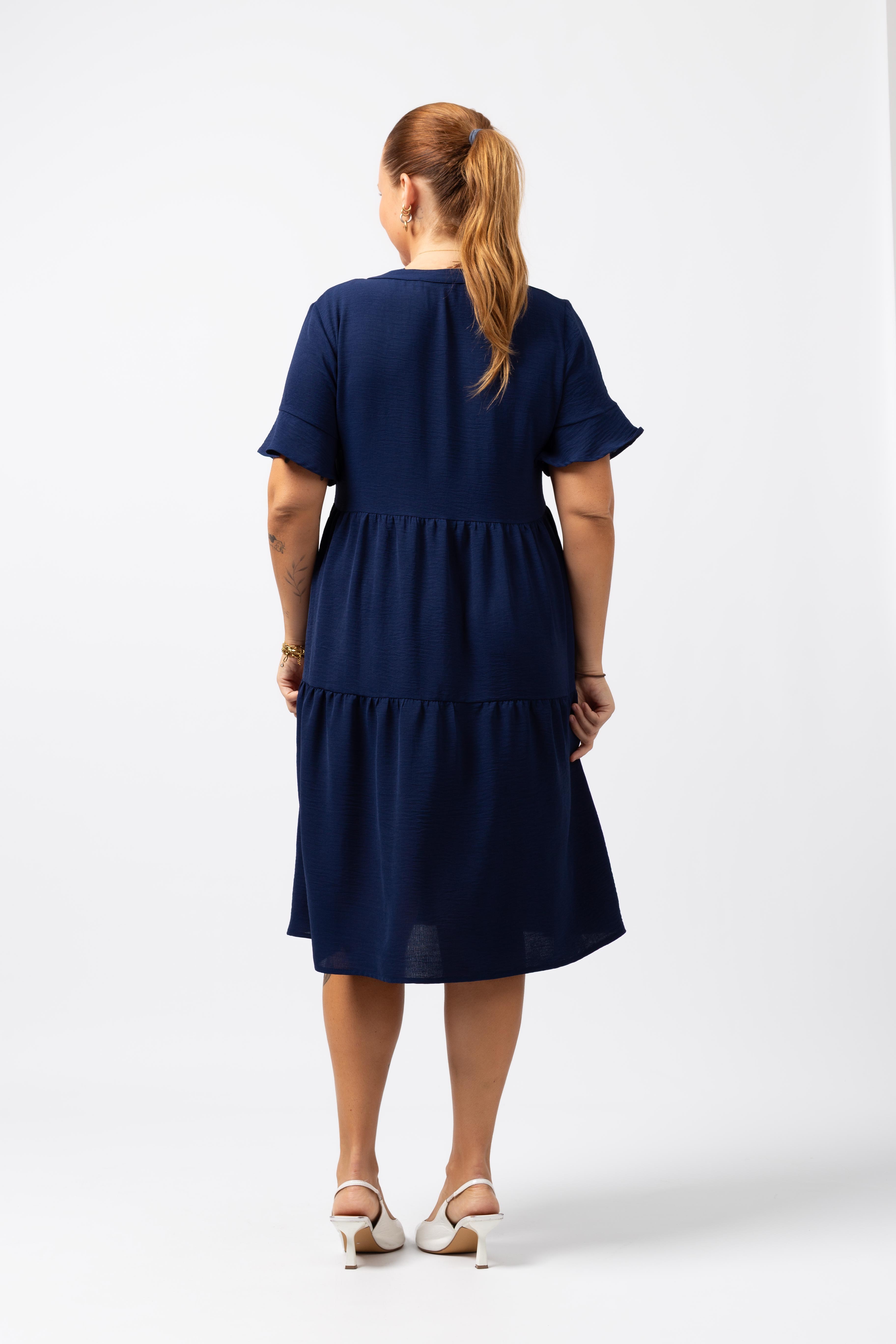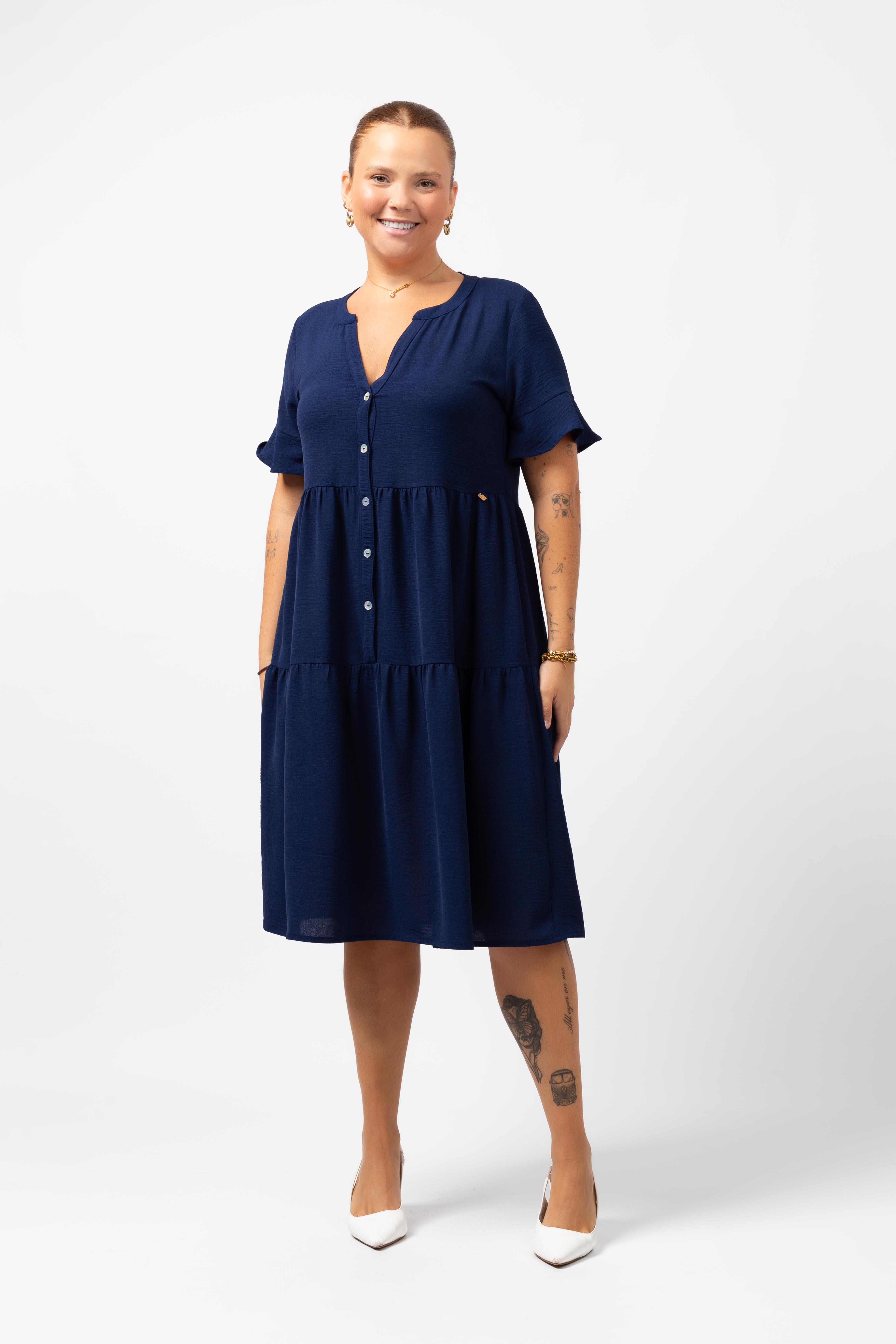 Robe en tissu uni, col officier avec une fente au milieu de la pièce. Manche courte avec volant. Modèle à volants froncés. Collection : Printemps Été Disponibile en Tailles Plus Produit de conception et de fabrication propre. Nous sommes une marque de confection de vêtements avec plus de 50 ans d'expérience Modèle : Taille 1,70 m et porte la taille XL. Composition : 100% Polyester