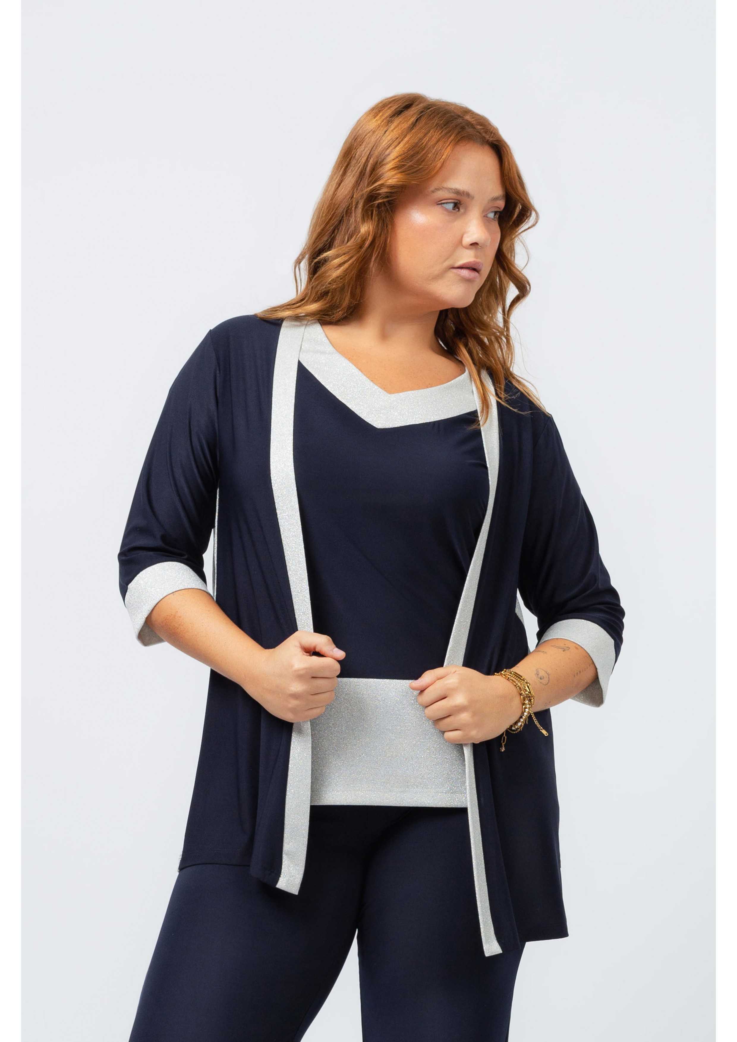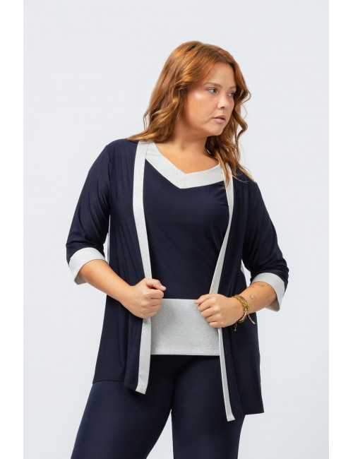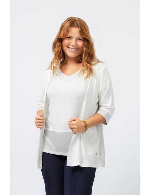 Ensemble en maille lisse, avec des inserts en maille lurex. Tunique à décolleté en V et insert à la base, fentes latérales. Veste à manches 3/4 avec poignets, insert latéral. Collection : Printemps Été Disponible en Grande Taille Produit de design et fabrication propre. Nous sommes une marque de confection de vêtements avec plus de 50 ans d'expérience Modèle : Taille 1.70m et porte la taille XL. Composition : 94%Polyester 6%Élasthanne|46%Viscose 30%Nylon 12%Polyester 12%Élasthanne