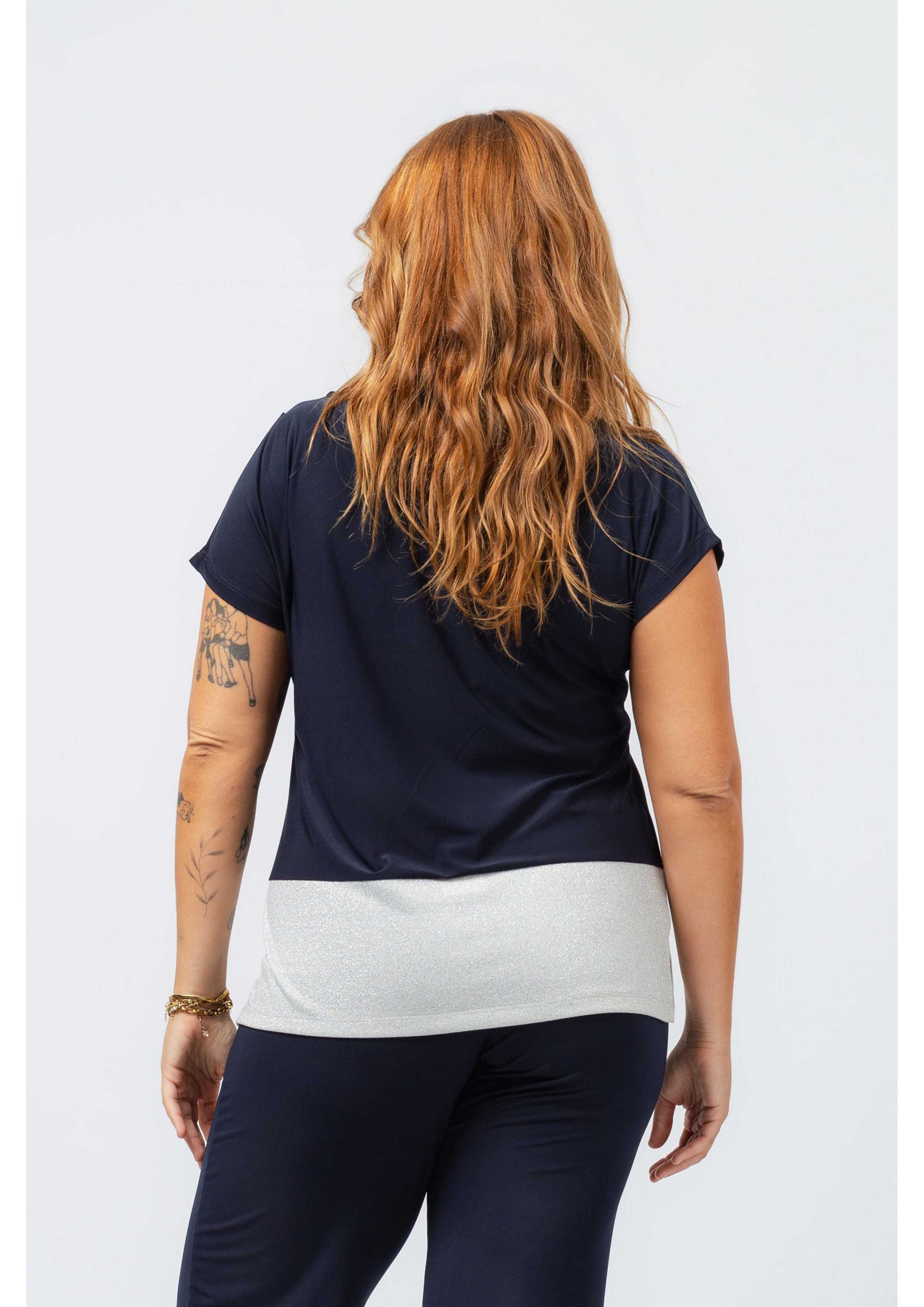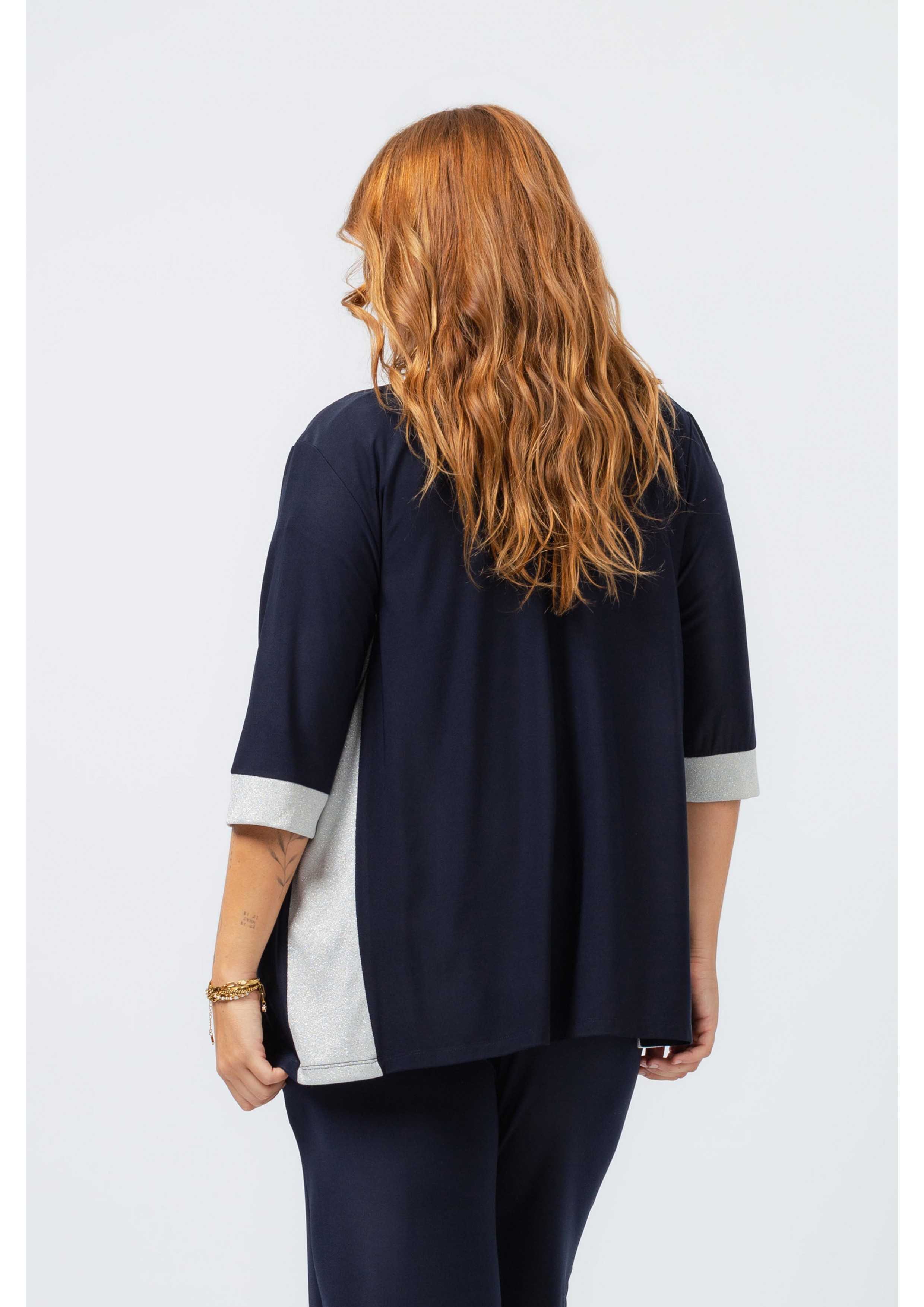 Ensemble en maille lisse, avec des inserts en maille lurex. Tunique à décolleté en V et insert à la base, fentes latérales. Veste à manches 3/4 avec poignets, insert latéral. Collection : Printemps Été Modèle : Taille 1.70m et porte la taille XL