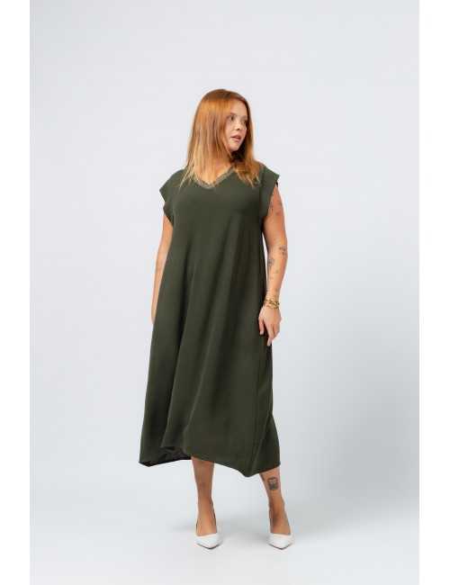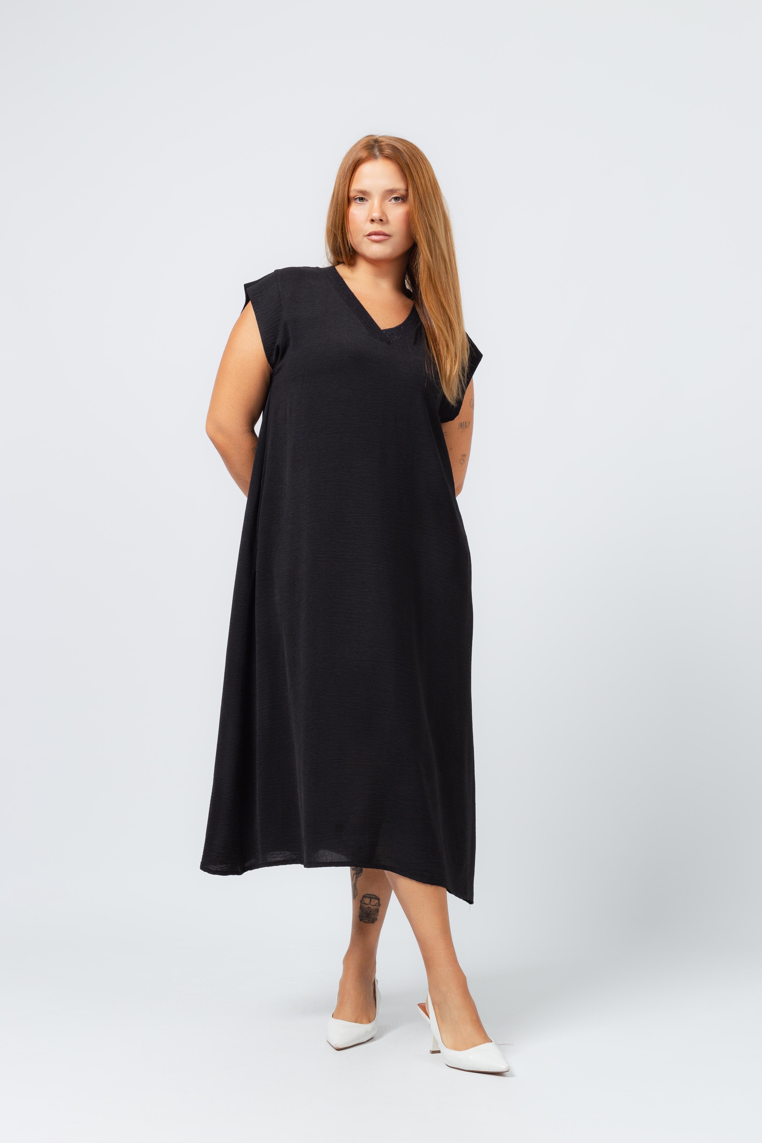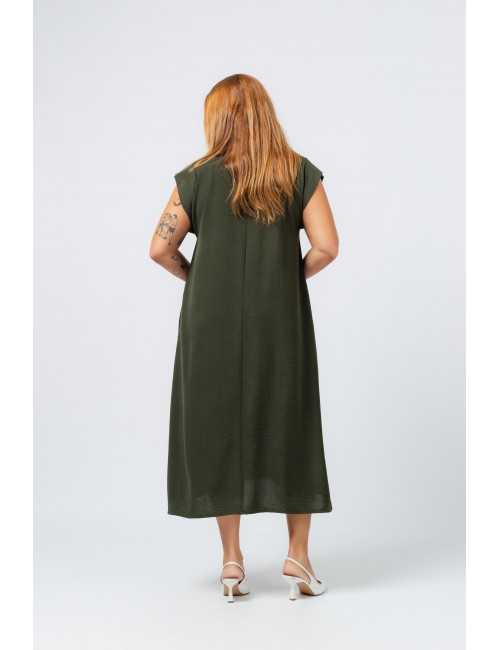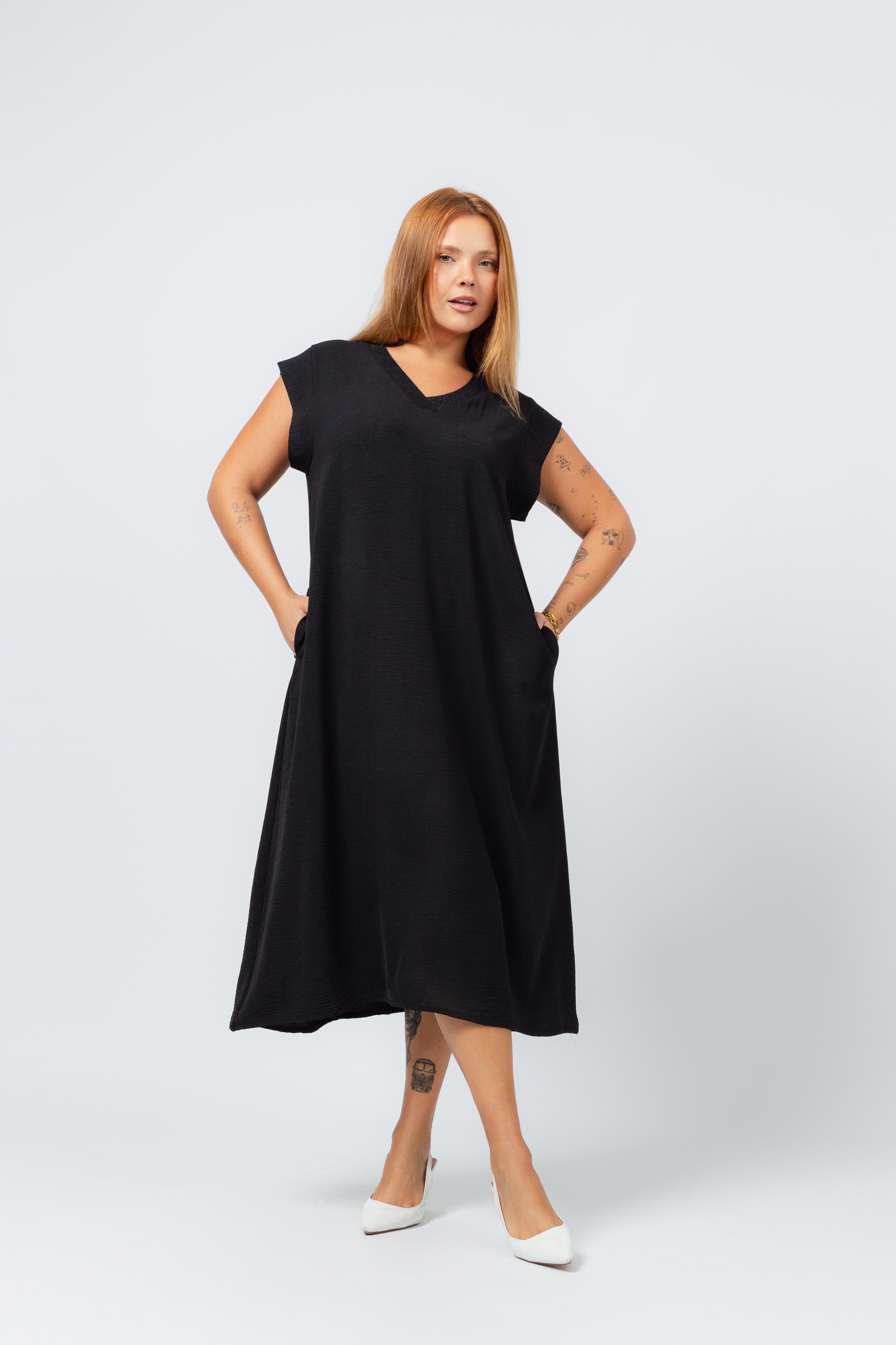 Robe en tissu uni, longue, avec manches cavées et bandeau en poignet replié, décolleté en V superposé avec bande droite en lurex. Poches latérales et couture au dos. Collection : Printemps Été Disponible en Grandes Tailles Produit de création et fabrication propre. Nous sommes une marque de confection de vêtements avec plus de 50 ans d'expérience Modèle : Taille 1,70 m et porte la taille XL. Composition : 100% Polyester