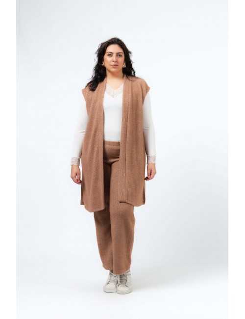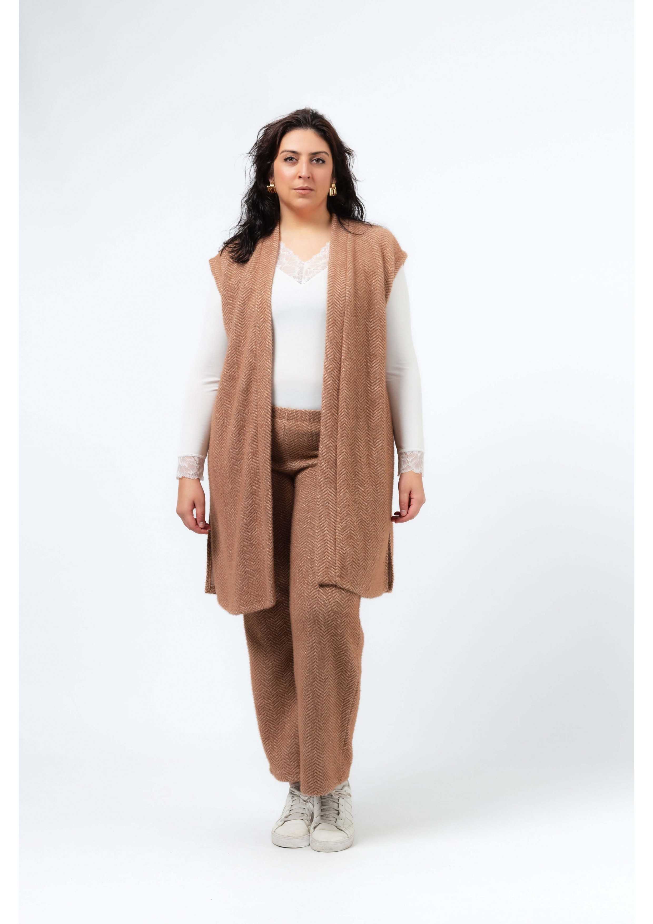 Ensemble en maille effet chevron, avec détails en lurex et léger poil extérieur. Gilet avec fentes latérales, bande repliée tout autour. Pantalon avec taille élastique recouverte. Coupe droite.