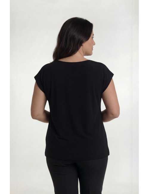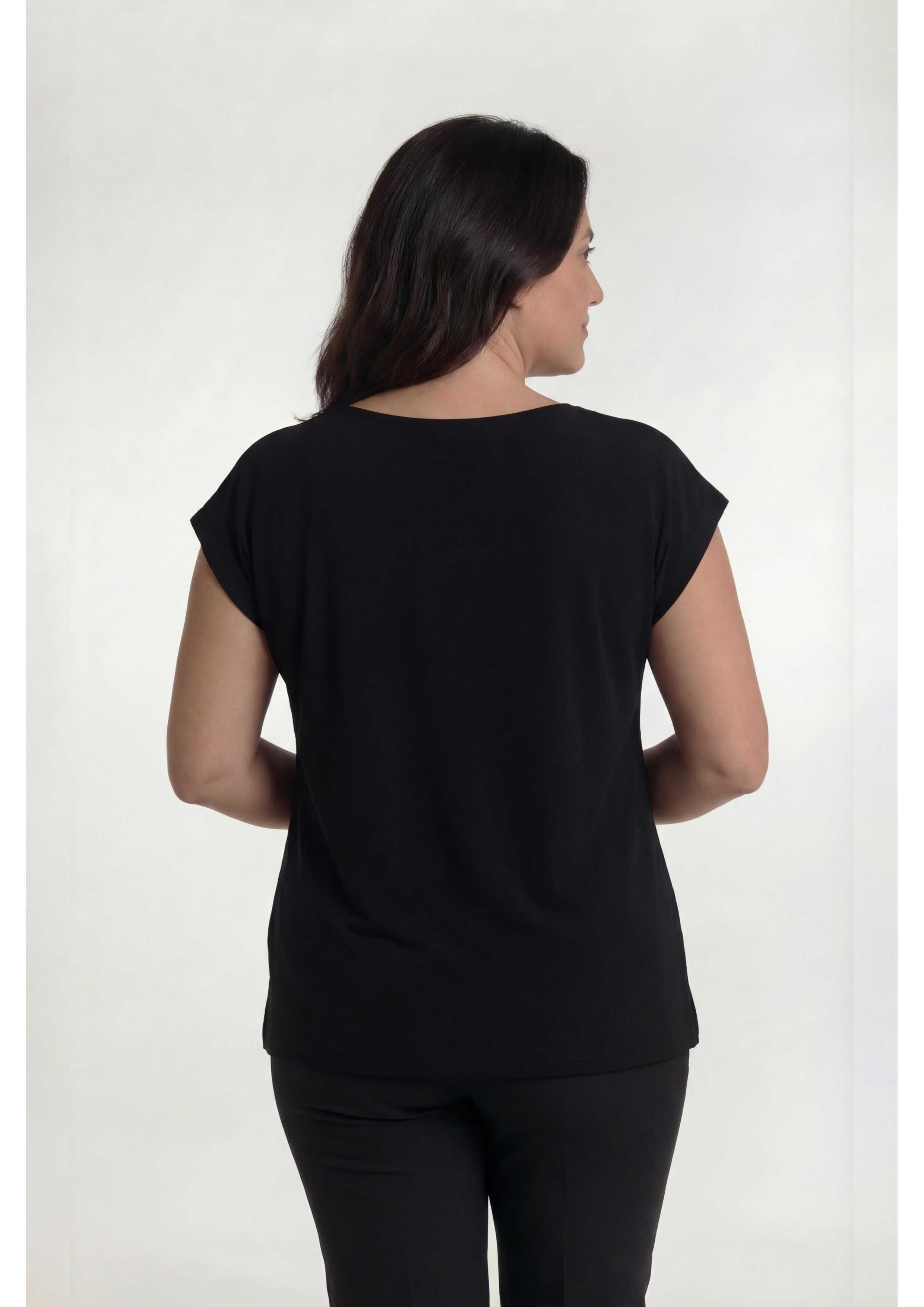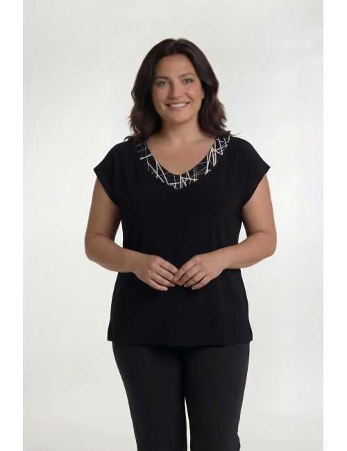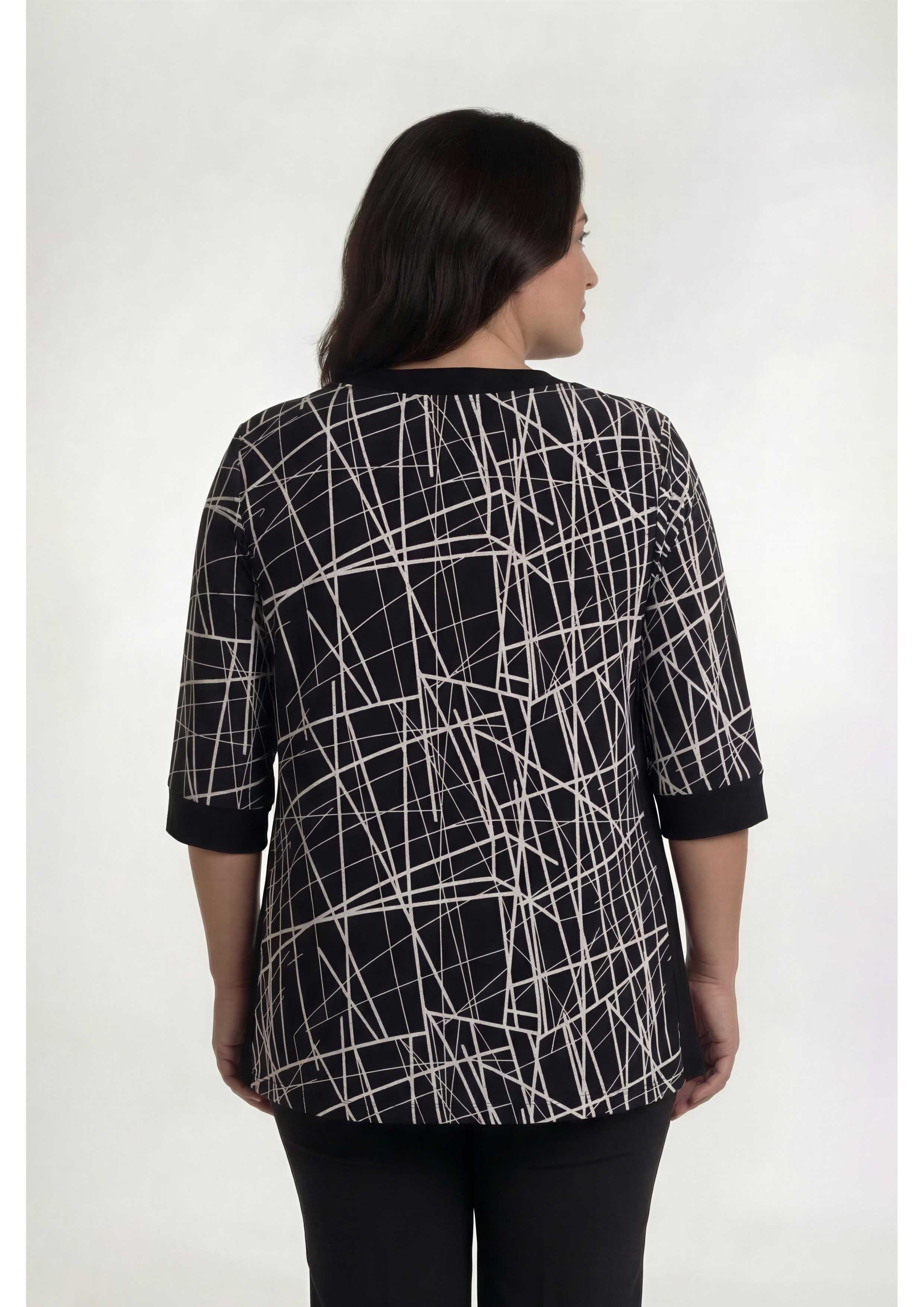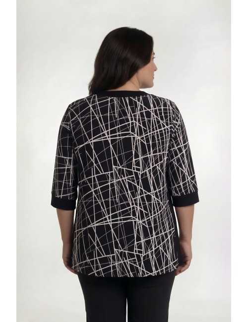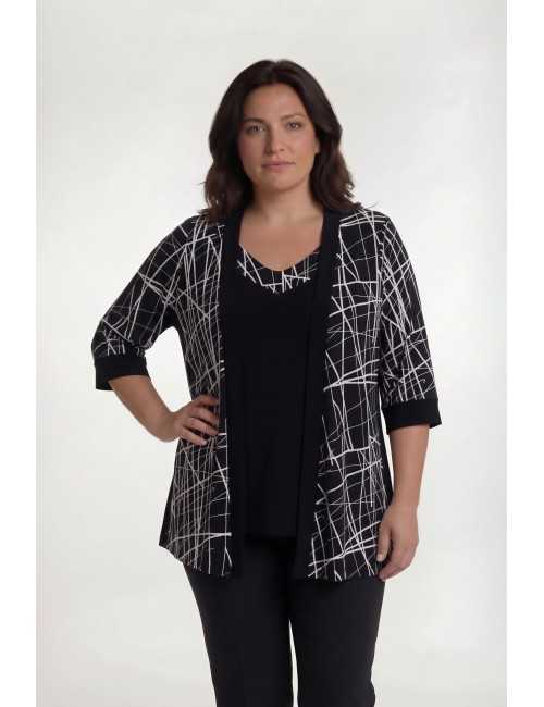 Ensemble en maille imprimée. tons noirs, tunique unie, col en V avec empiècement imprimé, fentes latérales. Veste manches 3/4, avec empiècements et poignets en maille unie.