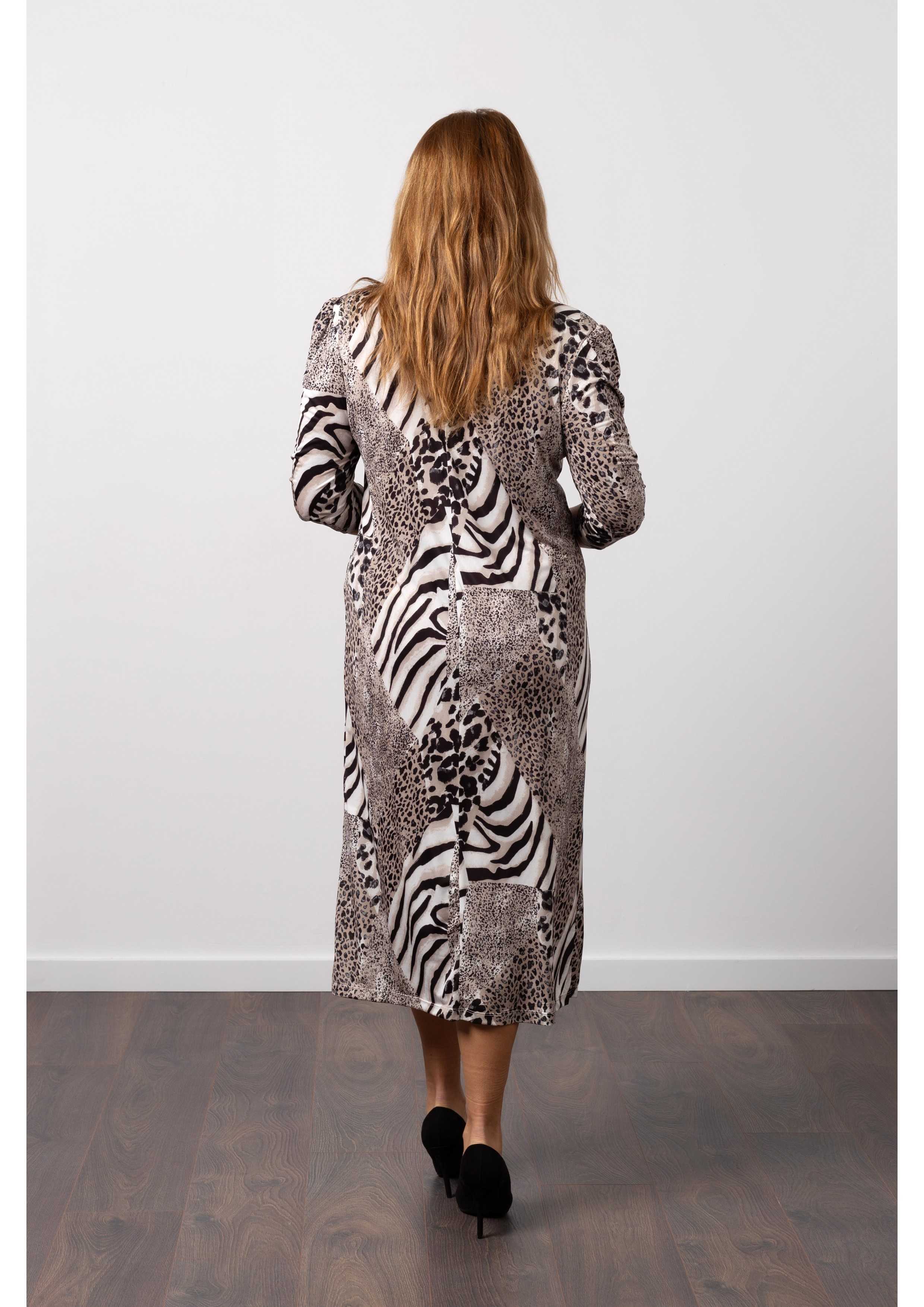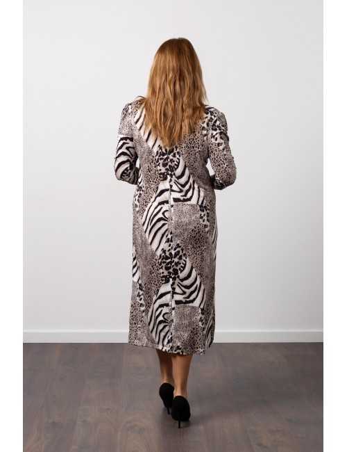 Robe en maille imprimée avec manches bouffantes 3/4, décolleté en V. Coutures devant et dos. Fente au milieu devant. Collection : Printemps Été Modèle : Taille 1,70 m et porte la taille XL