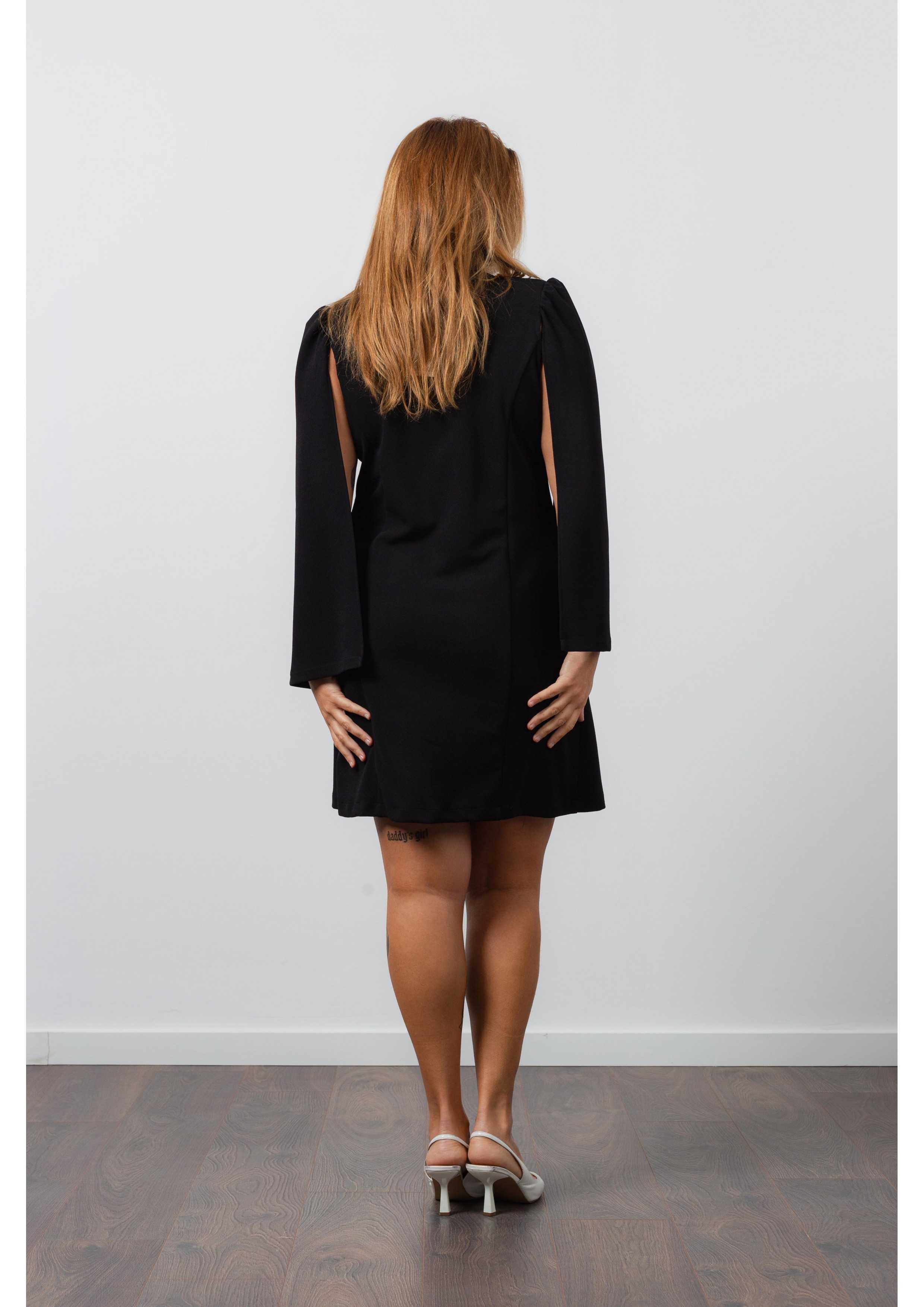 Robe en tissu uni, style manteau croisé avec des boutons dorés, creusé avec des manches style cape avec fronces à l'épaule. Avec épaulettes Collection : Automne Hiver Modèle : Taille 1,70 m et porte la taille XL, en noir. Modèle : Taille 1,73 m et porte la taille 4XL, en bleu.