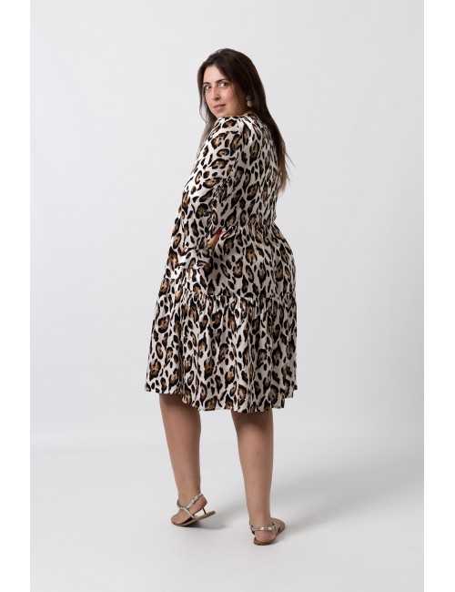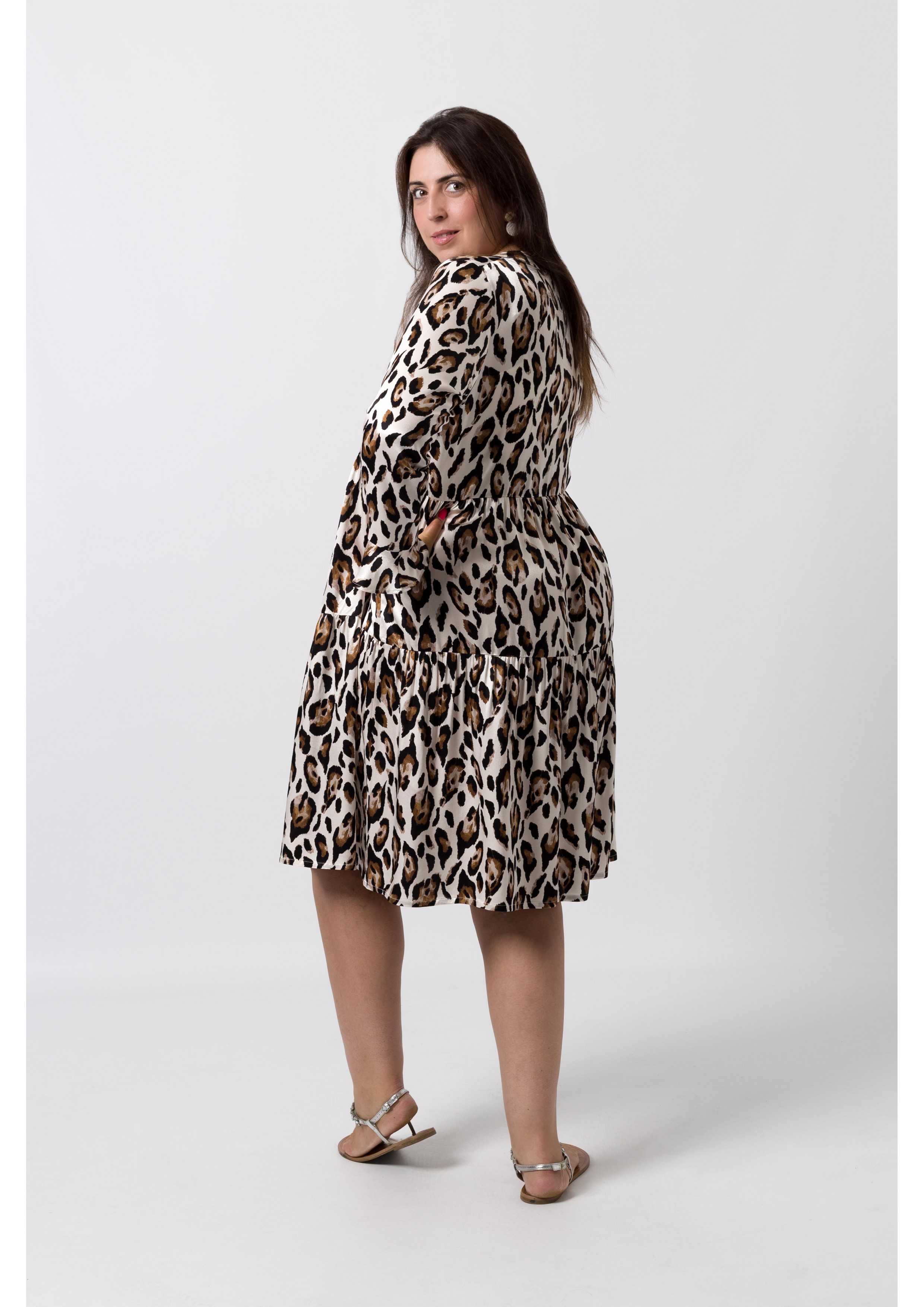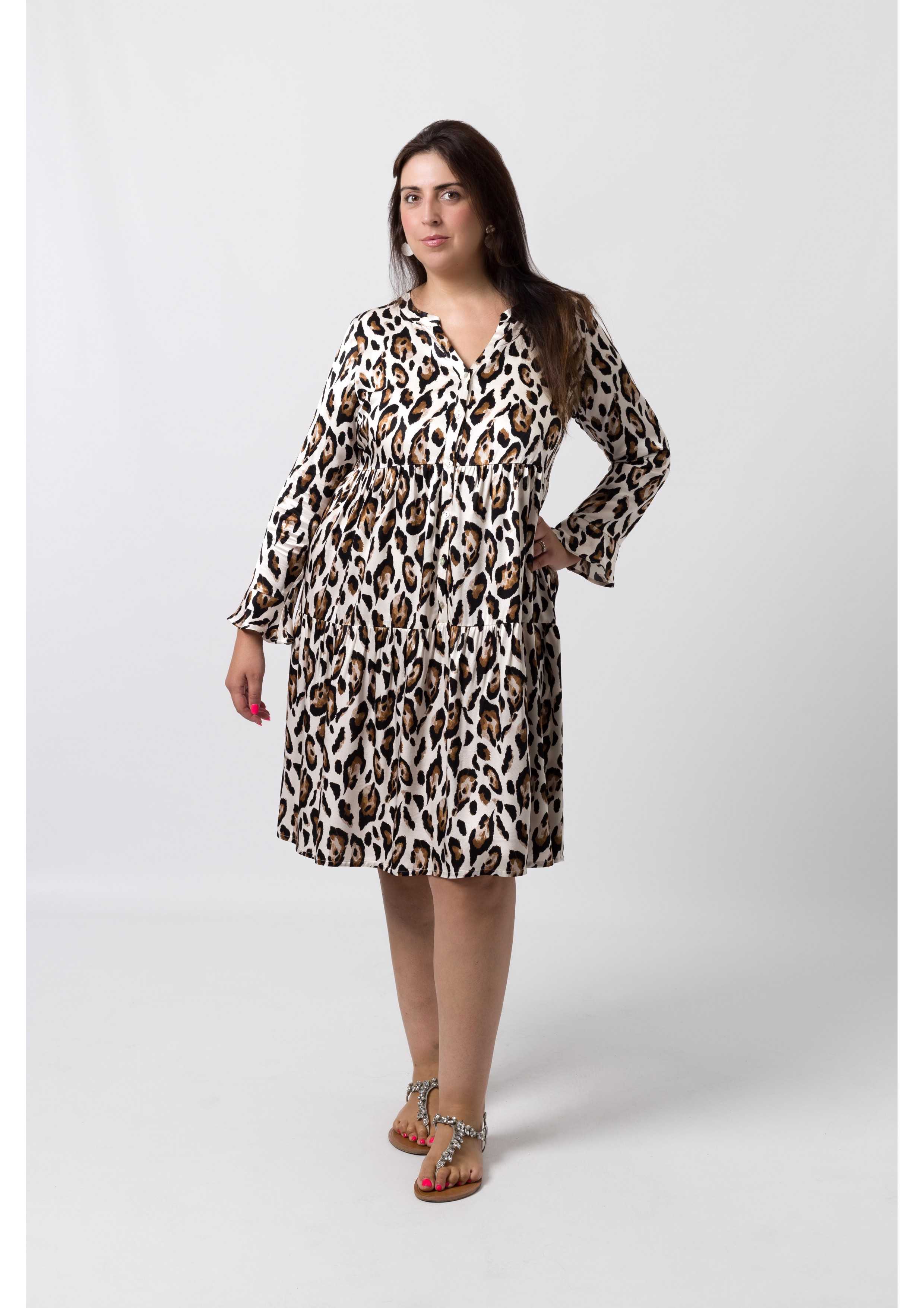 Robe en tissu imprimé, manches longues avec volants, empiècements en volants avec fronces, décolleté avec pied de col, patte de boutonnage jusqu'à mi-longueur. Collection : Automne Hiver Disponible en Grandes Tailles Produit conçu et fabriqué par nos soins. Nous sommes une marque de confection de vêtements avec plus de 50 ans d'expérience Modèle 1 : Taille 1,73m et porte la taille 3XL. Modèle 2 : Taille 1,65m et porte la taille 3XL Composition : 100% Viscose