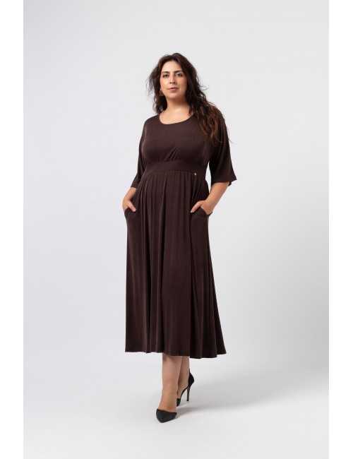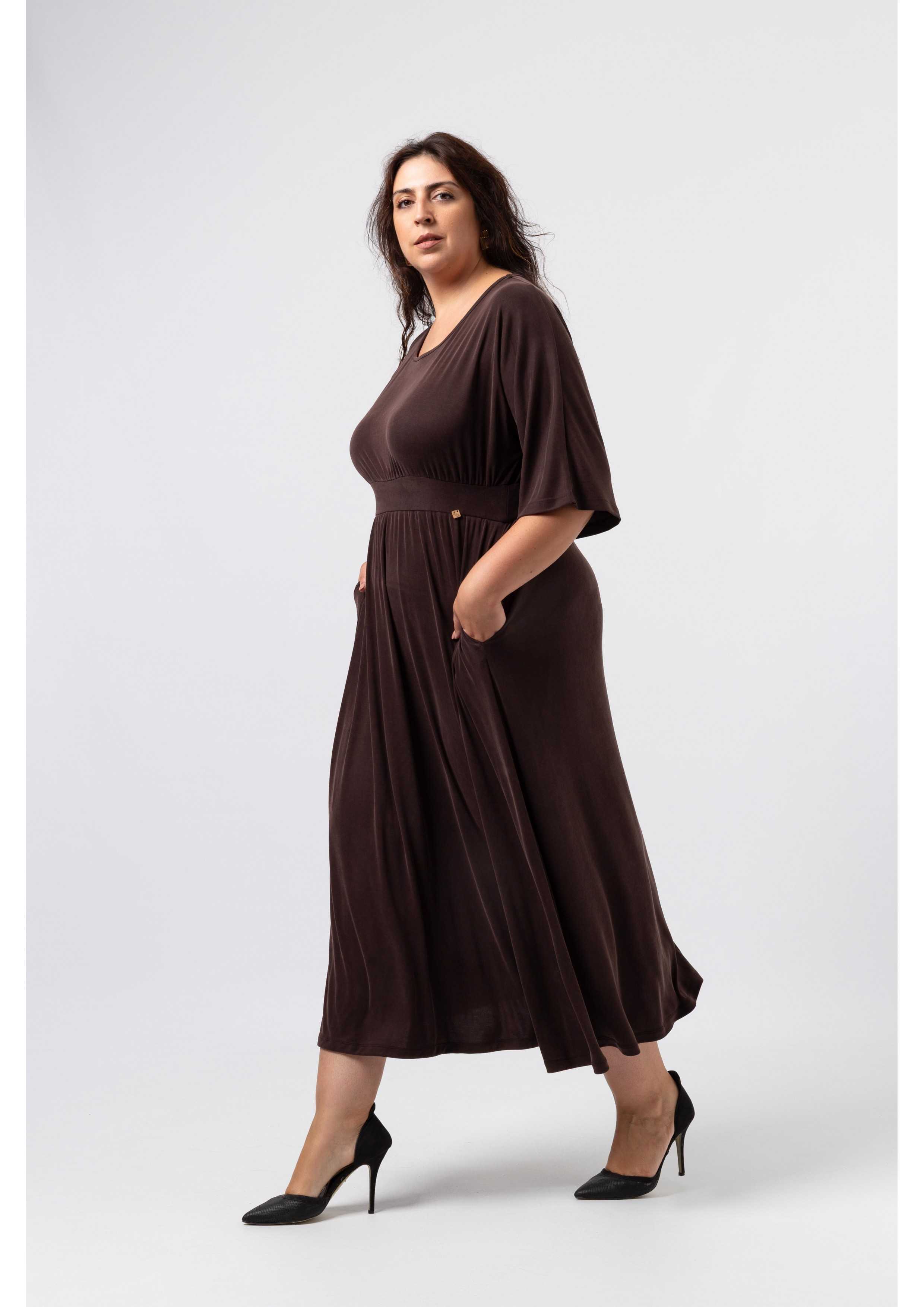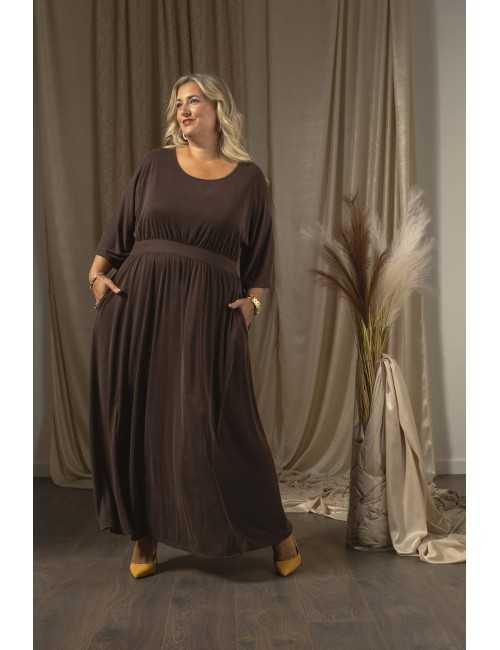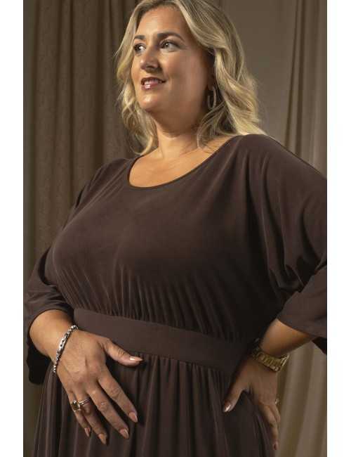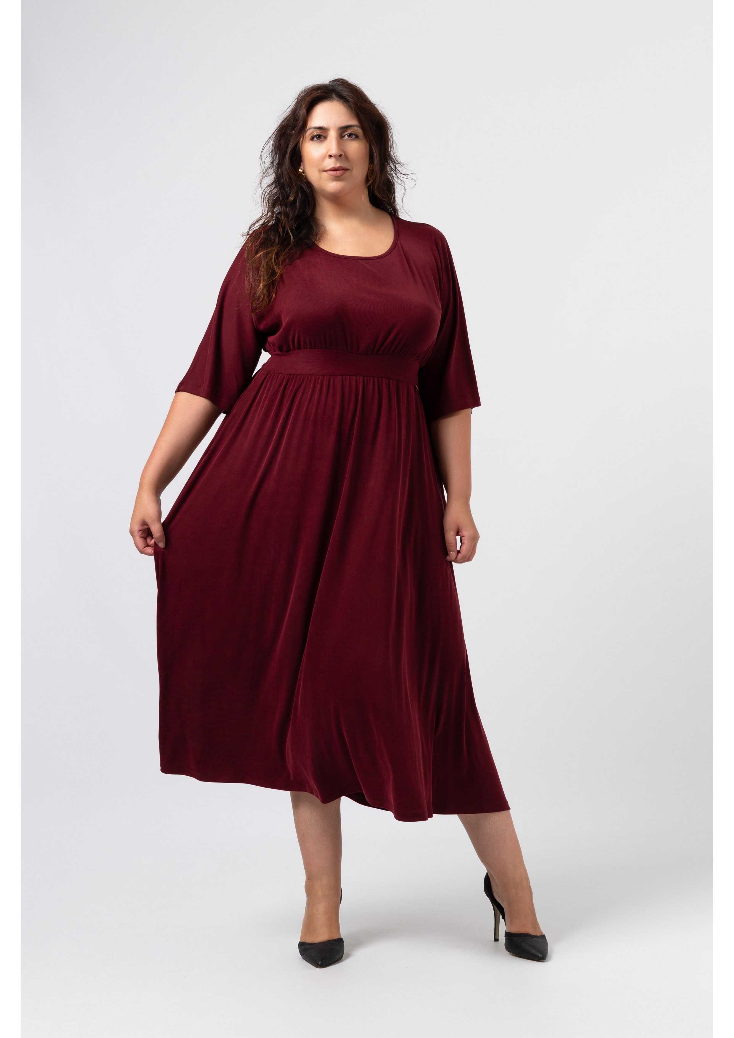 Robe en maille unie, type cupro, manches chauve-souris. Ceinture en maille double. Fronces à la poitrine et à la jupe, poches latérales, décolleté légèrement bateau. Collection : Automne Hiver Disponible en Grandes Tailles Produit de conception et de fabrication propres. Nous sommes une marque de confection de vêtements avec plus de 50 ans d'expérience Modèle : Taille 1,73 m et porte la taille 3XL. Modèle : Taille 1,65 m et porte la taille 3XL. Composition : 87% Polyester 10% Viscose 3% Élasthanne