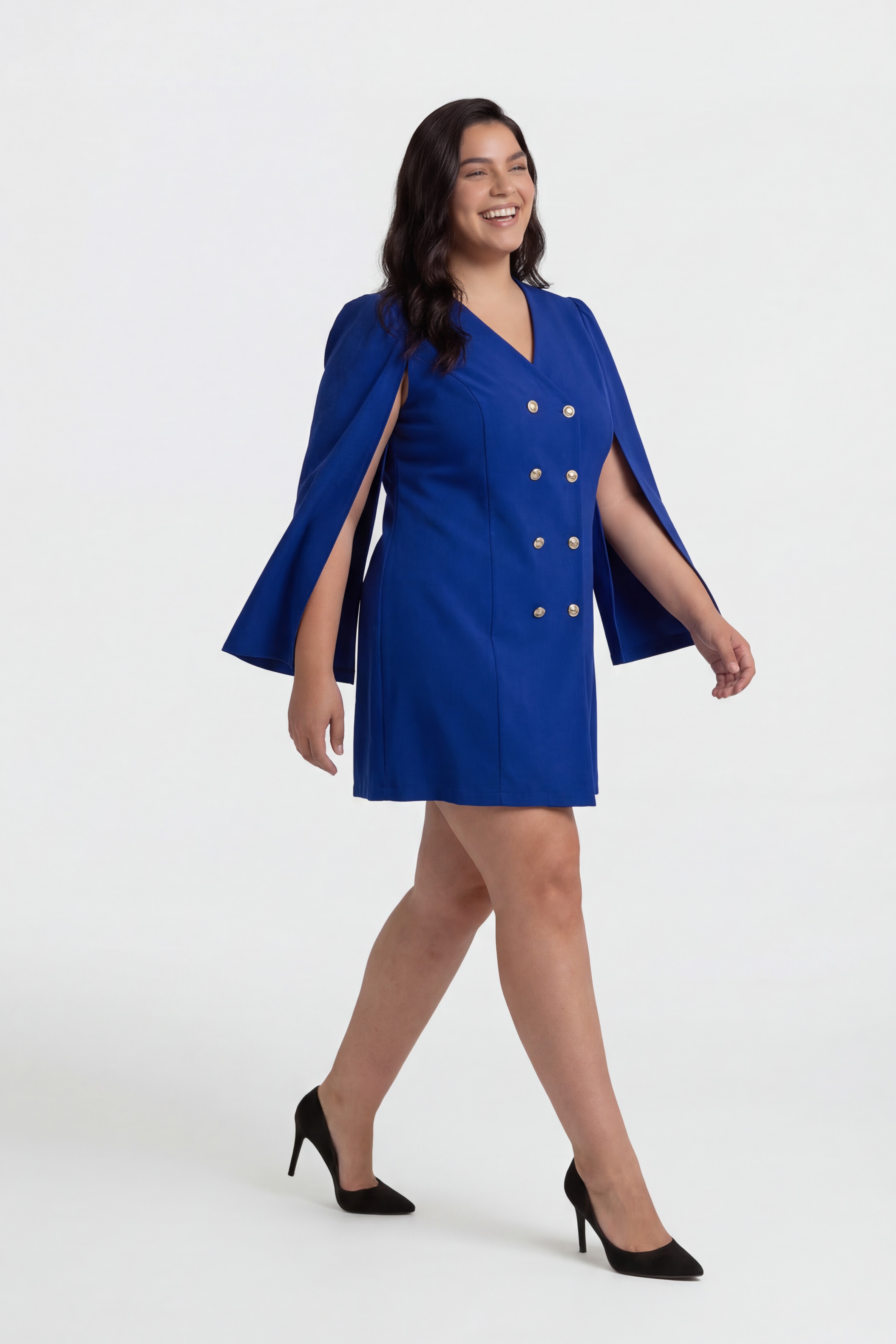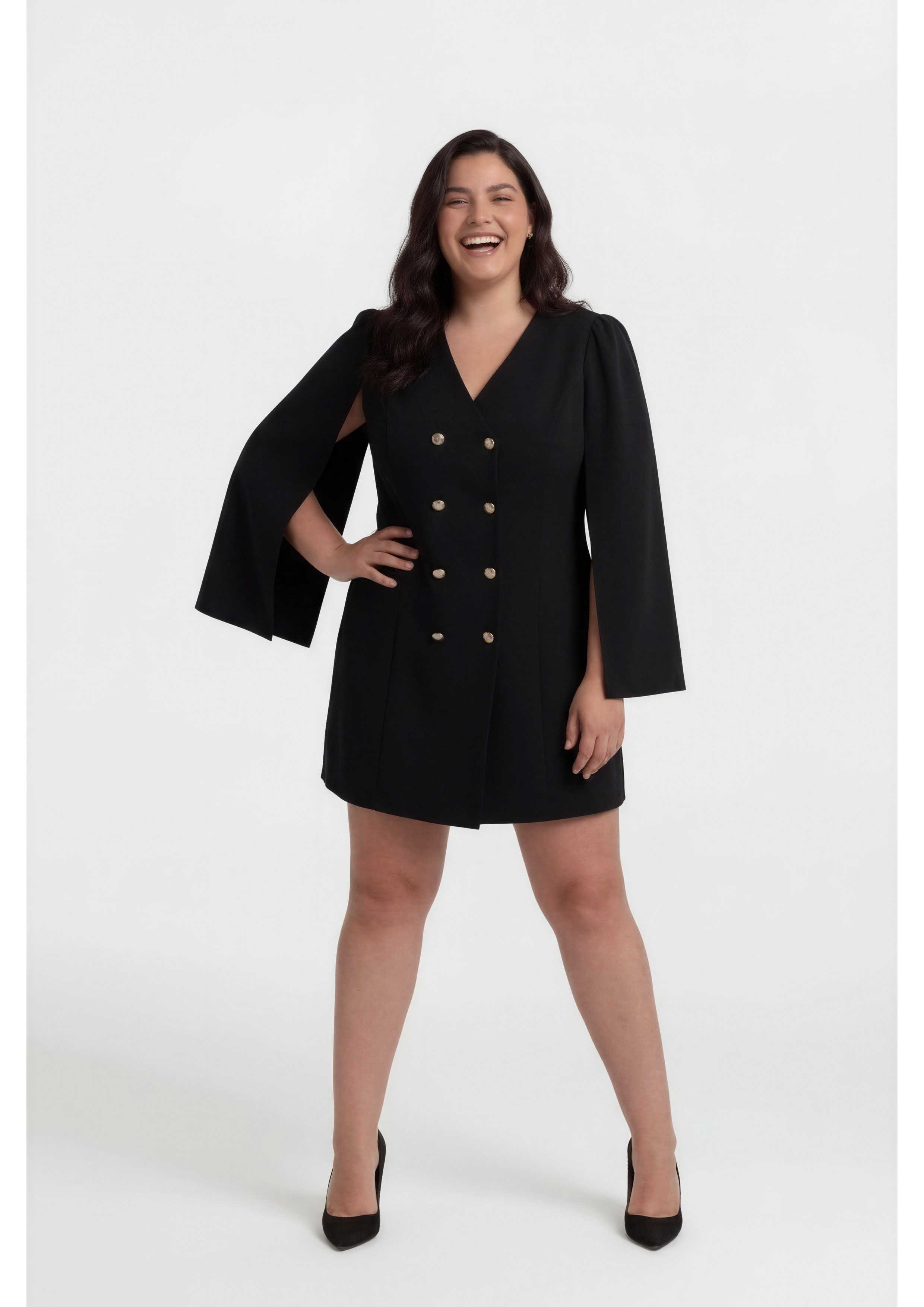 Robe en tissu uni, style manteau croisé avec des boutons dorés, creusé avec des manches style cape avec fronces à l'épaule. Avec épaulettes Collection : Automne Hiver Modèle : Taille 1,70 m et porte la taille XL, en noir. Modèle : Taille 1,73 m et porte la taille 4XL, en bleu.