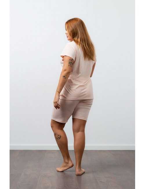 Pyjama en maille, t-shirt à manches courtes col rond avec un bord, maille à pois. Short uni jusqu'aux genoux, élastique à la taille. Collection : Printemps Été Disponible en Grandes Tailles Produit de conception et de fabrication propres. Nous sommes une marque de confection de vêtements avec plus de 50 ans d'expérience Modèle : Taille 1,70 m et porte la taille XL. Composition : 50%Modal 50%Coton