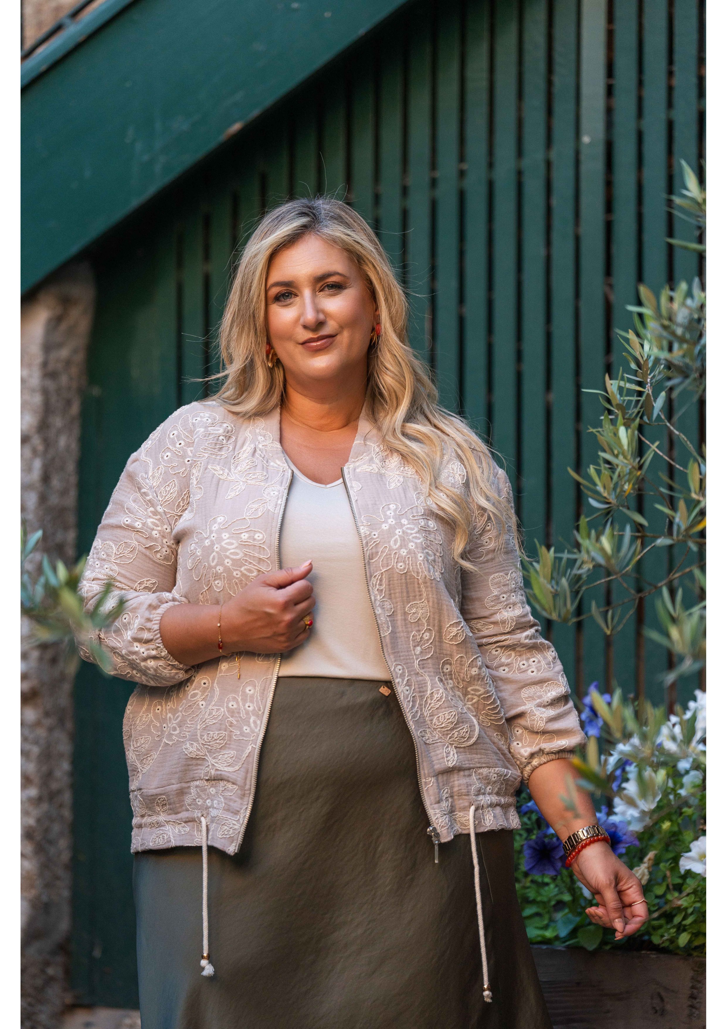 Top en maille unie, décolleté en V, creusé avec empiècement aux épaules en dentelle métallisée. Collection : Printemps Été Disponible en Grandes Tailles Produit de conception et fabrication propres. Nous sommes une marque de confection de vêtements avec plus de 50 ans d'expérience Modèle : Taille 1,70 m et porte la taille 2XL, en blanc Modèle : Taille 1,65 m et porte la taille 3XL, en beige Composition : Uni : 94 % Viscose 6 % Élasthanne | Brillant : 37 % Polyester 37 % Coton 1 % Élasthanne