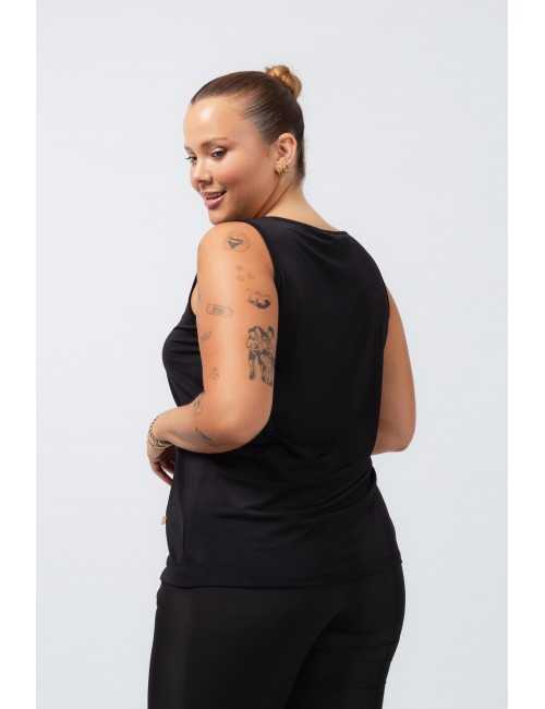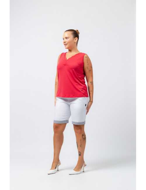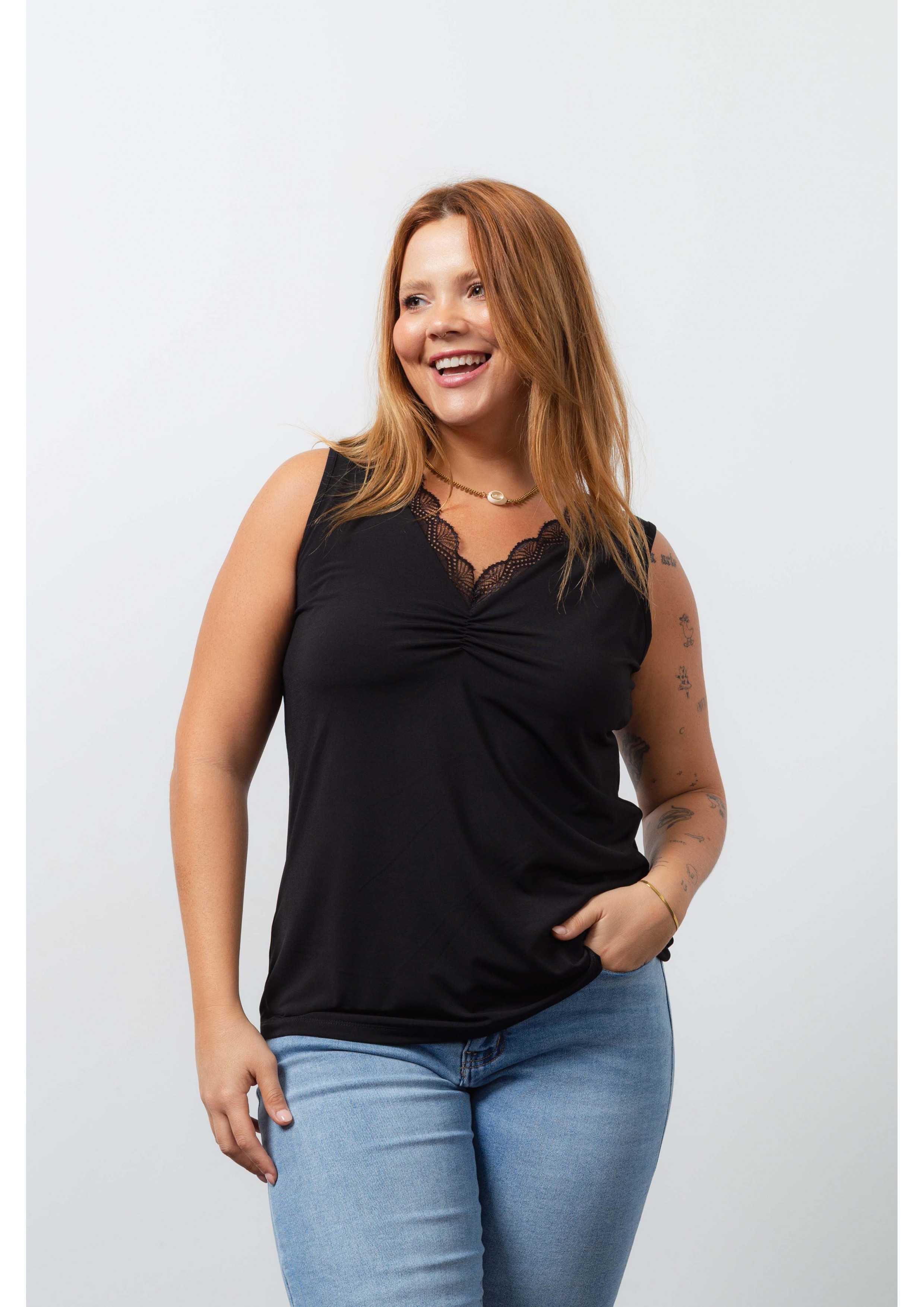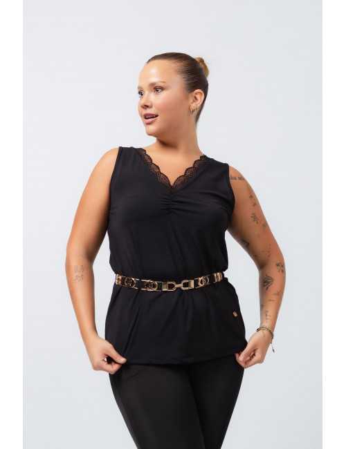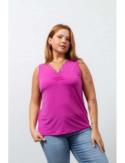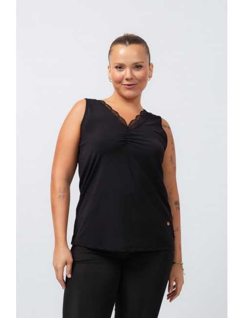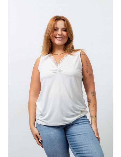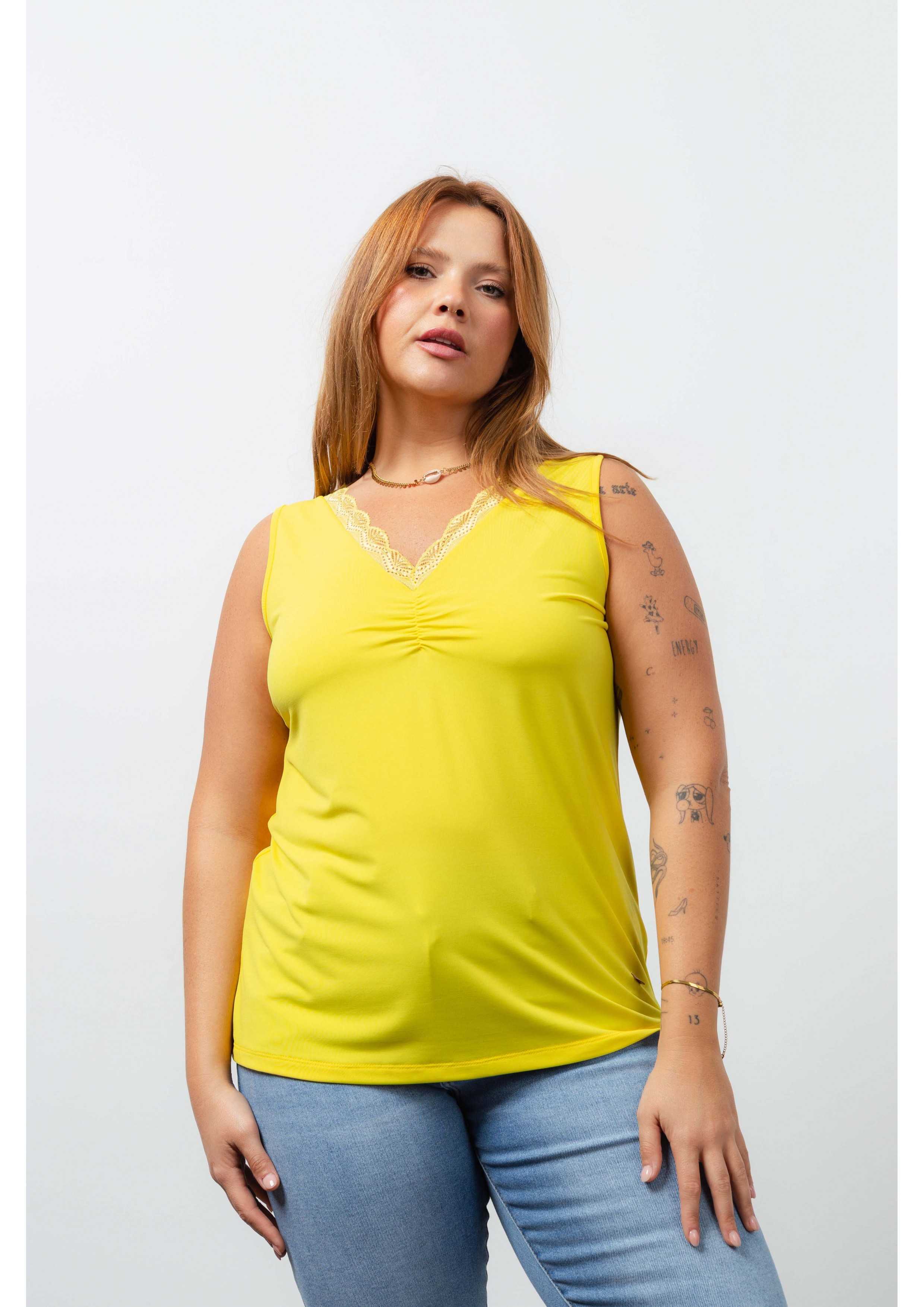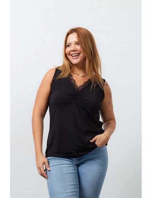 Top en maille unie, décolleté en V avec dentelle et fronce au centre devant. Collection : Printemps Été Disponible en Grandes Tailles Produit de conception et de fabrication propre. Nous sommes une marque de confection de vêtements avec plus de 50 ans d'expérience Modèle : Taille 1,70m et porte la taille XL. Composition : 94% Polyester 6% Élasthanne