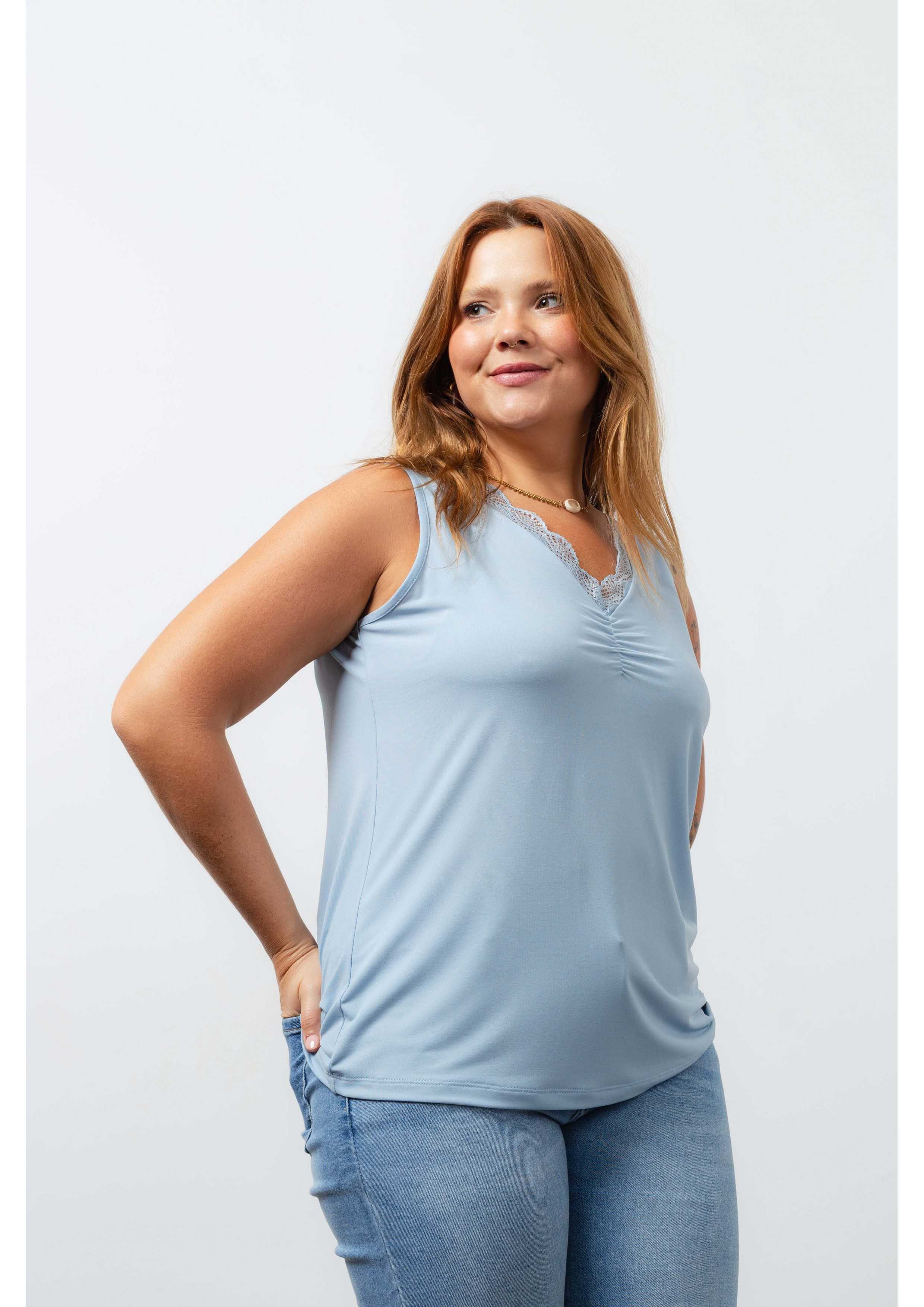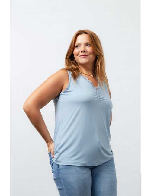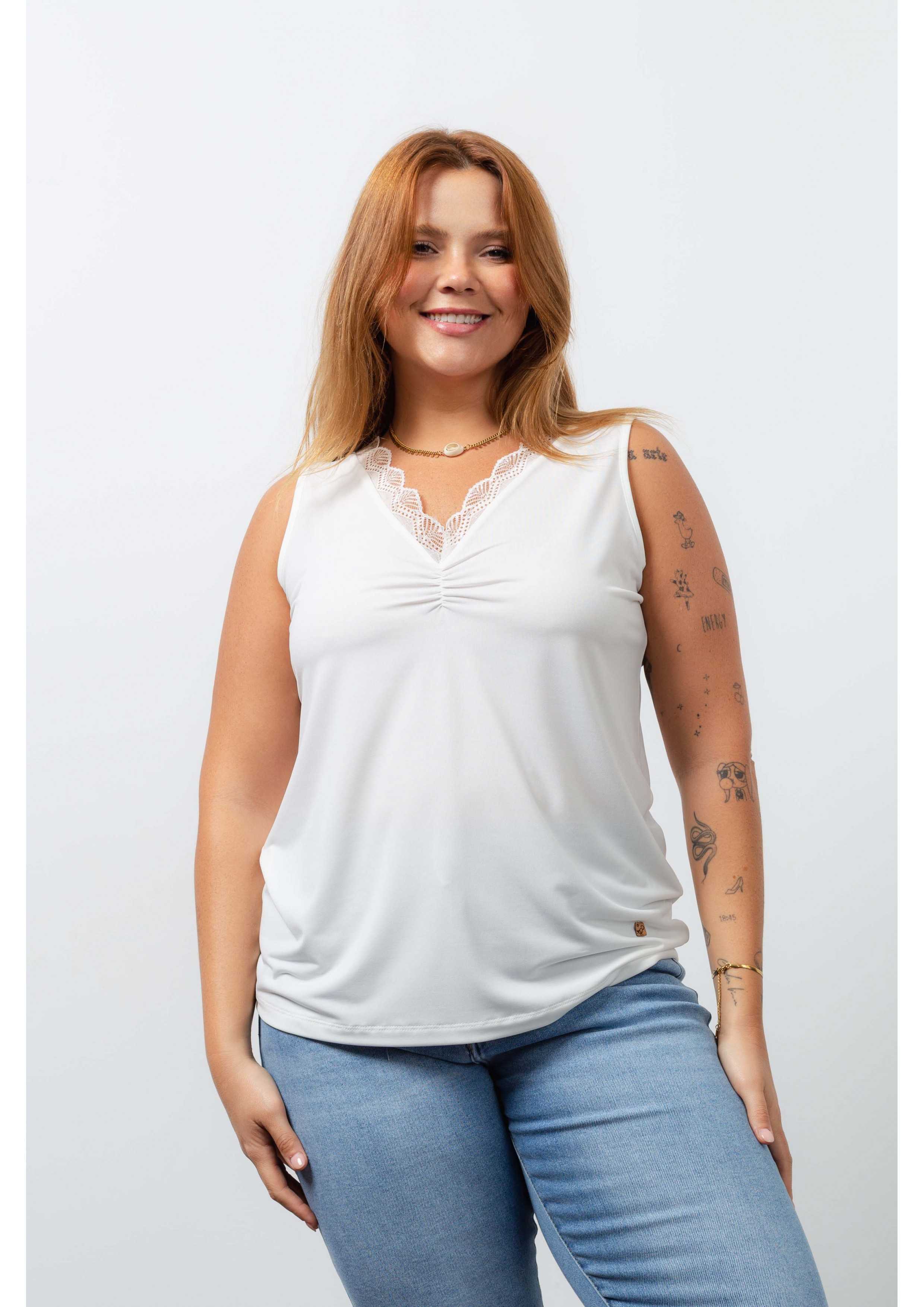 Top en maille unie, décolleté en V avec dentelle et fronce au centre devant. Collection : Printemps Été Modèle : Taille 1,70m et porte la taille XL.
