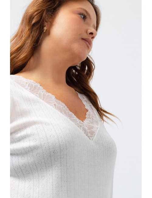 Top en maille jacquard, coupe droite, décolleté en V avec application de dentelle. Collection : Printemps Été Disponible en Tailles Grandes Produit de conception et fabrication propres. Nous sommes une marque de confection de vêtements avec plus de 50 ans d'expérience Modèle : Taille 1,70 m et porte la taille XL. Composition : 100% Coton