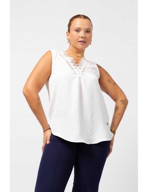 Top en tissu uni, décolleté en V avec application de dentelle. Coupe droite. Fentes latérales. Collection : Printemps Été Disponible en Grandes Tailles Produit de conception et de fabrication propre. Nous sommes une marque de confection de vêtements avec plus de 50 ans d'expérience Modèle : Hauteur 1,70 m et porte la taille XL. Composition : 100% Polyester