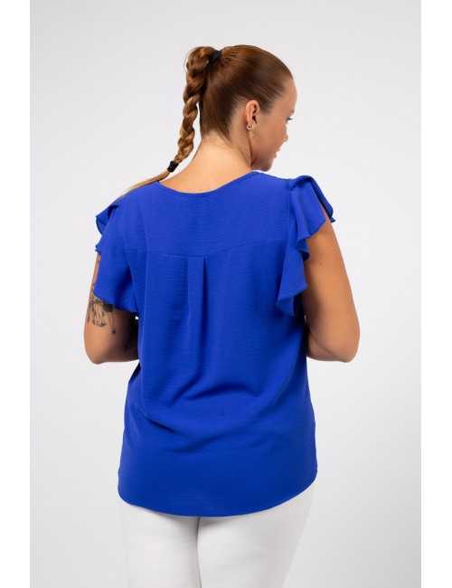 Top en tissu uni, volant aux emmanchures, décolleté rond avec patte fermée et application en métal, décolleté dans le dos. Collection : Printemps Été Disponible en Grandes Tailles Produit de conception et de fabrication propre. Nous sommes une marque de confection de vêtements avec plus de 50 ans d'expérience Modèle : Taille 1,70 m et porte la taille XL. Composition : 100% Polyester