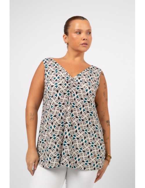 Top en maille imprimée, décolleté devant et dos en V, petite fronce avec élastique au décolleté devant. Collection : Printemps Été Disponible en Grandes Tailles Produit de dessin et fabrication propres. Nous sommes une marque de confection de vêtements avec plus de 50 ans d'expérience Modèle : Taille 1,70m et porte la taille L. Composition : 94% Polyester 6% Élasthanne