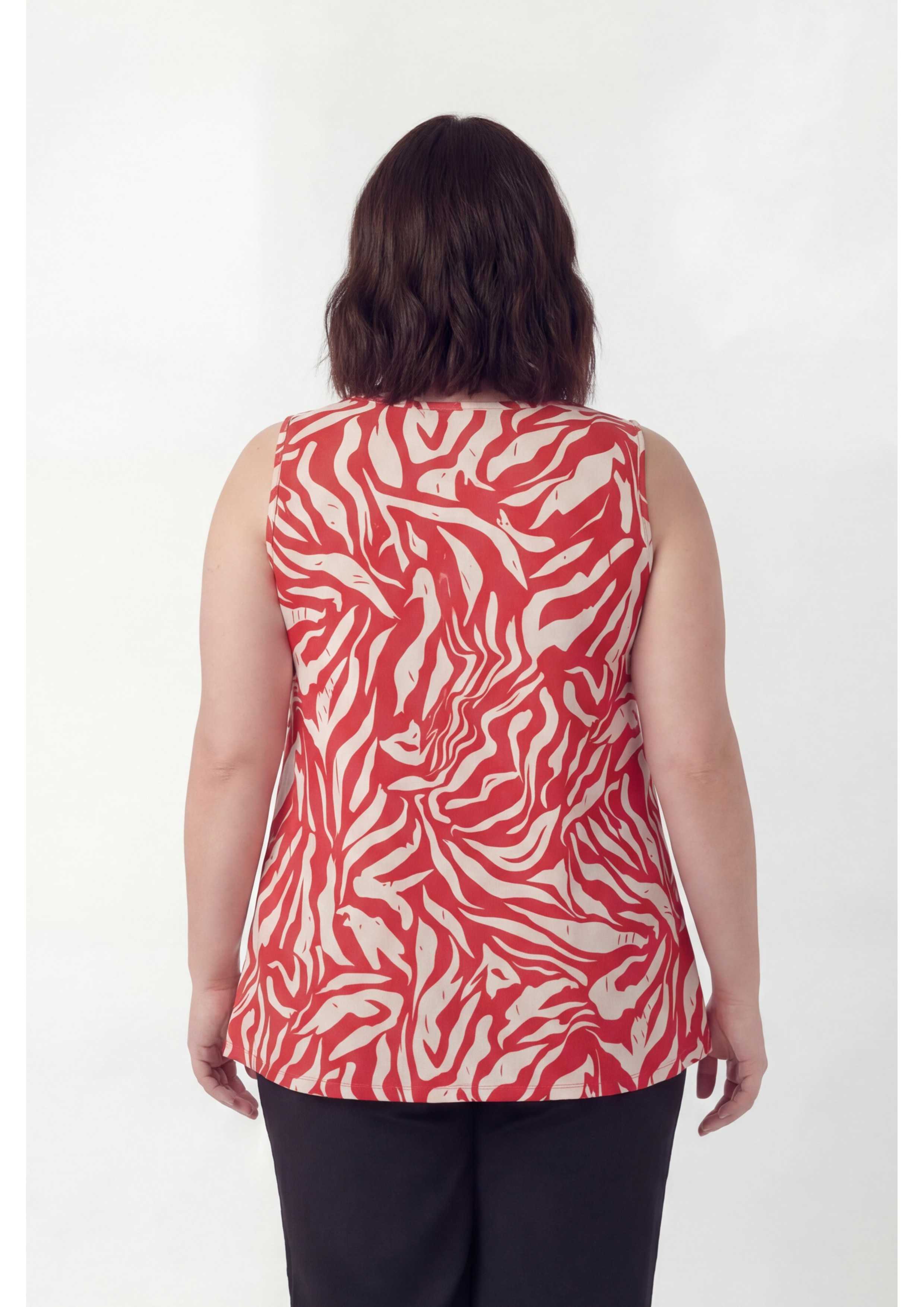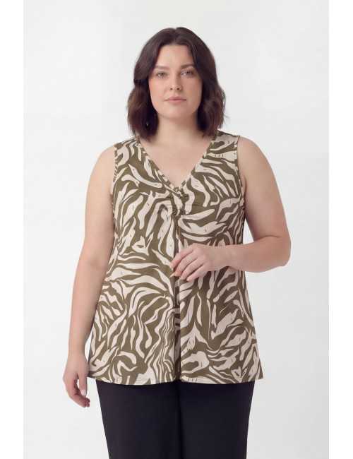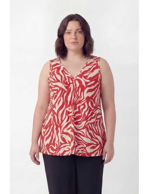 Top en maille imprimée, décolleté devant et dos en V, petite fronce avec silicone sur le décolleté devant. Modèle évasé. Disponible en Grandes Tailles Produit de conception et fabrication propre. Nous sommes une marque de confection de vêtements avec plus de 50 ans d'expérience