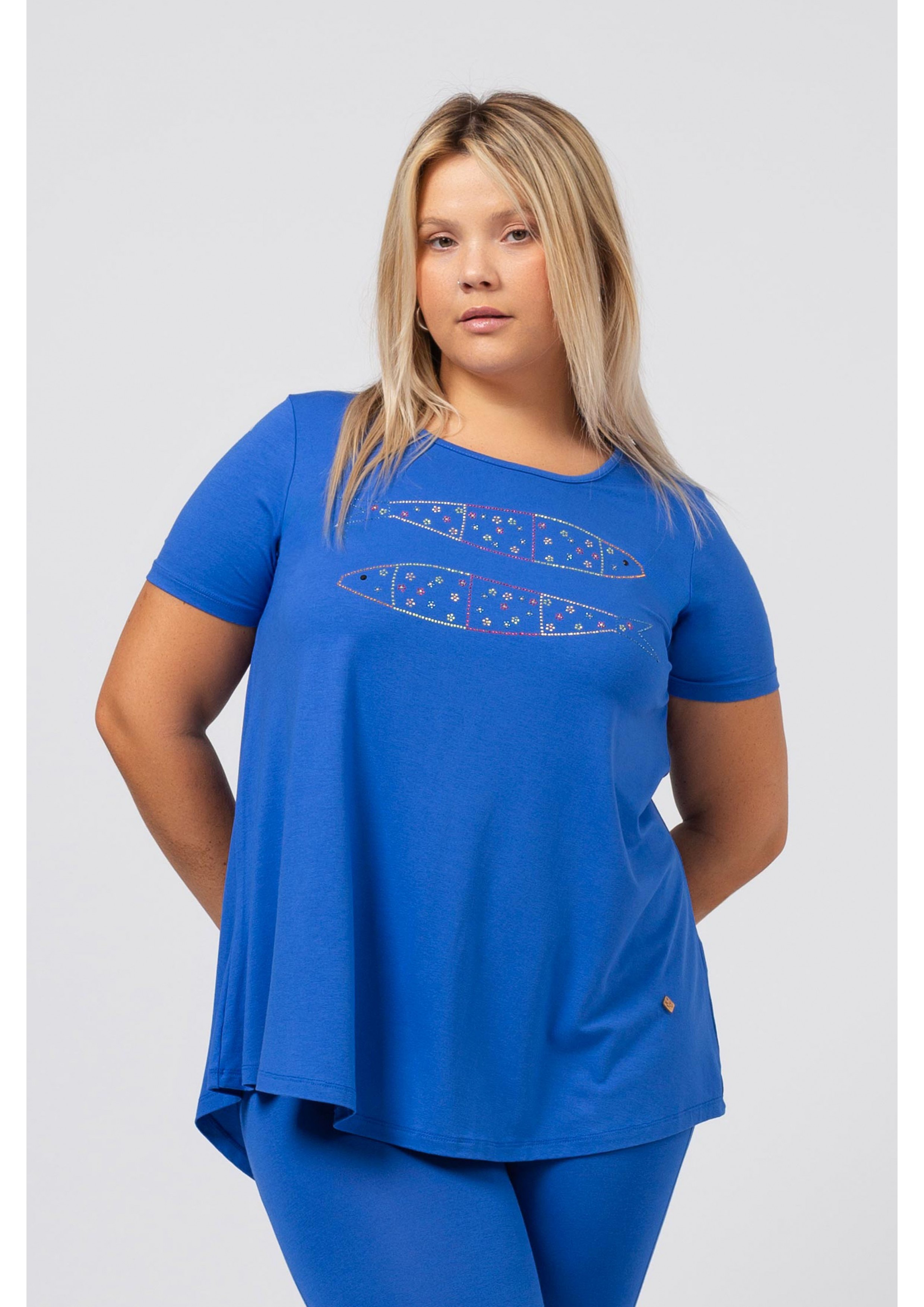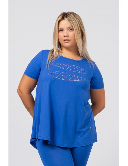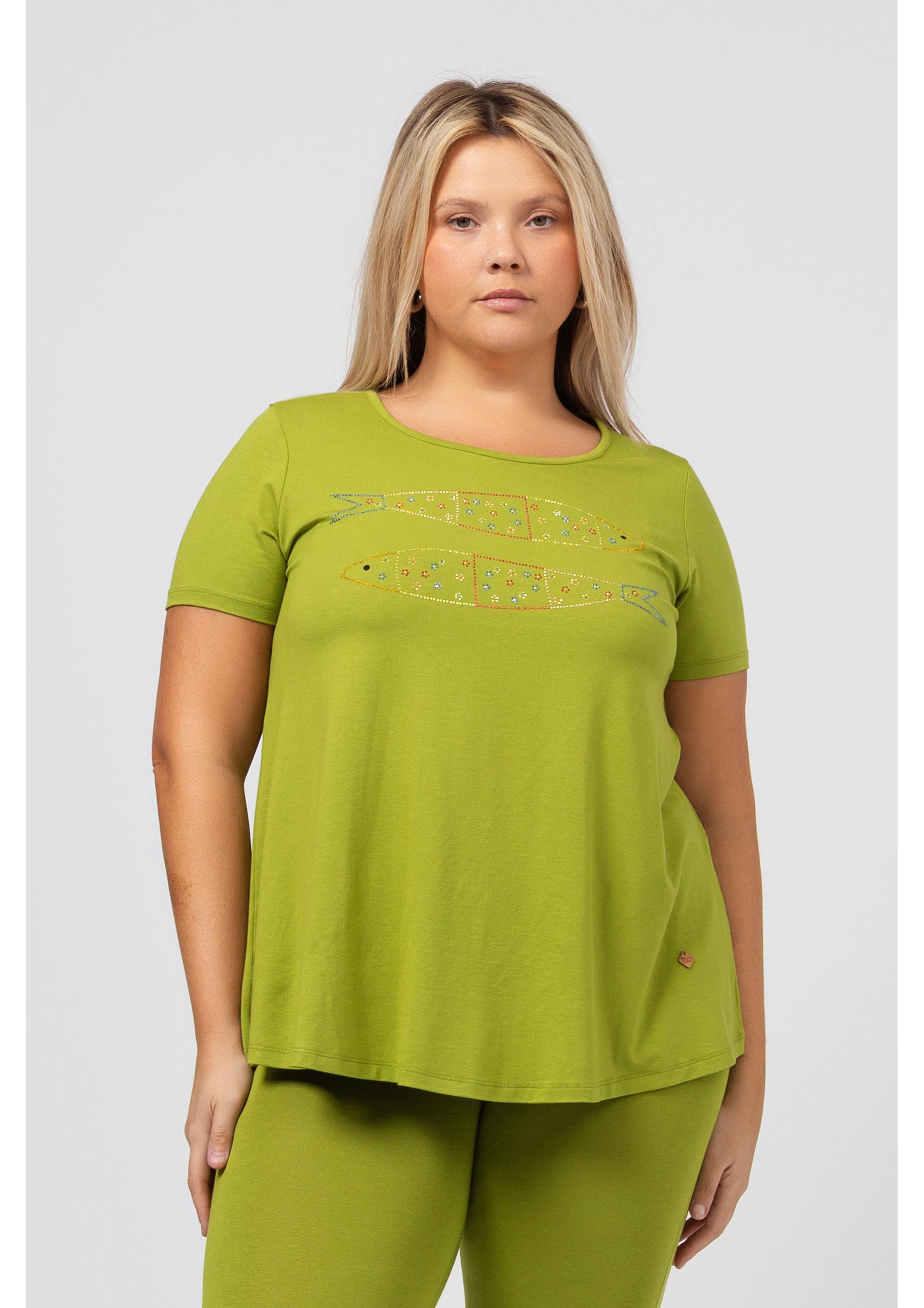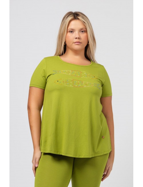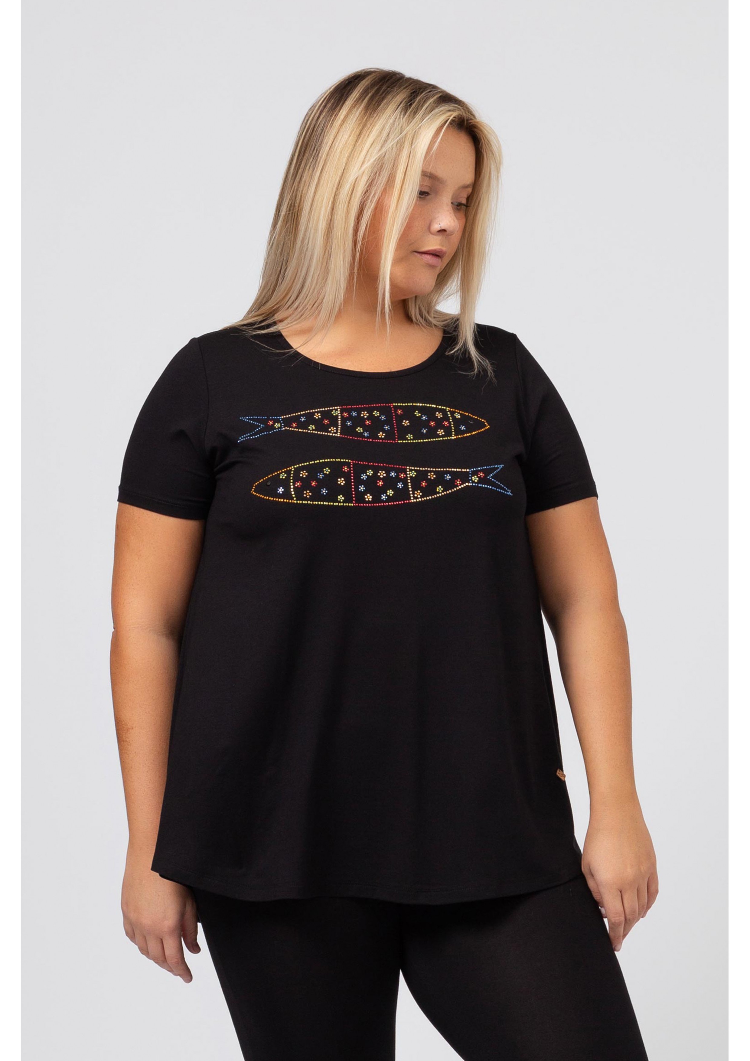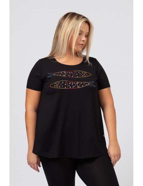 Tunique en maille unie avec application de poisson et décolleté rond. Collection : Printemps Été Disponible en Grandes Tailles Produit de conception et fabrication propre. Nous sommes une marque de confection de vêtements avec plus de 50 ans d'expérience Modèle : Taille 1,70 m et porte la taille 2XL. Composition : 94 % Viscose 6 % Élasthanne