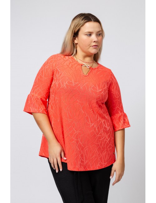 Tunique en maille avec décolleté rond et ouverture avec application manches 3/4 avec volants. Collection : Printemps Été Disponible en Grandes Tailles Produit de design et fabrication propre. Nous sommes une marque de confection de vêtements avec plus de 50 ans d'expérience Modèle : Taille 1.70m et porte la taille 2XL. Composition : 95% Polyester 5% Élasthanne
