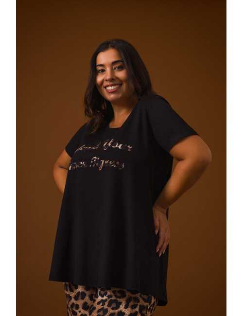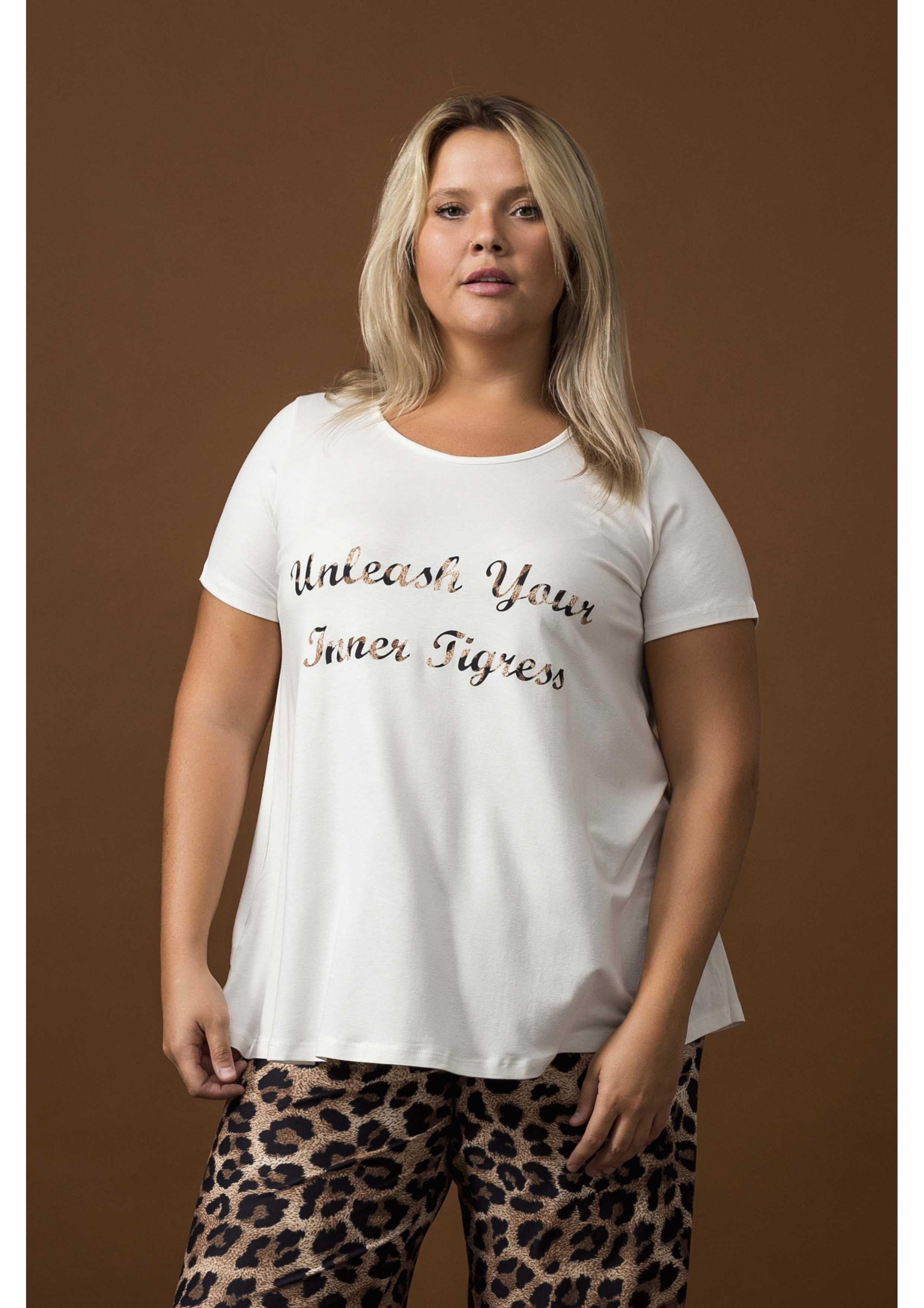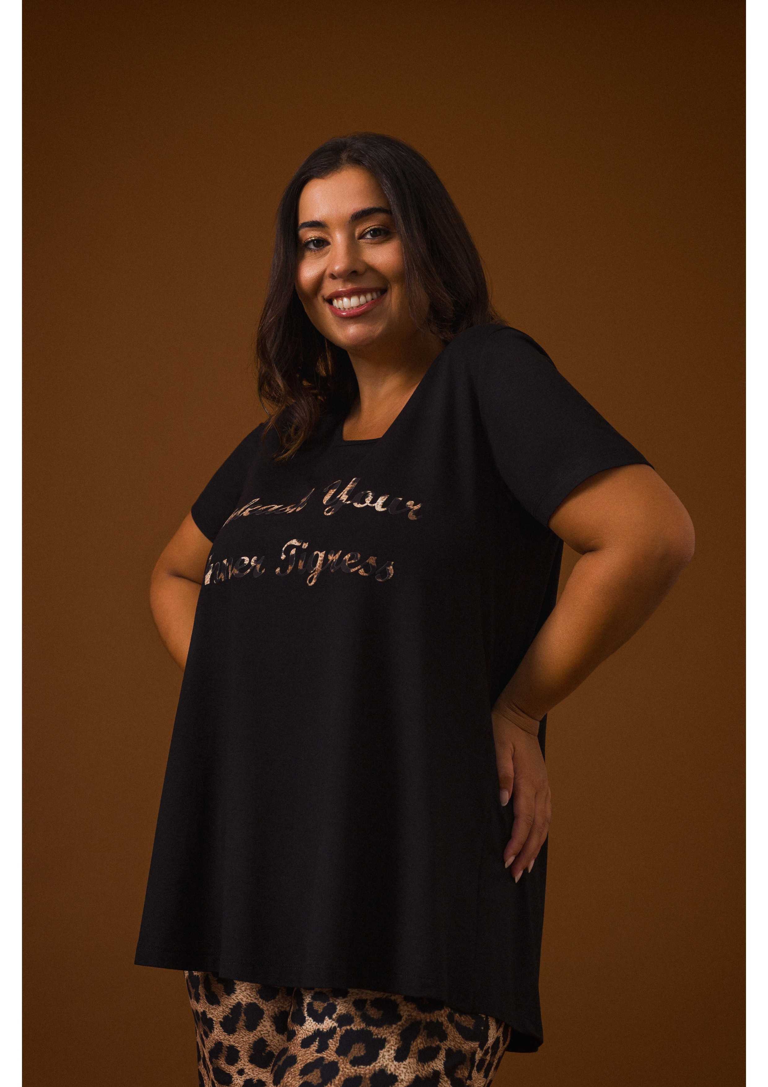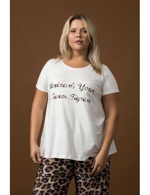 Tunique en maille lisse, application "Libérez votre tigresse intérieure", manches courtes. Modèle évasé.