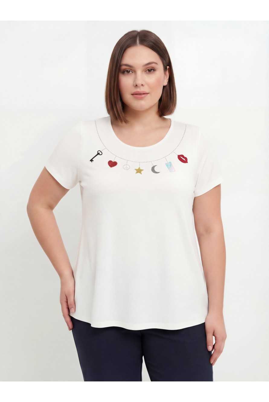 Tunique en maille unie, motif au col devant, manches courtes. Modèle évasé. Collection : Automne Hiver Modèle : Taille 1.70m et porte la taille 2XL. |