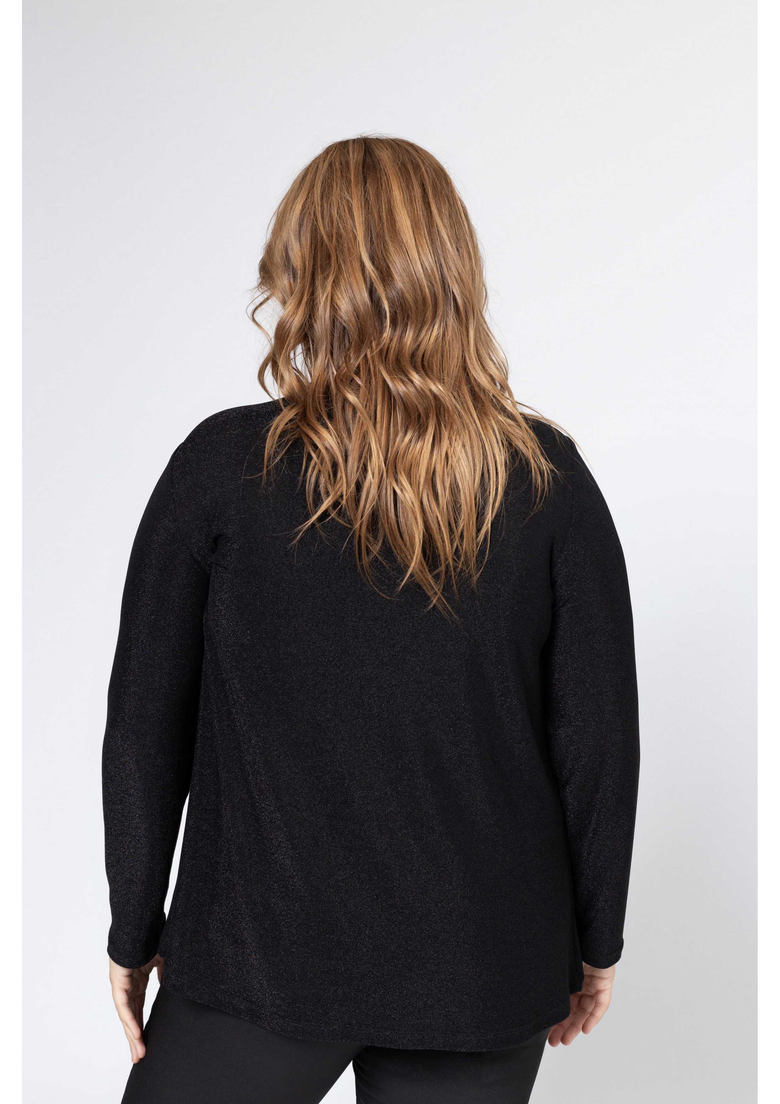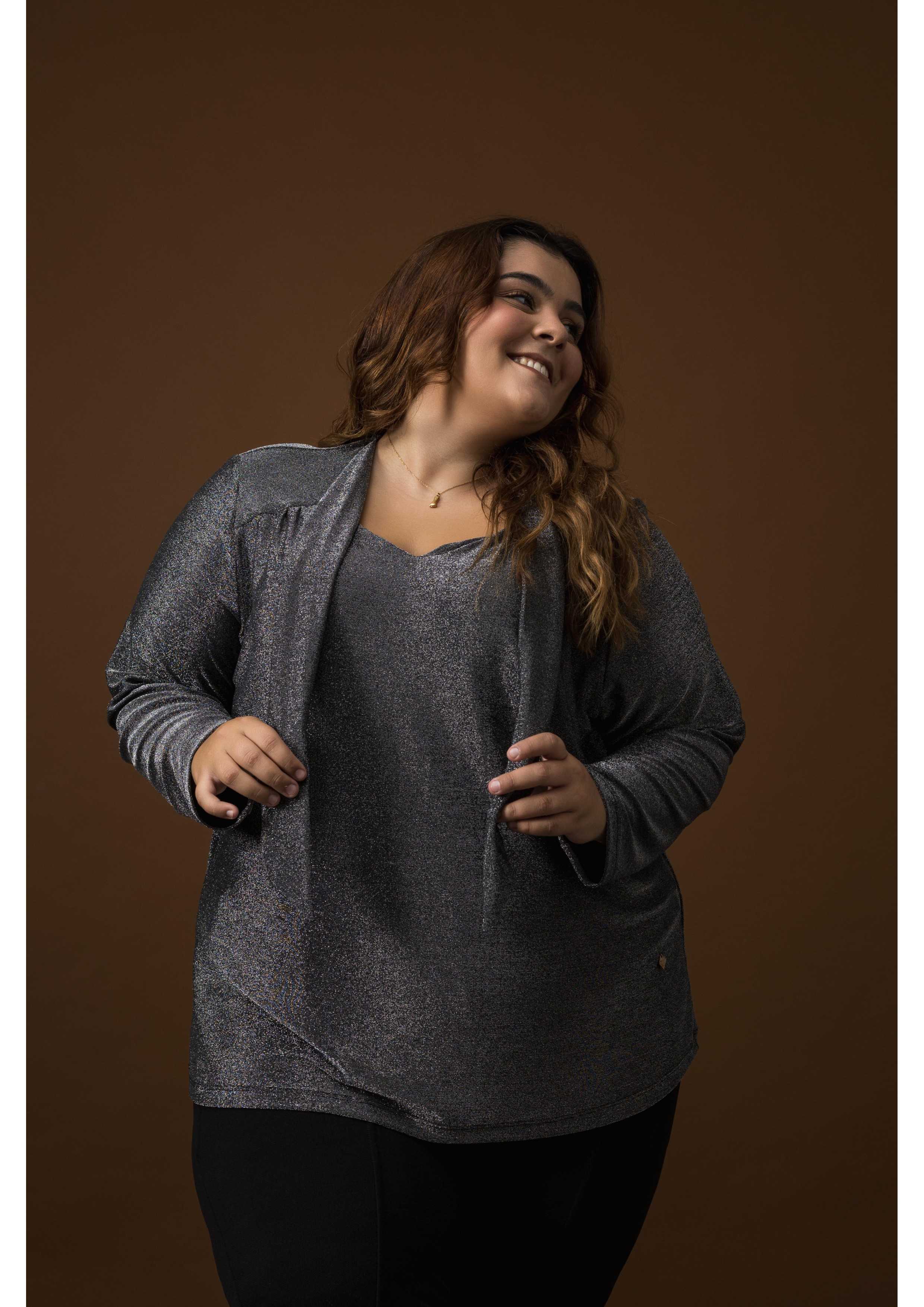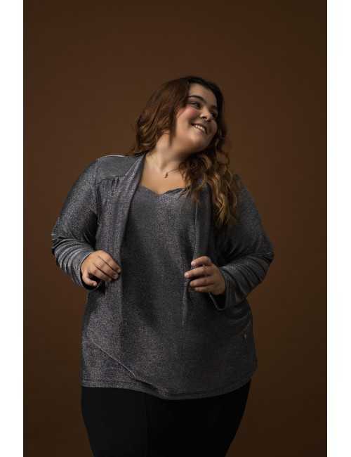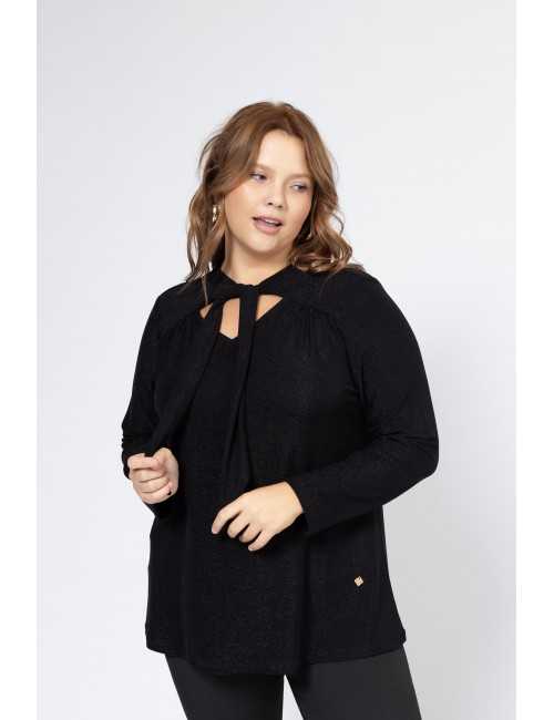 Tunique en maille unie, avec fil lurex. manches longues, décolleté en V avec un nœud serré, fronce sur les épaules tombantes, modèle légèrement évasé. Collection : Automne Hiver Disponible en Grandes Tailles Produit de conception et de fabrication propres. Nous sommes une marque de confection de vêtements avec plus de 50 ans d'expérience Modèle : Taille 1,67 m et porte la taille G, en couleur argenté. Modèle : Taille 1,70 m et porte la taille 2XL, en couleur noir. Composition : 56% Nylon 39% Lurex 5% Élasthanne