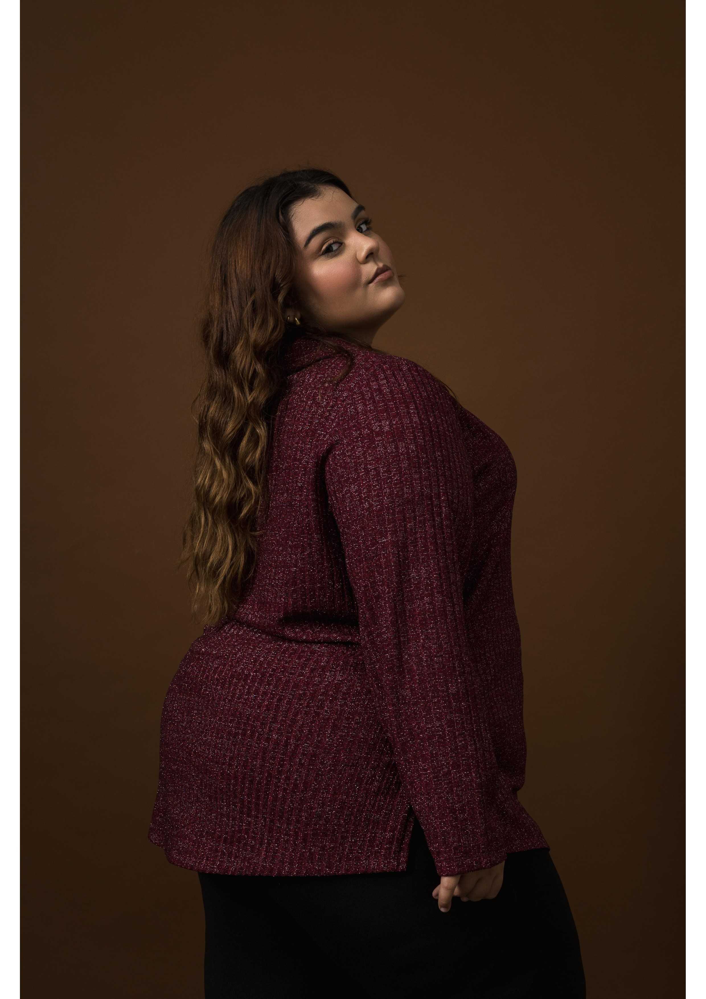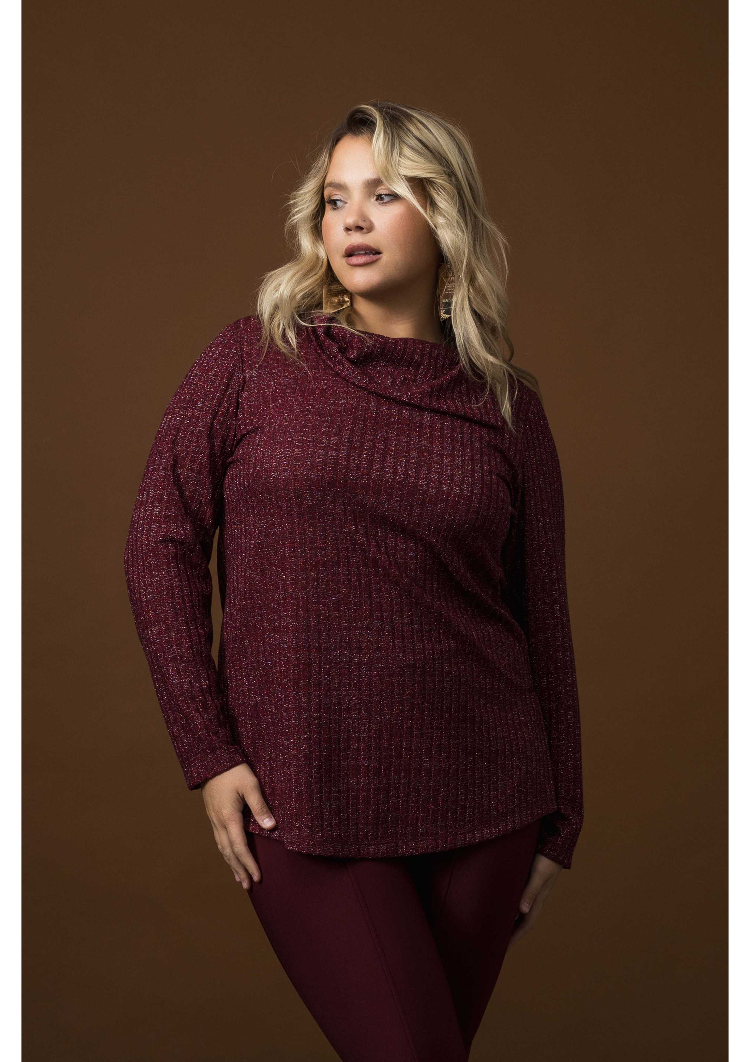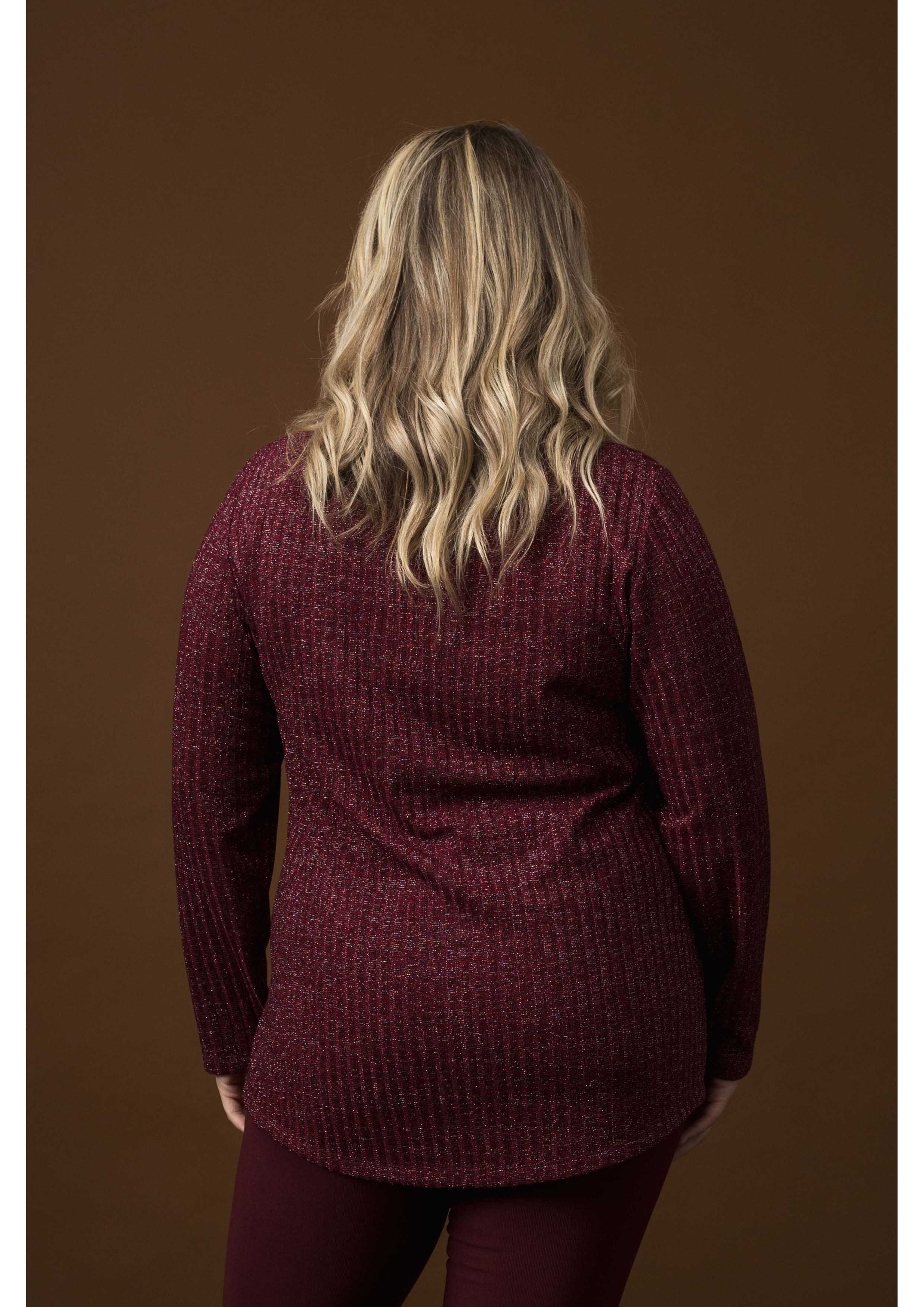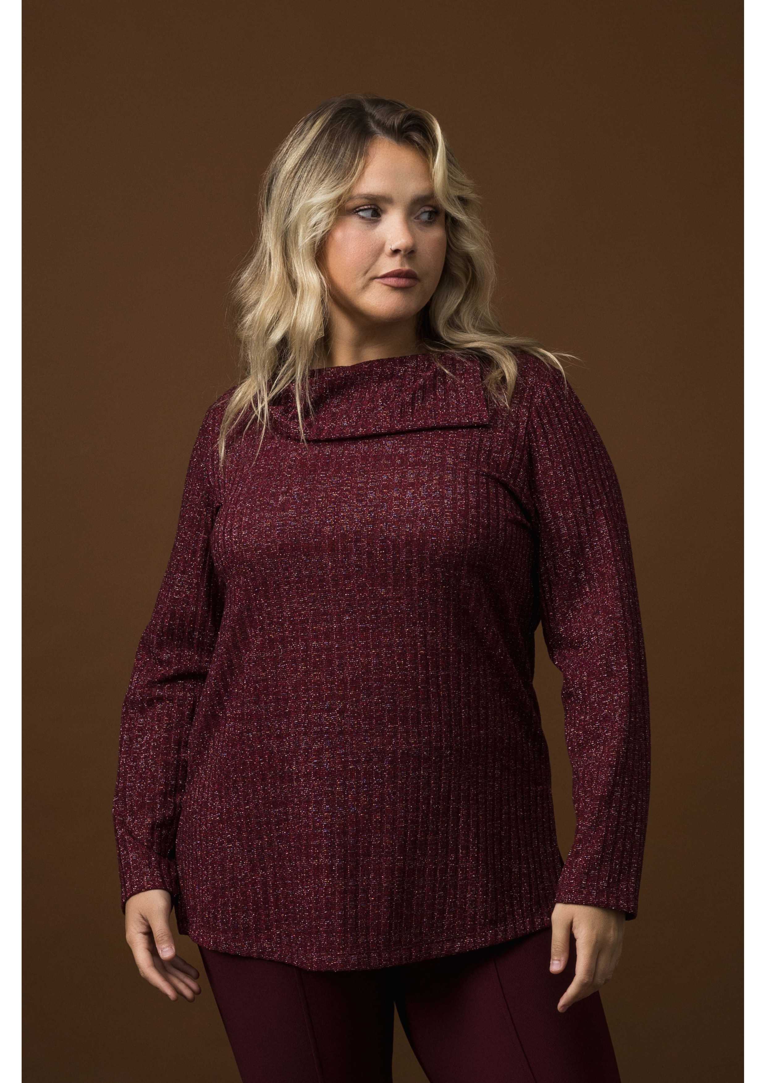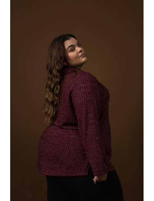 Tunique en maille côtelée avec fil lurex, manches longues, fentes latérales, col haut large avec ouverture latérale. Collection : Automne Hiver Modèle : Taille 1,70 m et porte la taille 2XL, en couleur bordeaux, jaune et noir. Modèle : Taille 1,67 m et porte la taille G, en couleur bordeaux.