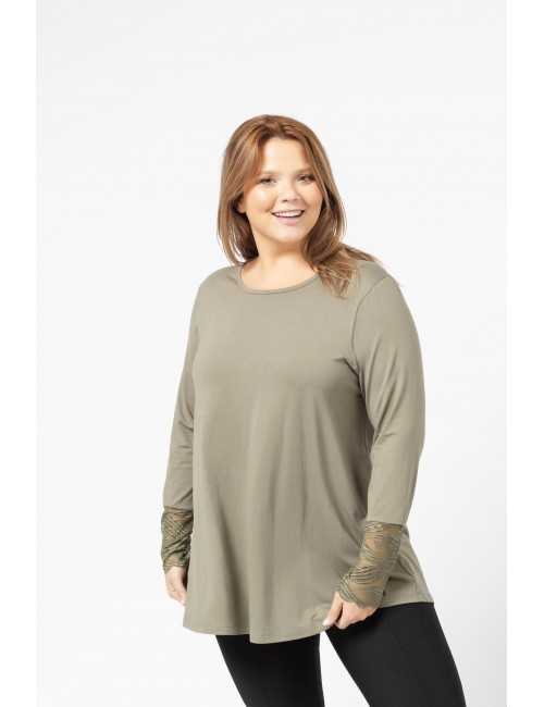 Tunique en maille lisse, modèle évasé, manches longues avec dentelle aux poignets. Encolure ronde. Collection : Automne Hiver Modèle : Taille 1,70 m et porte la taille 2XL.