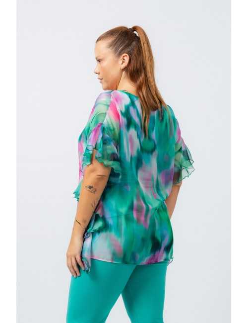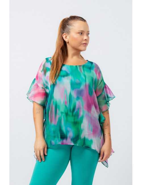 Tunique en tissu imprimé, fin, pièce doublée, volants sur les côtés, avec finitions en biais col rond. Collection : Printemps Été Modèle : Taille 1,70 m et porte la taille XL.