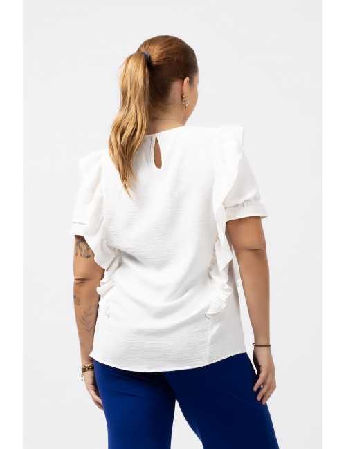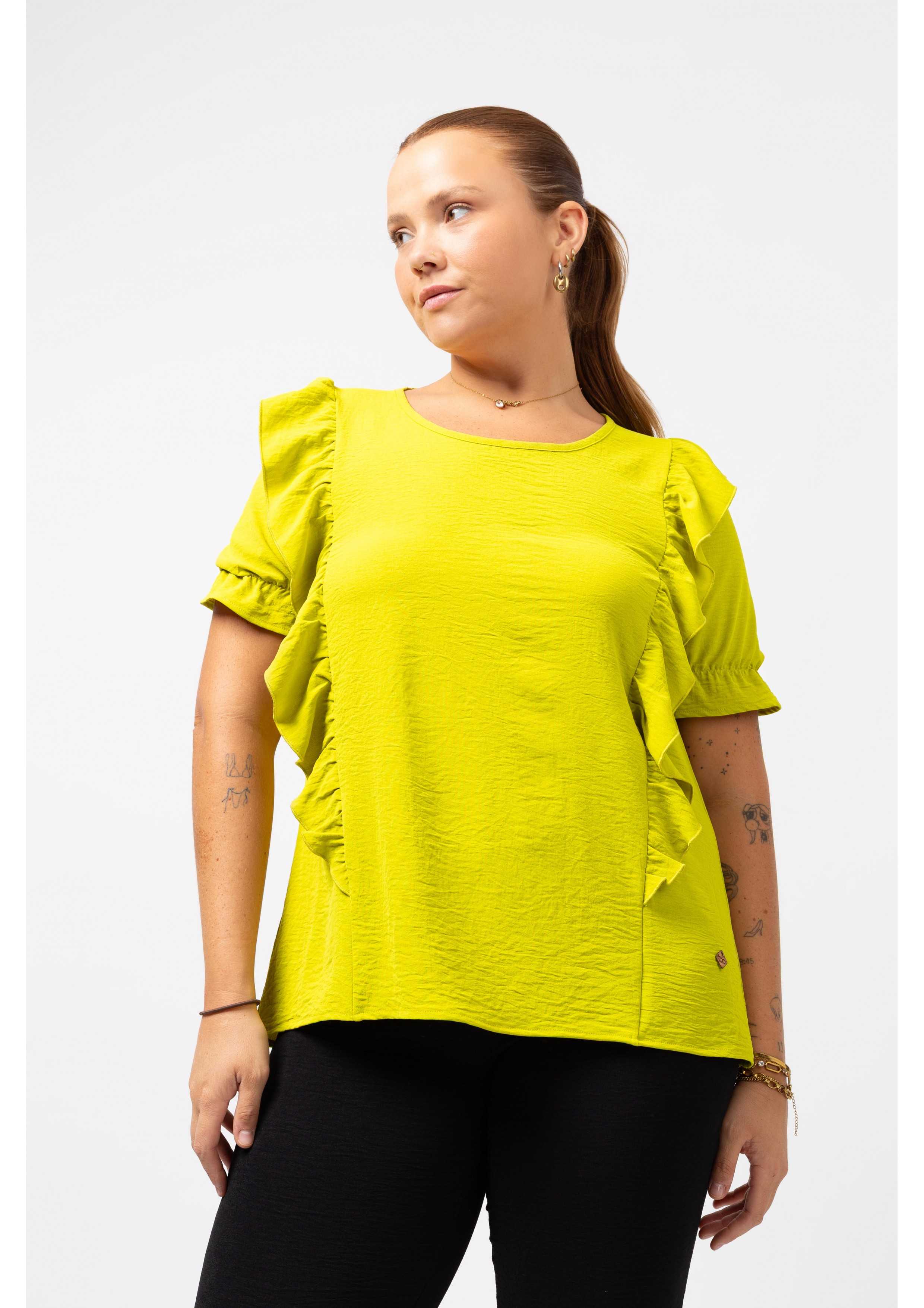 Tunique en tissu uni, décolleté rond avec une larme fermée dans le dos. Volants devant et dos avec finition roulée. Manches courtes avec élastique pour créer un vol. Collection : Printemps Été Disponible en Grandes Tailles Produit de conception et de fabrication propres. Nous sommes une marque de confection de vêtements avec plus de 50 ans d'expérience Modèle : Taille 1,70 m et porte la taille XL. Composition : 100 % Polyester