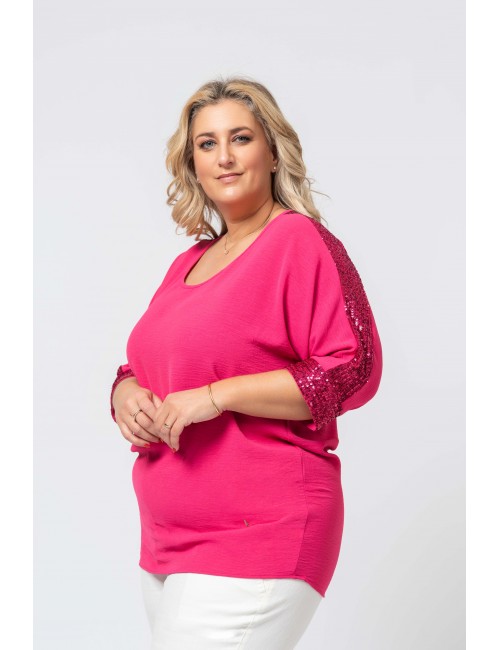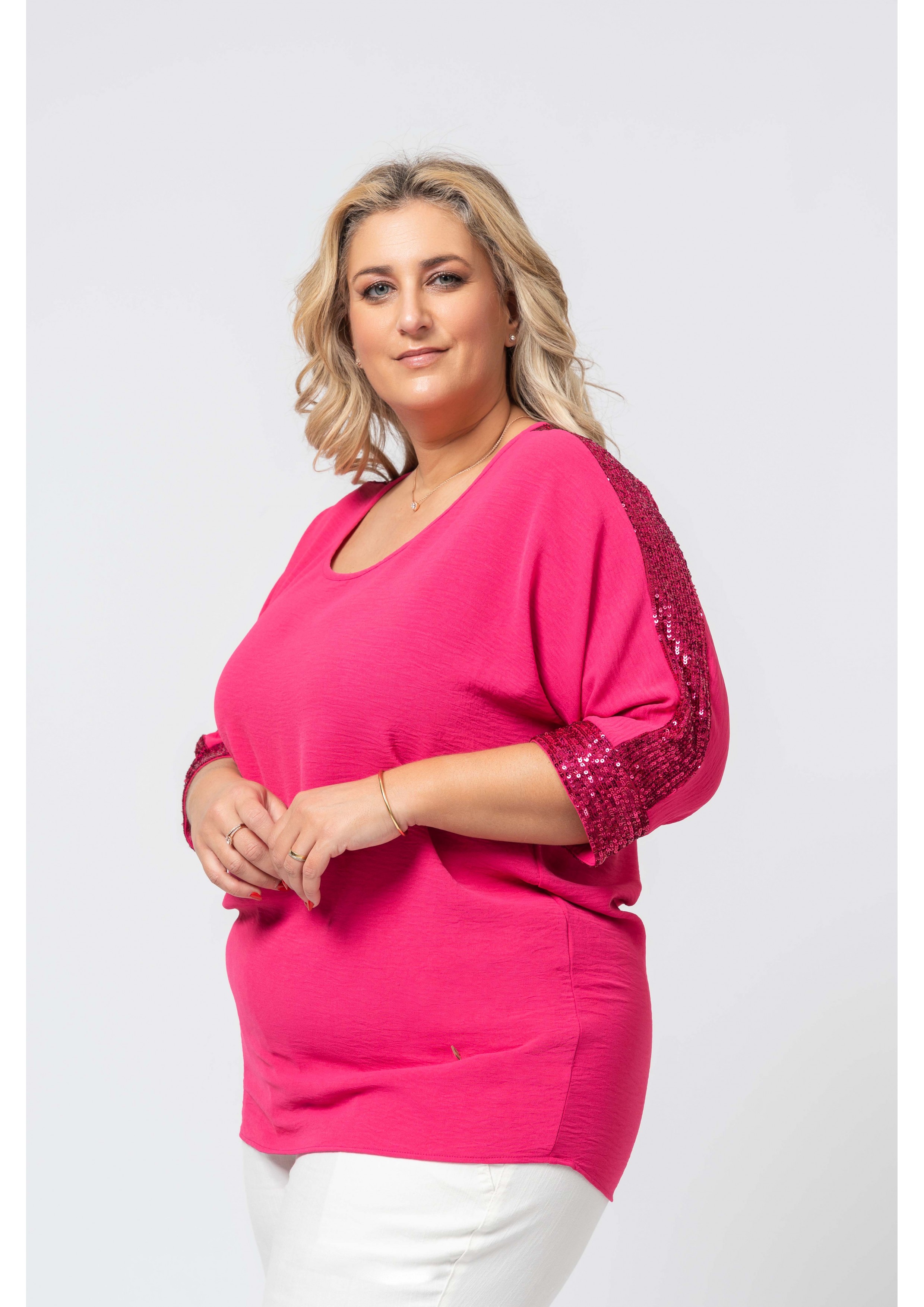 Tunique en tissu avec manches chauve-souris et paillettes, décolleté rond. Collection : Printemps Été Modèle : Taille 1,65 m et porte la taille 3XL. | 93% Polyester 7% Élasthanne