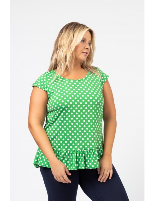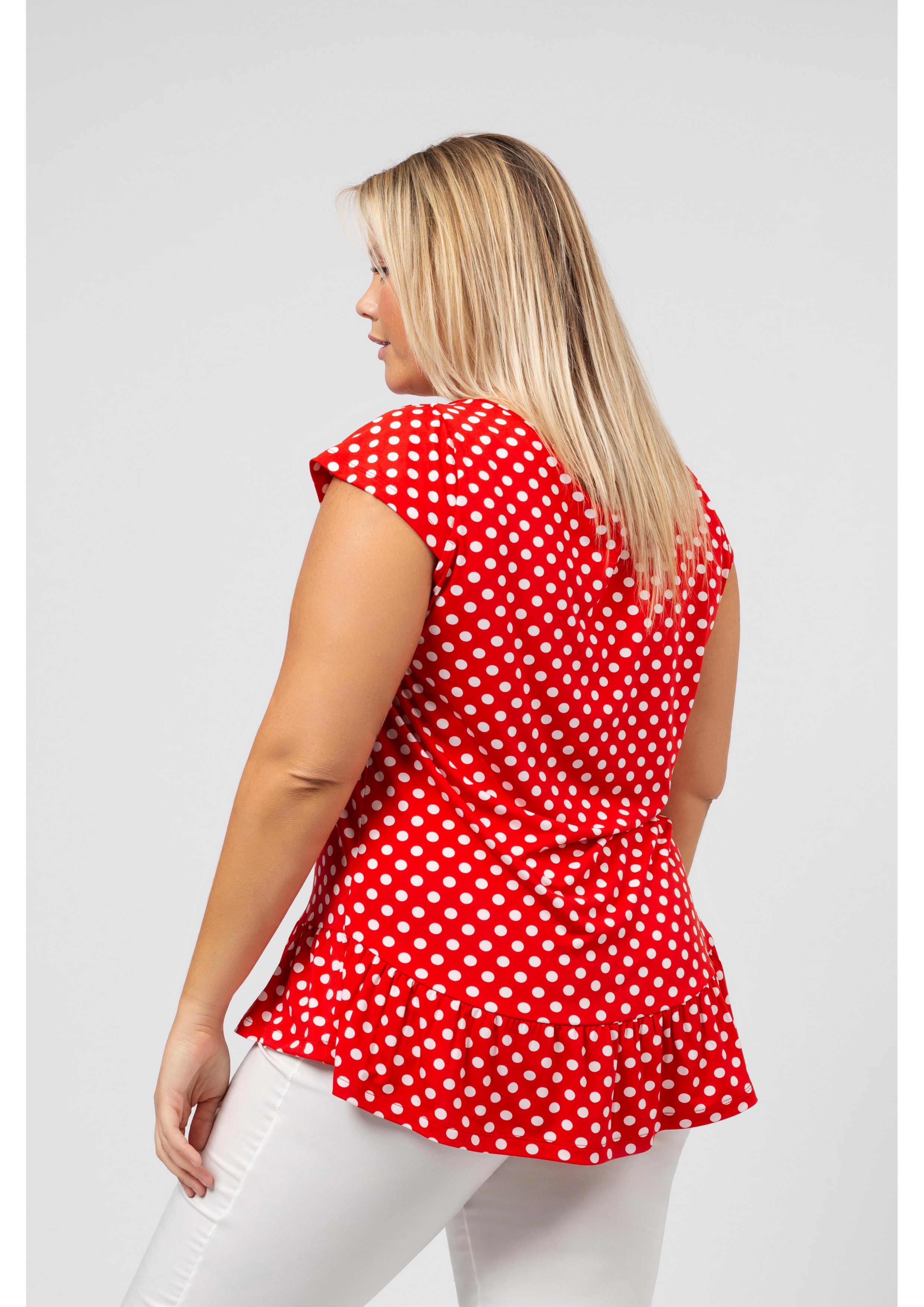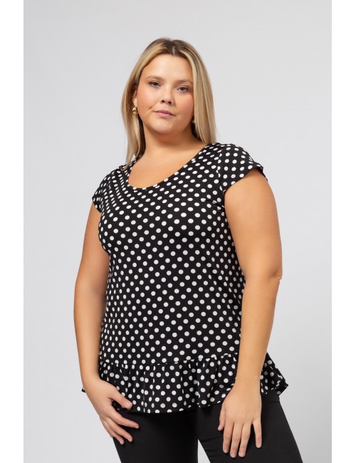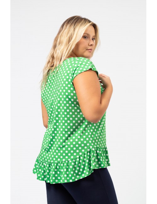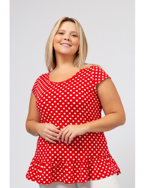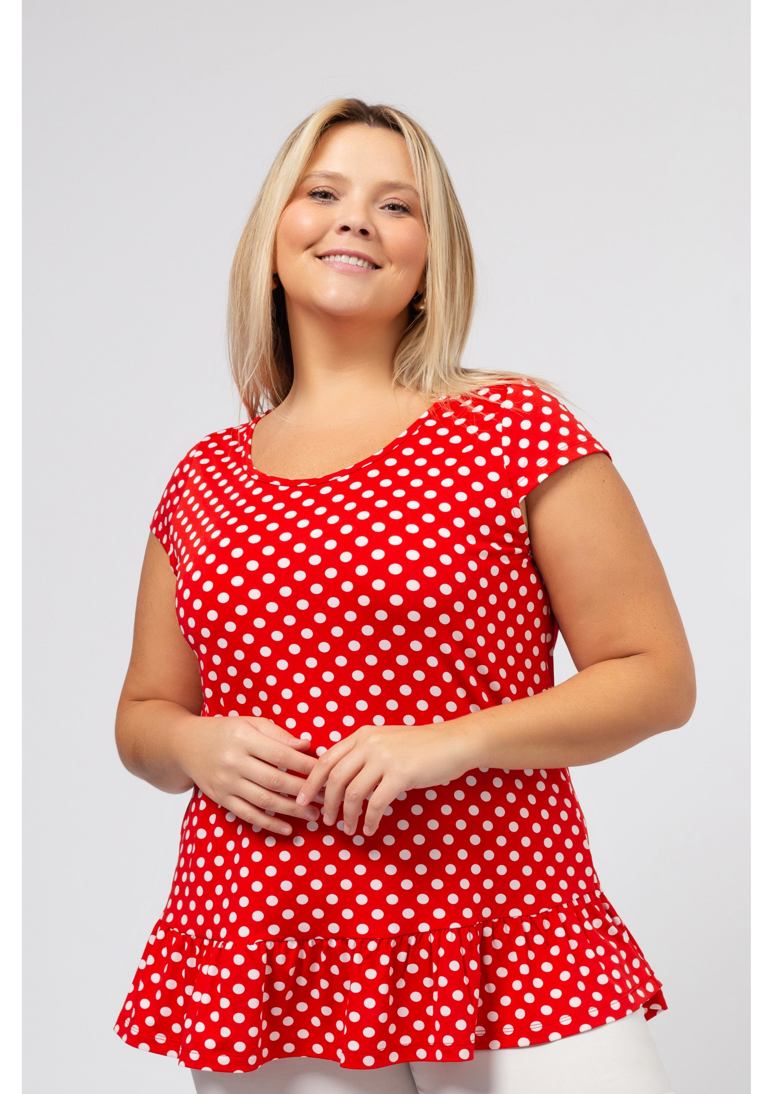 Tunique en maille imprimée avec des pois et décolleté rond avec volant de base. Collection : Printemps Été Modèle : Taille 1,70 m et porte la taille 2XL, en rouge et noir et vert. Modèle : Taille 1,65 m et porte la taille 3XL, en bleu marine.