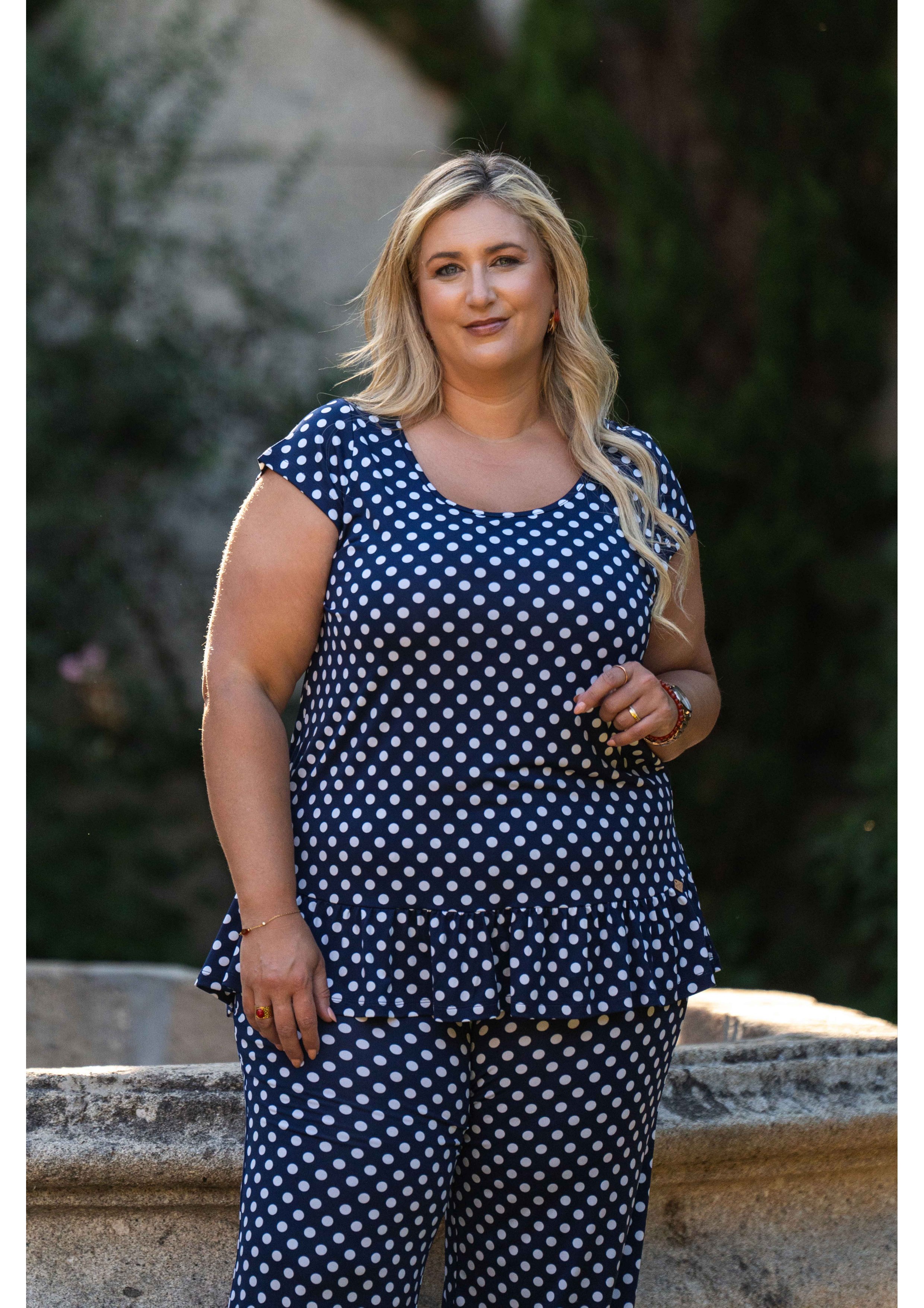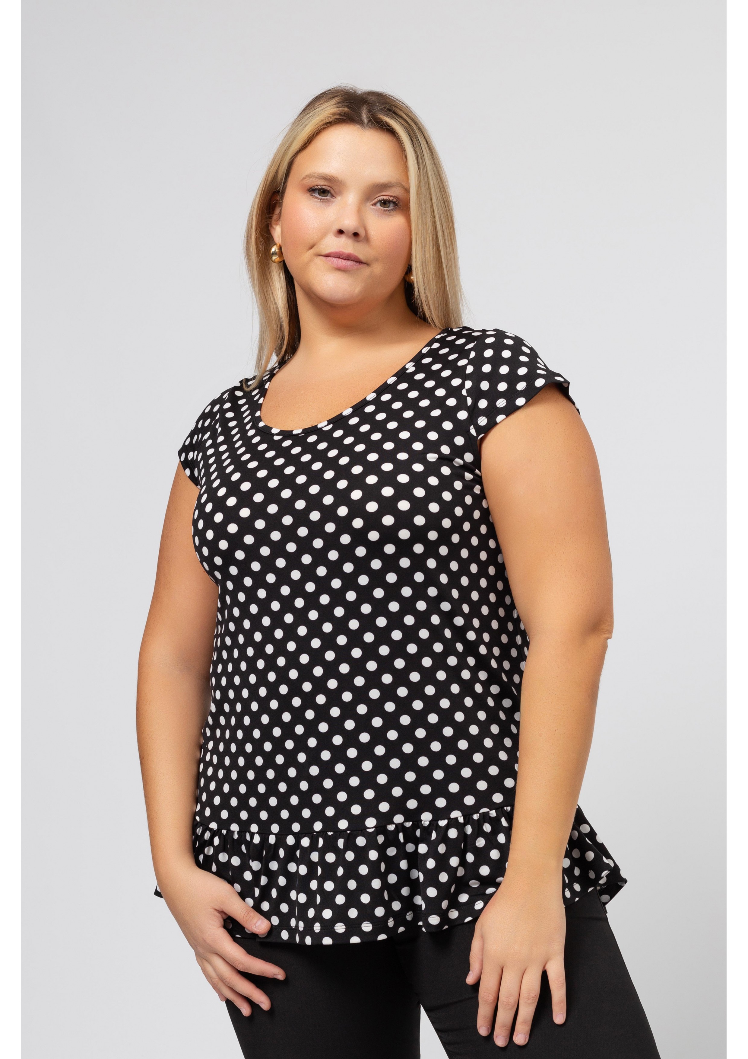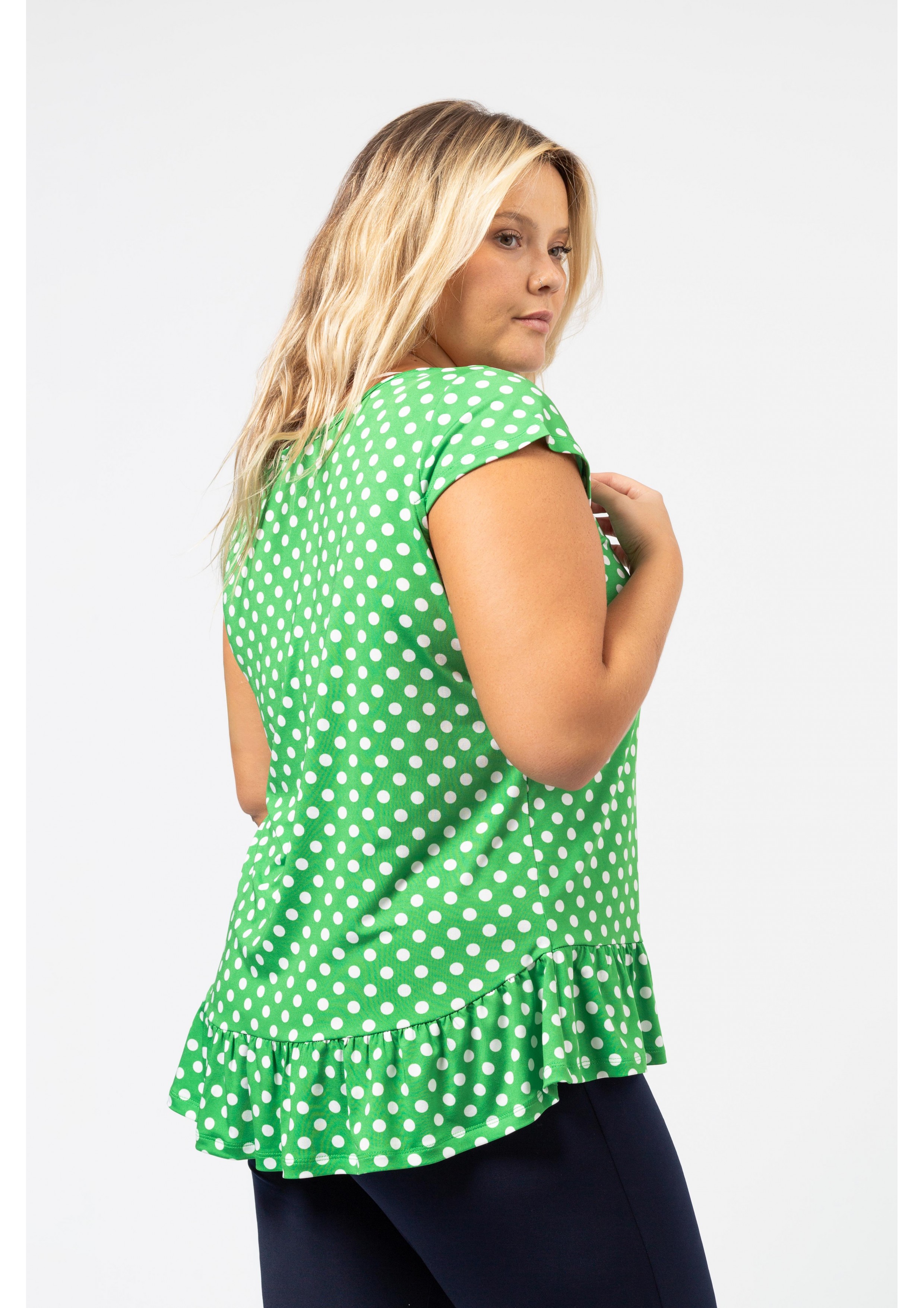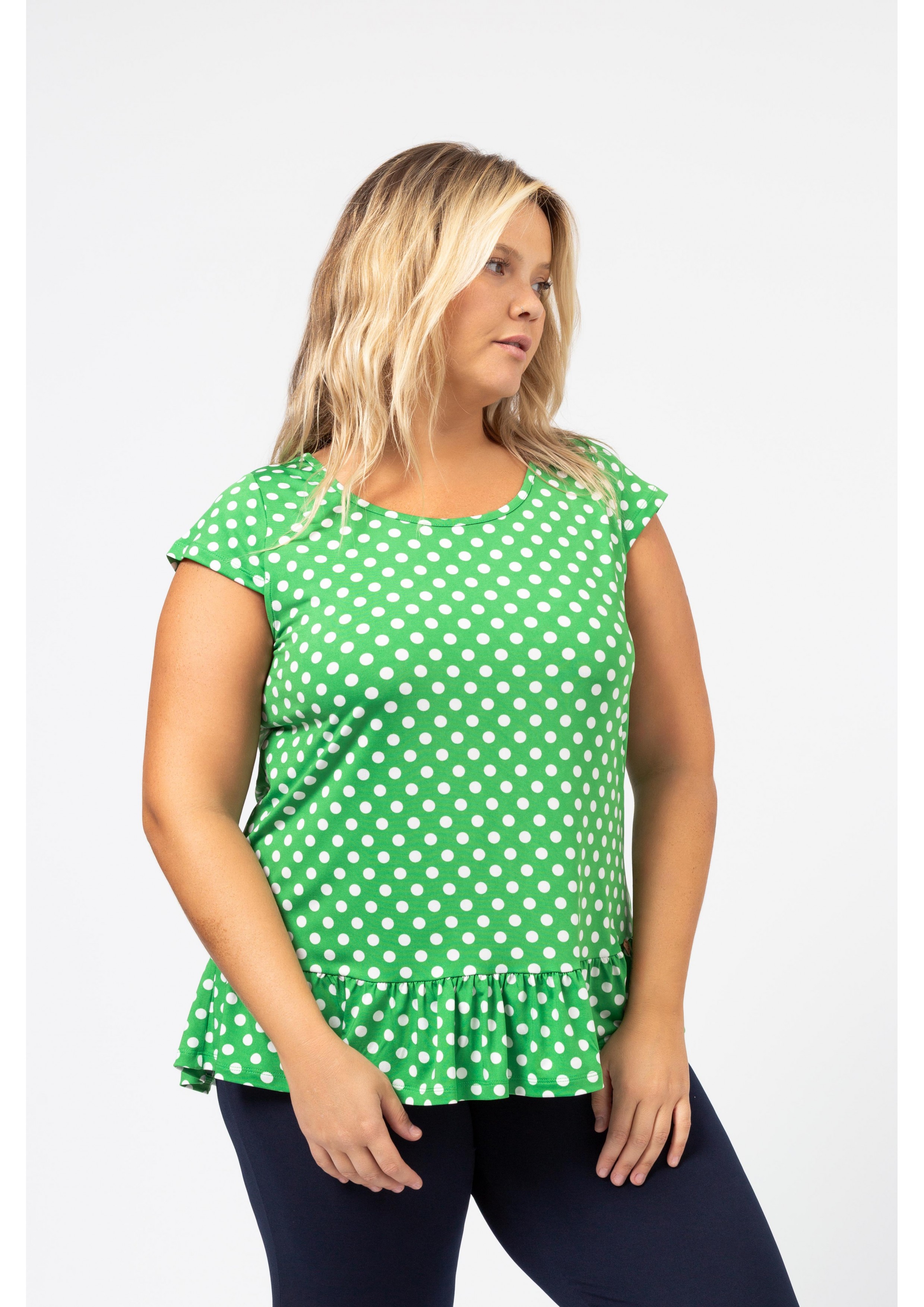 Tunique en maille imprimée avec des pois et décolleté rond avec volant de base. Collection : Printemps Été Modèle : Taille 1,70 m et porte la taille 2XL, en rouge et noir et vert. Modèle : Taille 1,65 m et porte la taille 3XL, en bleu marine.