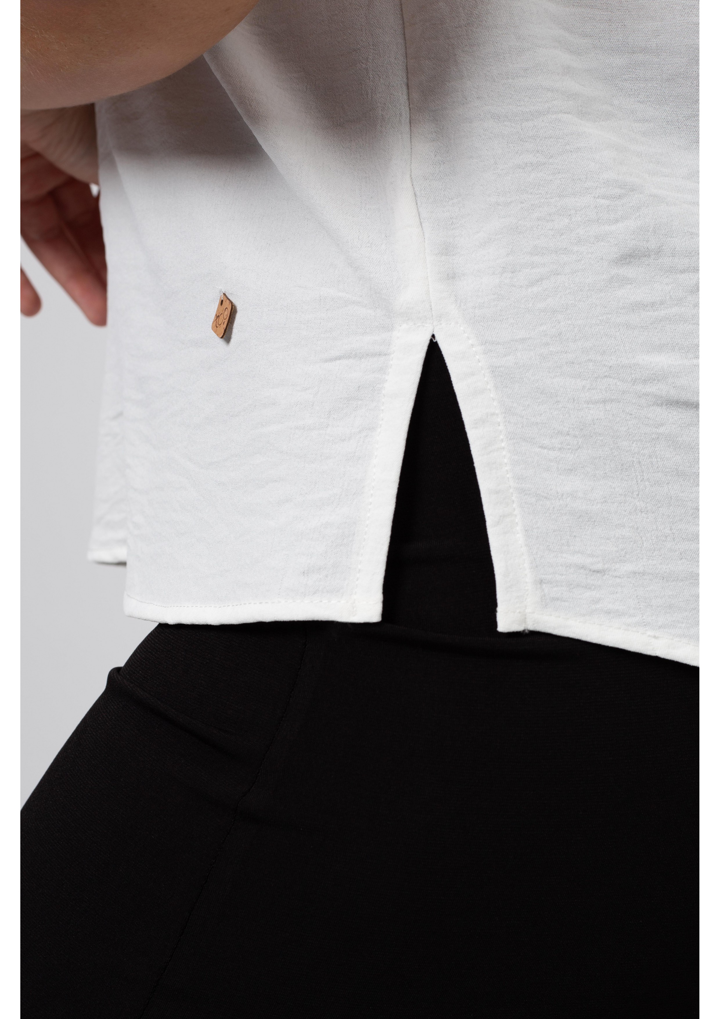 Tunique en tissu uni, décolleté en V, ruban avec œillet au décolleté. Manches chauve-souris. Fentes latérales. Collection : Printemps Été Modèle : Taille 1,70 m et porte la taille 2XL.