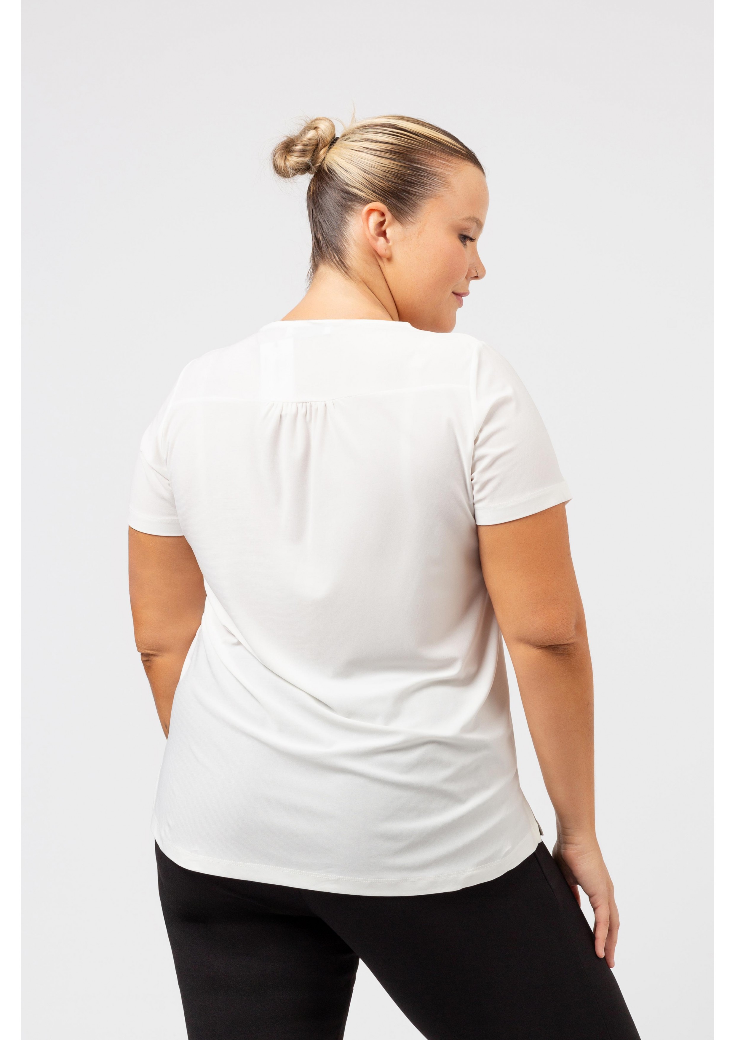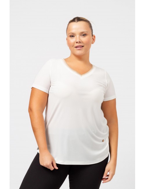 Tunique en maille unie avec décolleté en V, côtes en lurex au décolleté. Dos froncé avec fentes latérales. Collection : Printemps Été Modèle : Taille 1,70 m et porte la taille 2XL.
