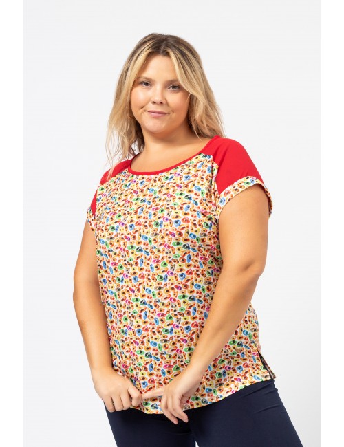 Tunique en maille imprimée, empiècement en tissu uni, décolleté rond, fentes latérales, épaules tombantes avec poignet replié. Collection : Printemps Été Disponible en Grandes Tailles Produit de conception et fabrication propre. Nous sommes une marque de confection de vêtements avec plus de 50 ans d'expérience. Modèle : Taille 1.70m et porte la taille 2XL. Composition : 100% Polyester | 95% Polyester 5% Élasthanne