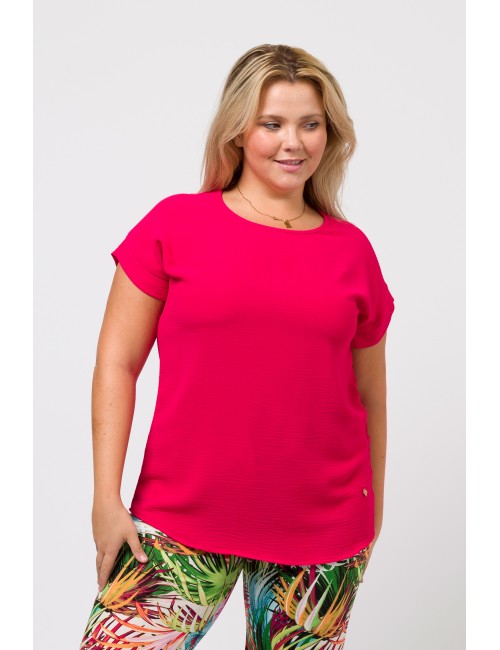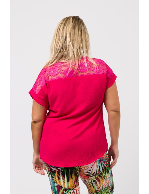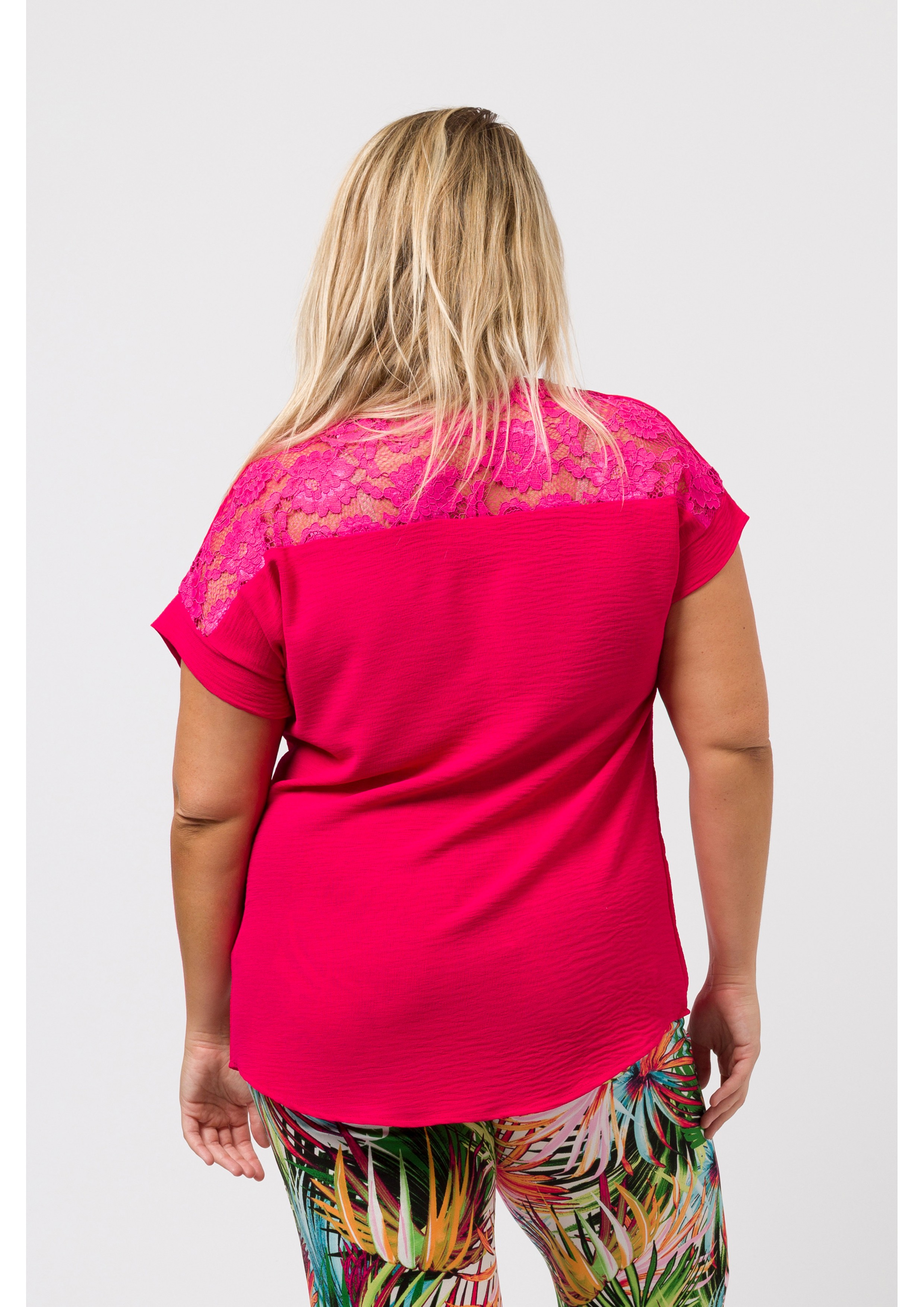 Tunique en tissu uni, avec un décolleté en dentelle rose fuchsia à l'arrière. Épaules tombantes avec des poignets. Collection : Printemps Été Modèle : Hauteur 1,70 m et porte la taille 2XL.