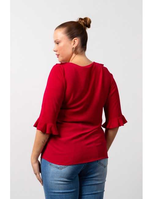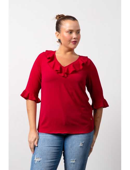 Tunique en tissu uni, décolleté en V avec volants, manches 3/4 avec volants. Finitions avec ourlet. Modèle : Taille 1.70m et porte la taille 2XL